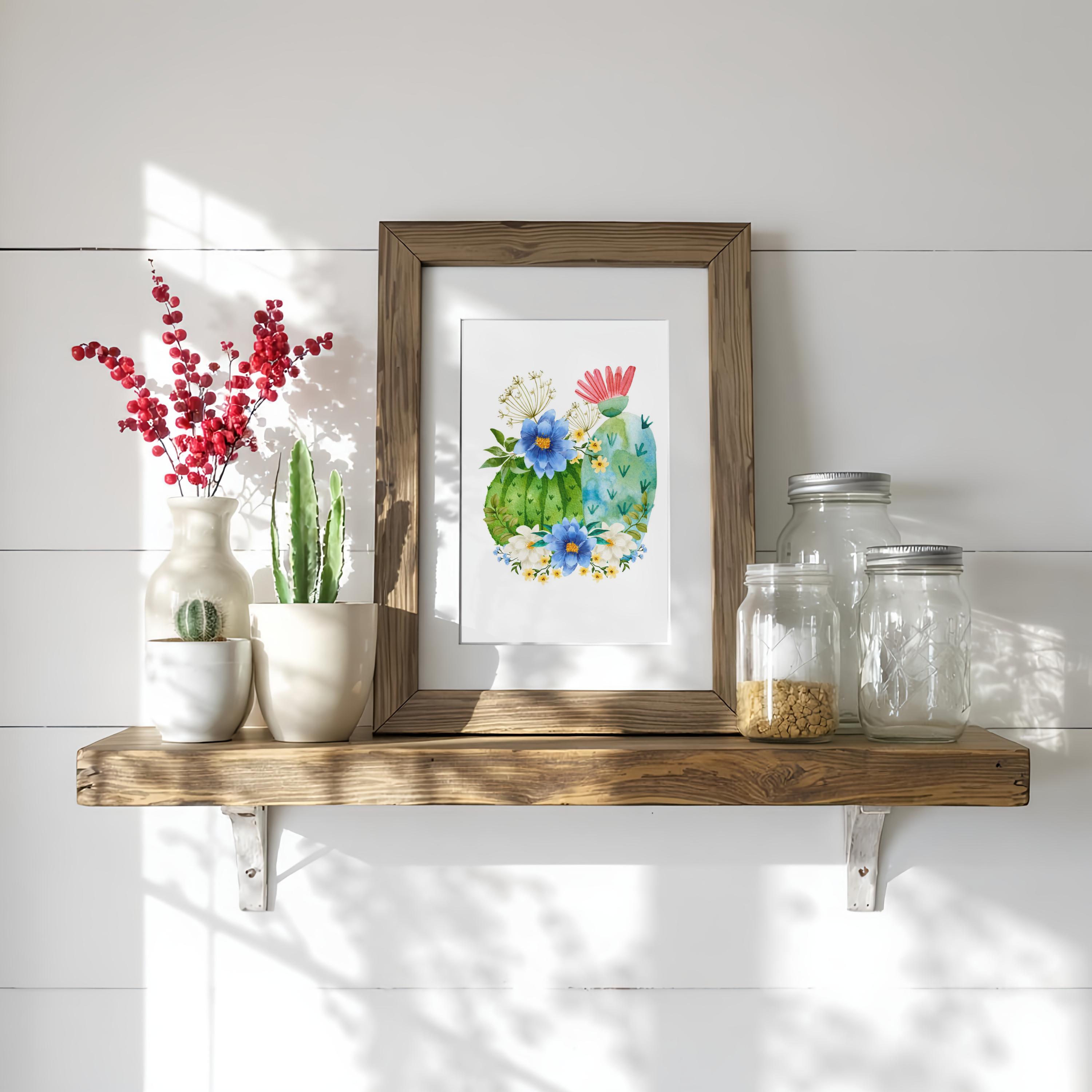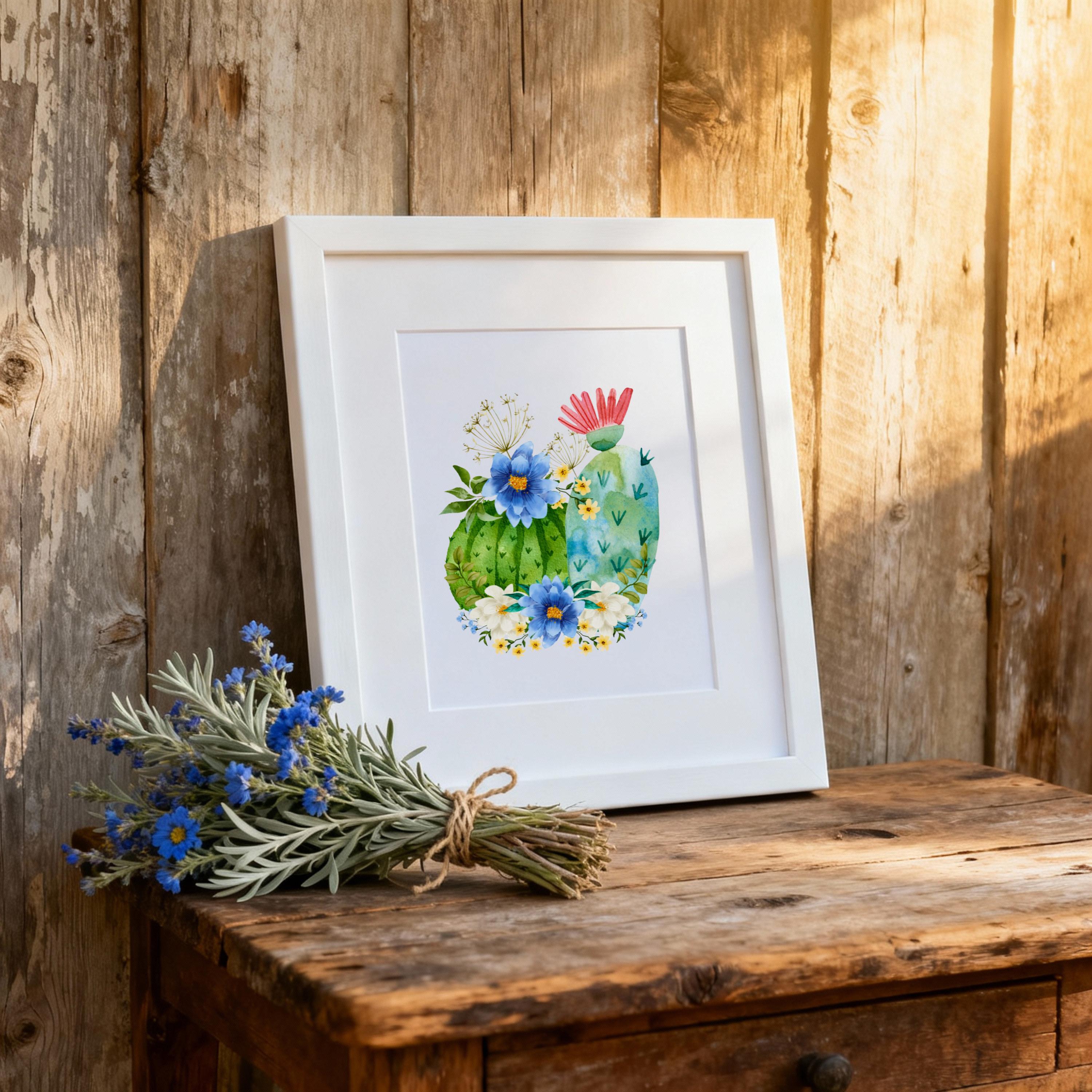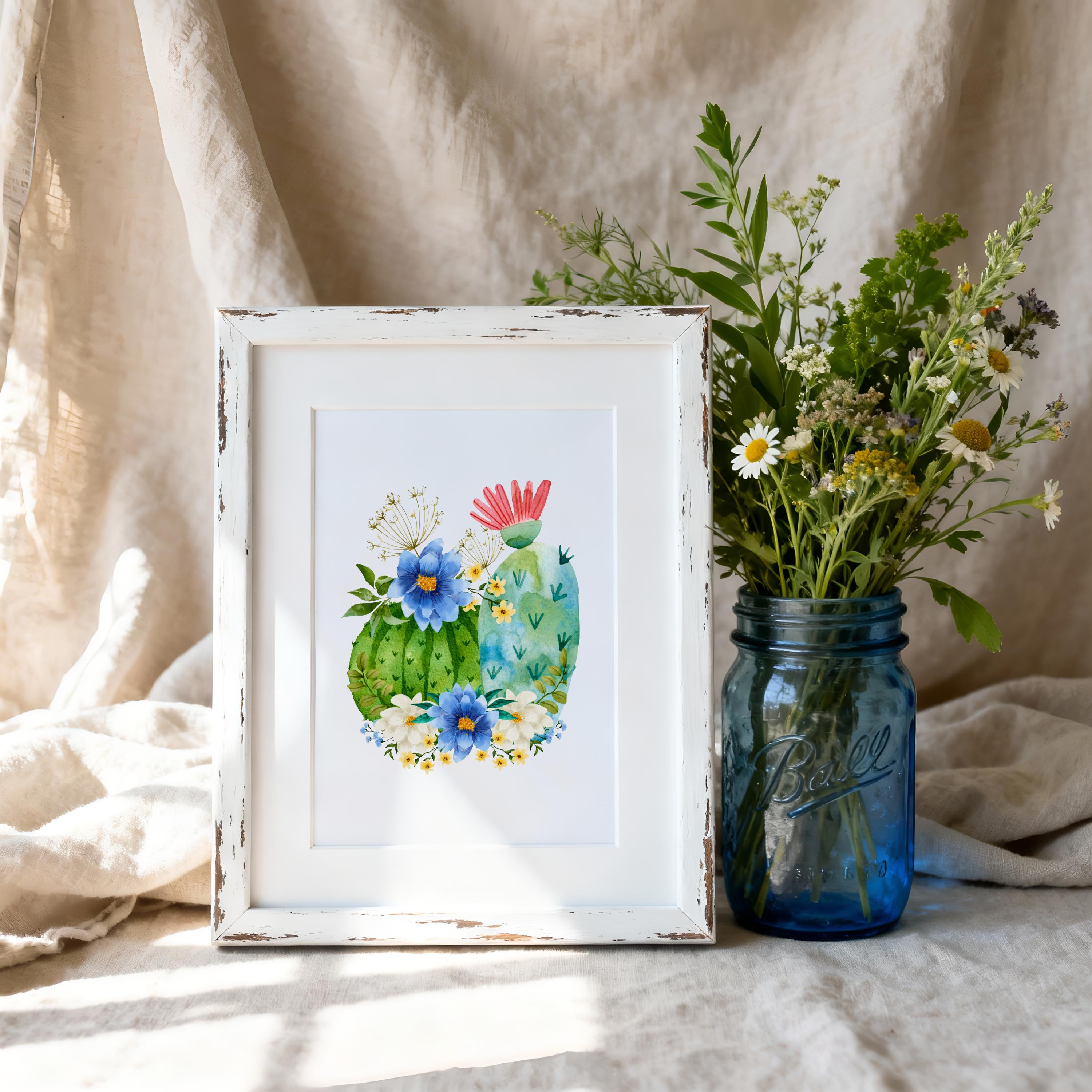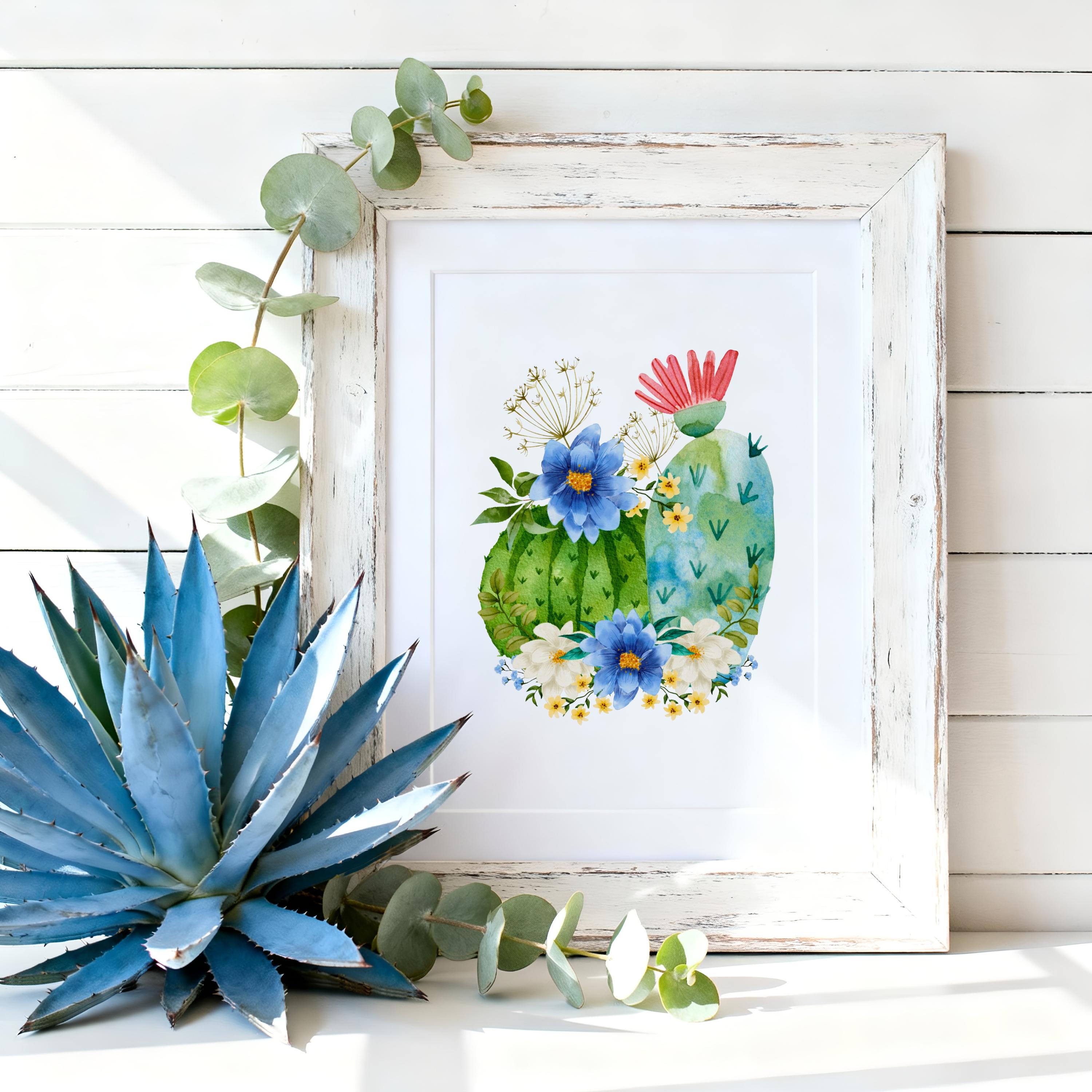 Bring a touch of the desert into your home with this watercolor-inspired barrel cactus art print. Featuring lush green cactus pads adorned with bold blue and white wildflowers and a pop of coral bloom, this piece blends the rugged beauty of the Southwest with a soft farmhouse charm.