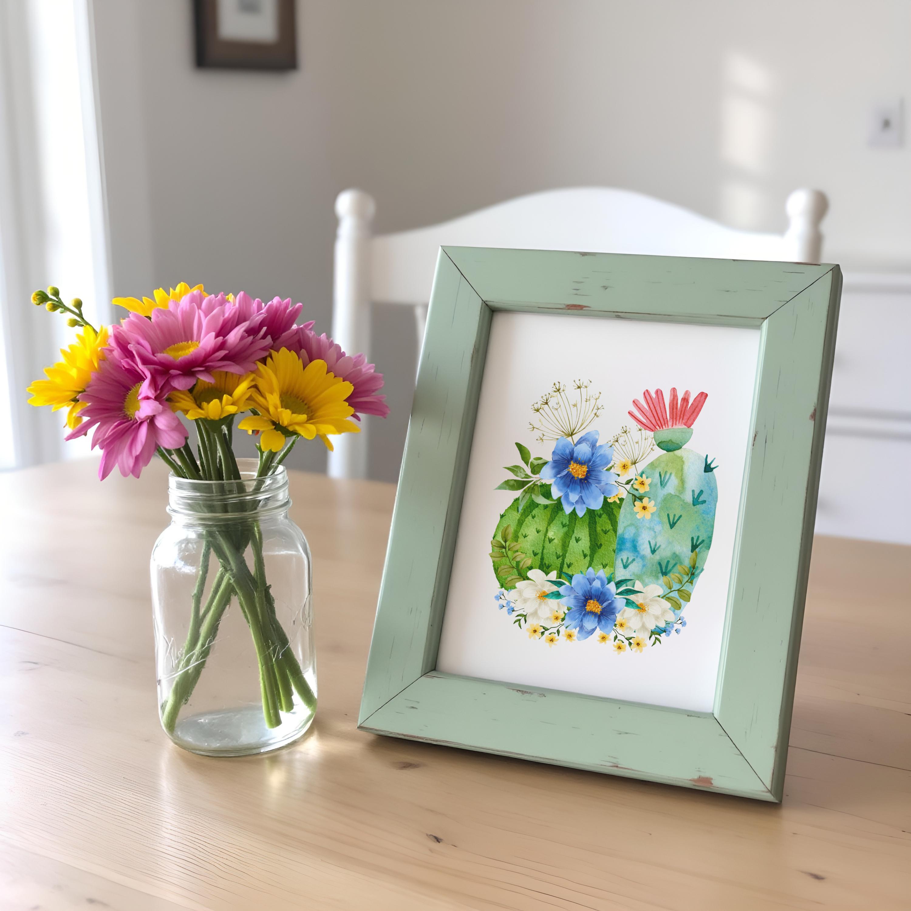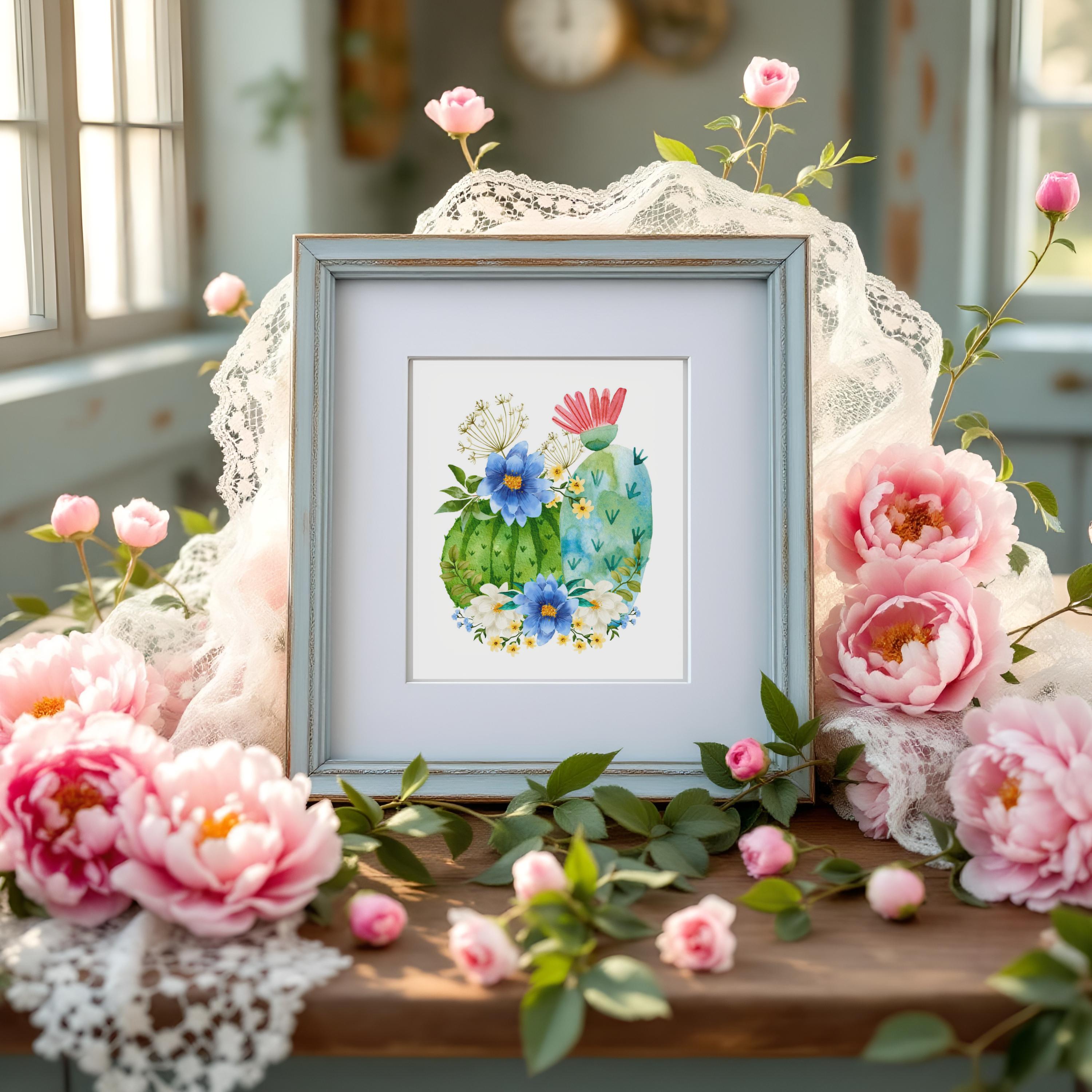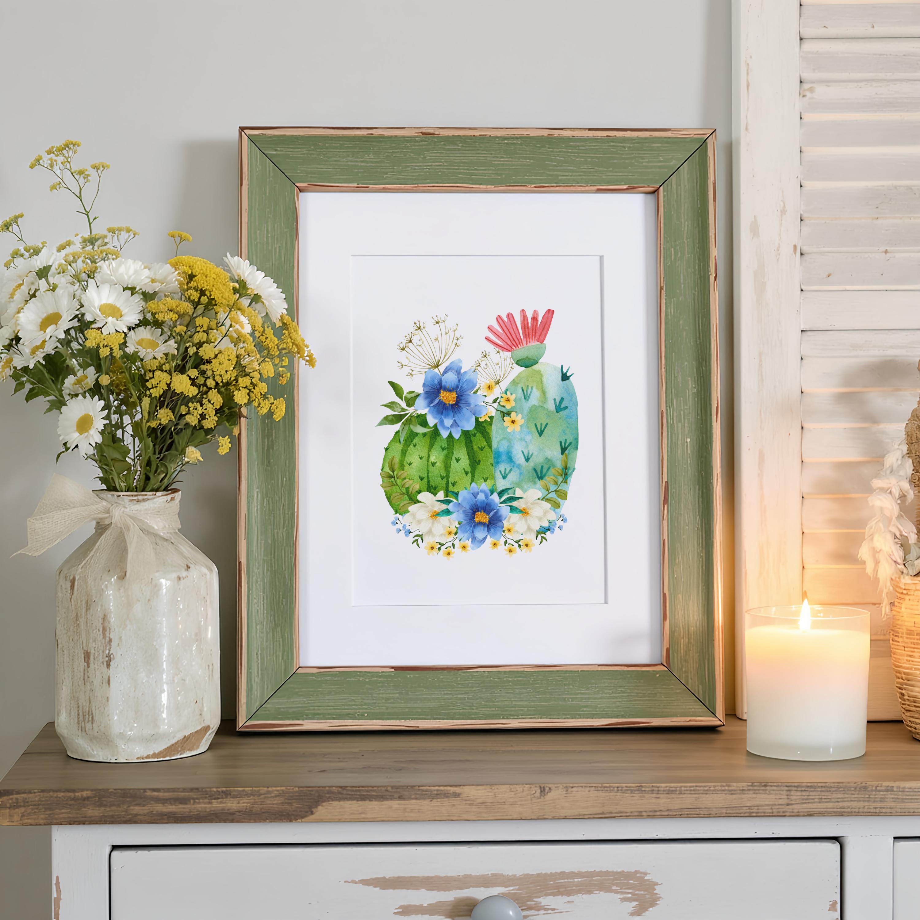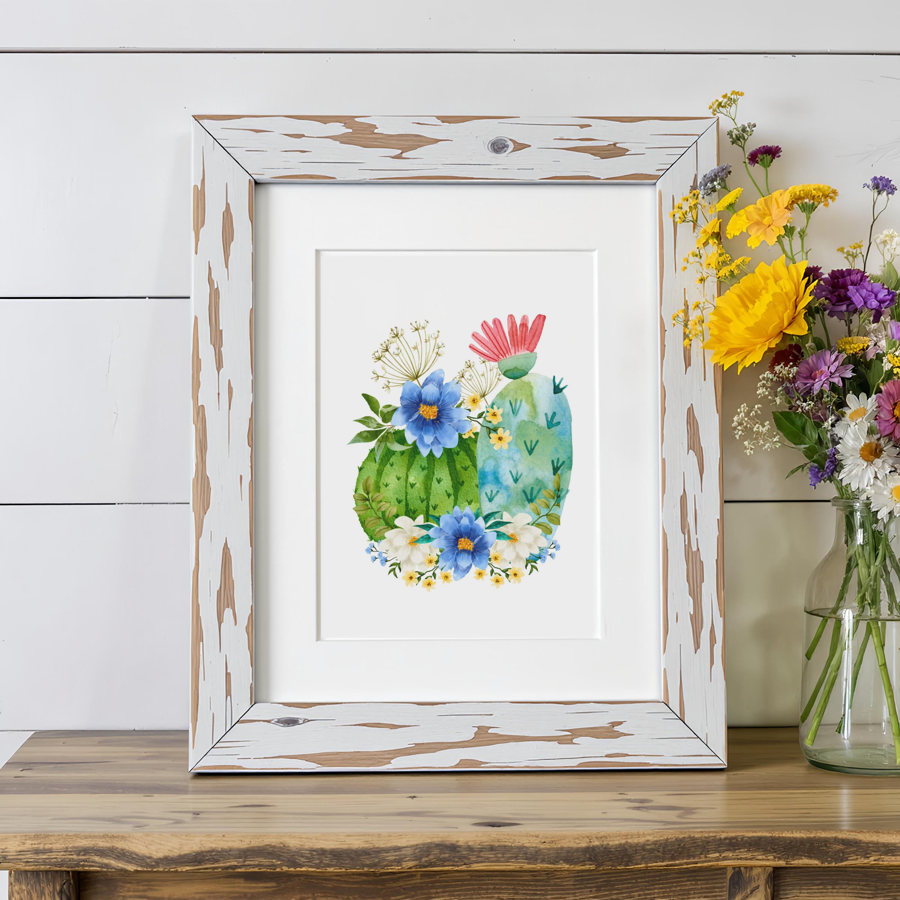 Bring a touch of the desert into your home with this watercolor-inspired barrel cactus art print. Featuring lush green cactus pads adorned with bold blue and white wildflowers and a pop of coral bloom, this piece blends the rugged beauty of the Southwest with a soft farmhouse charm.