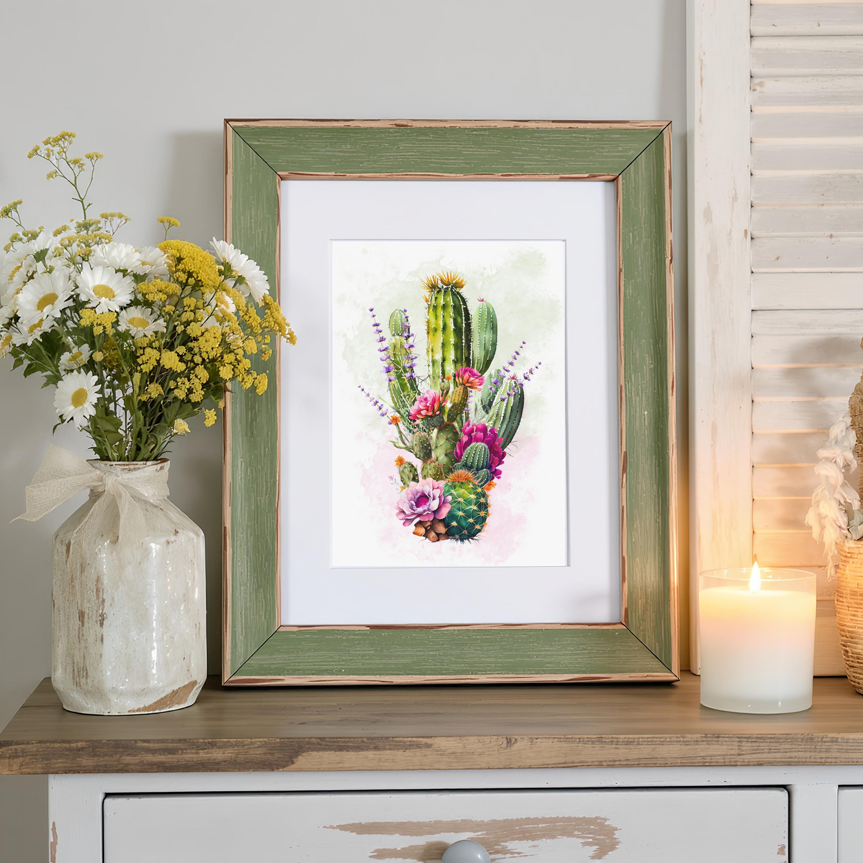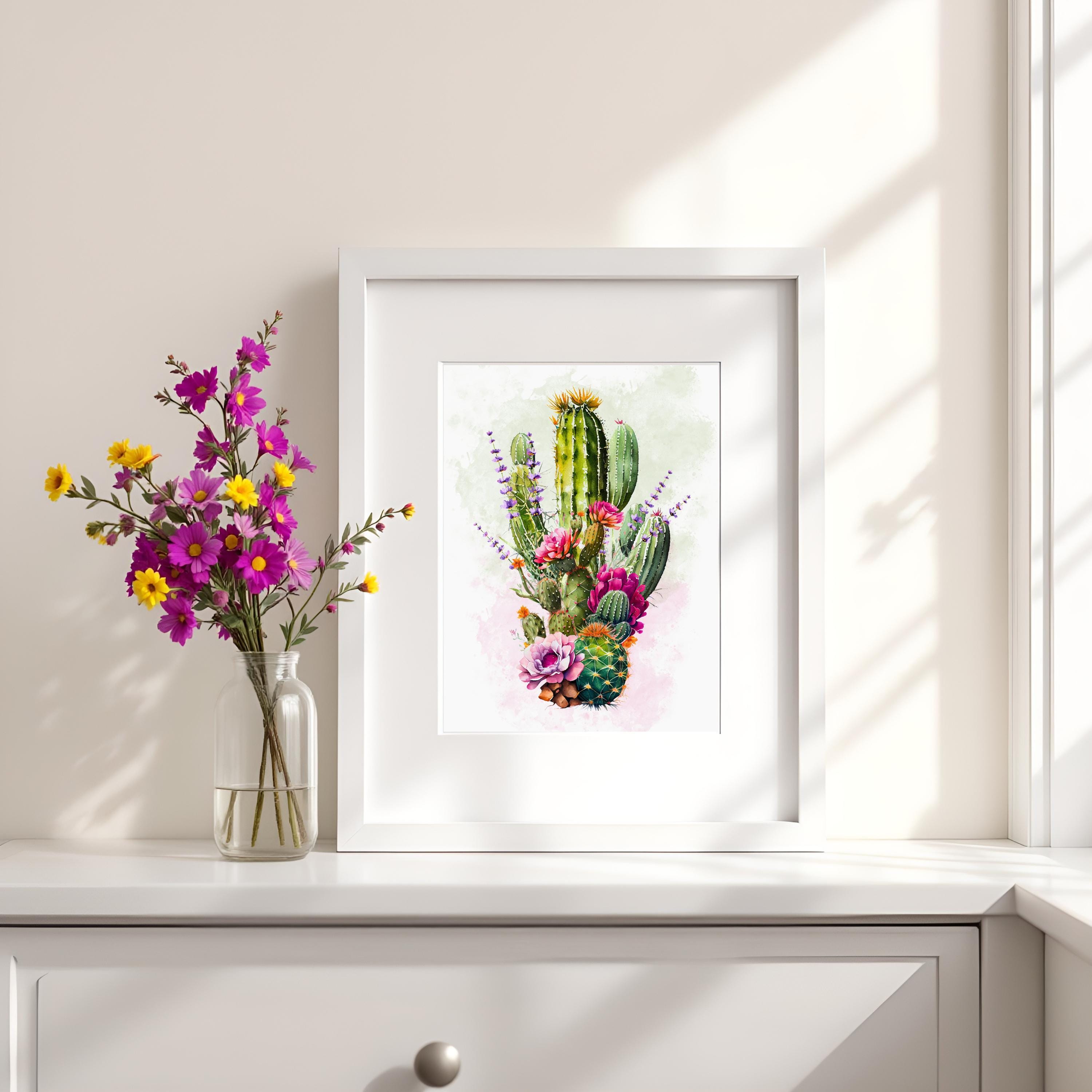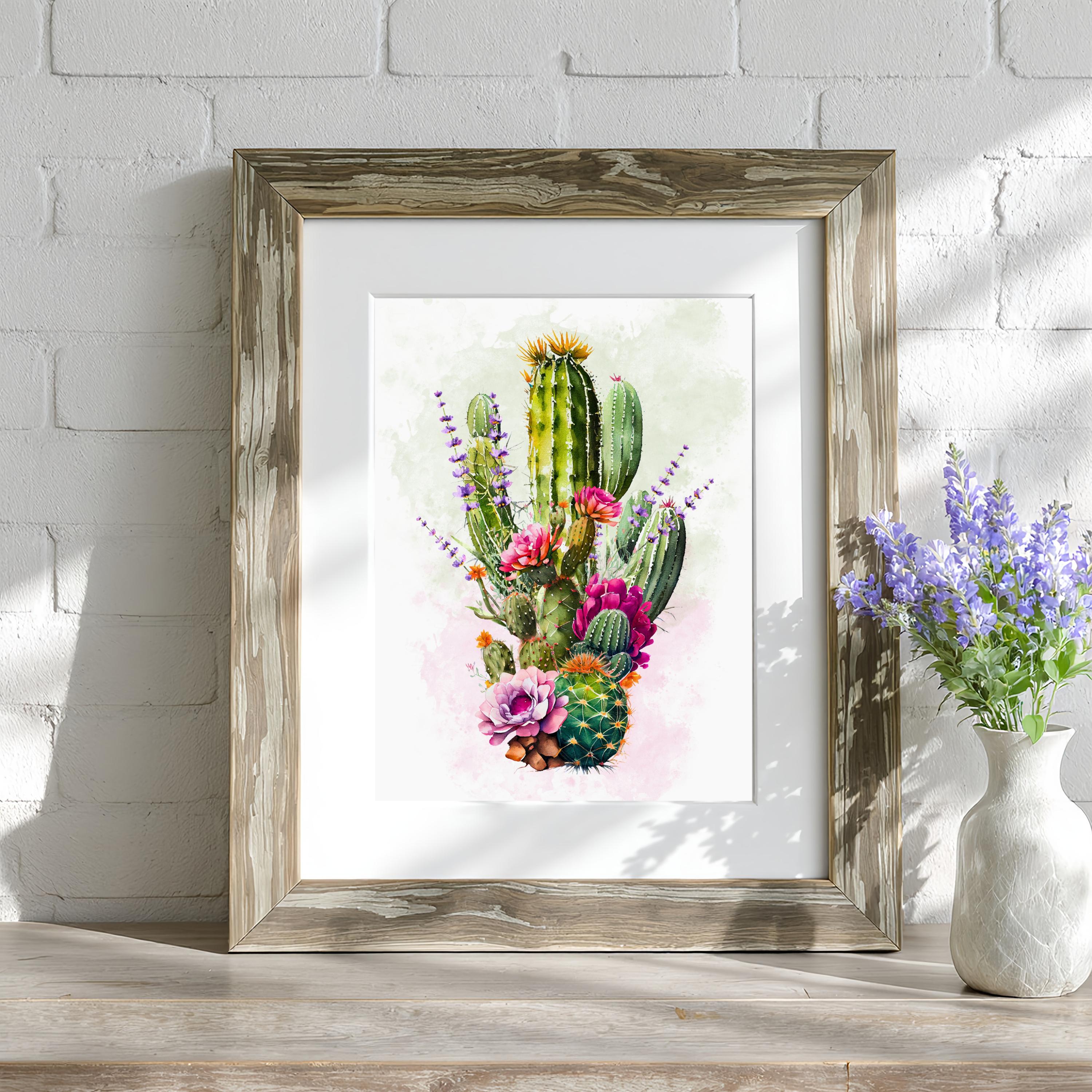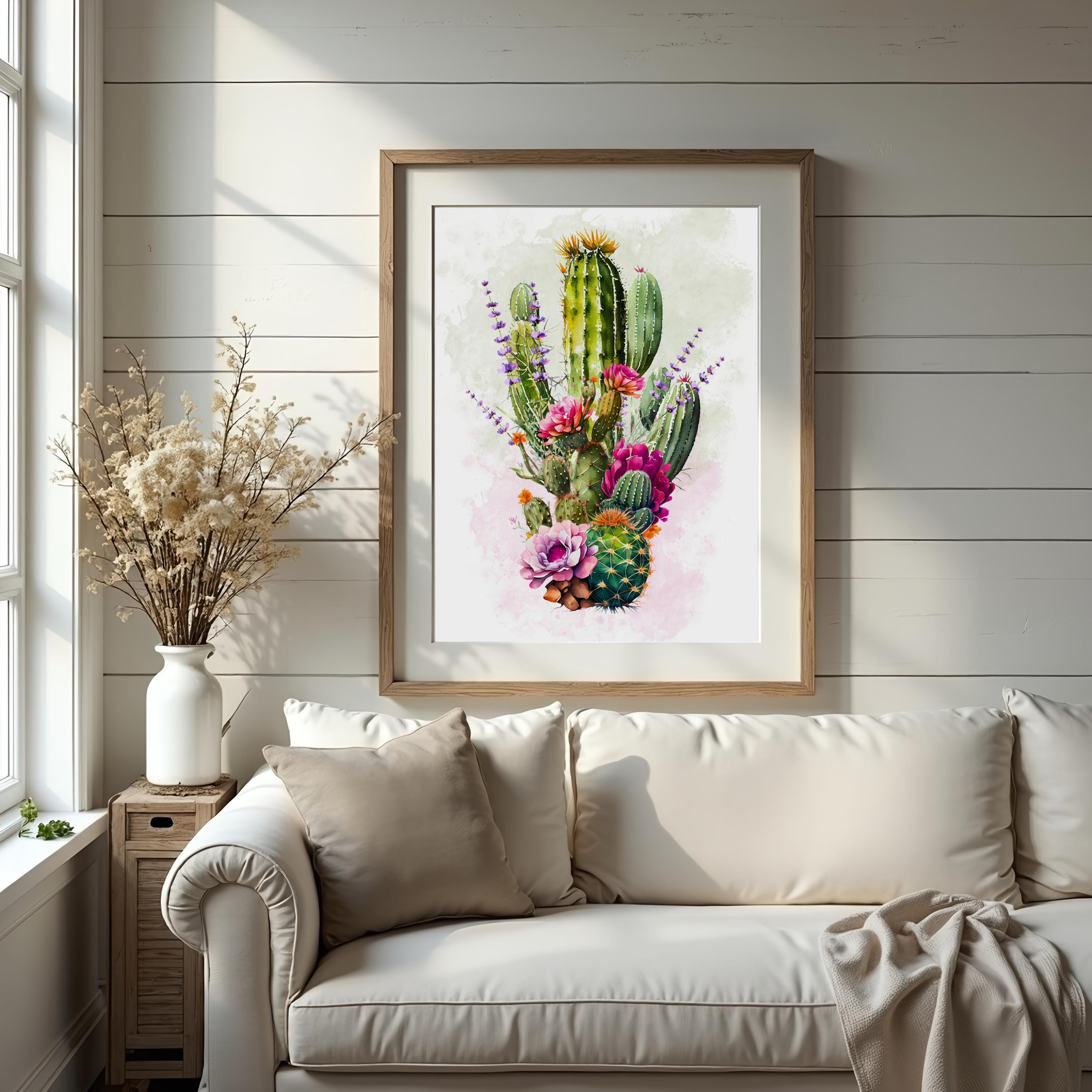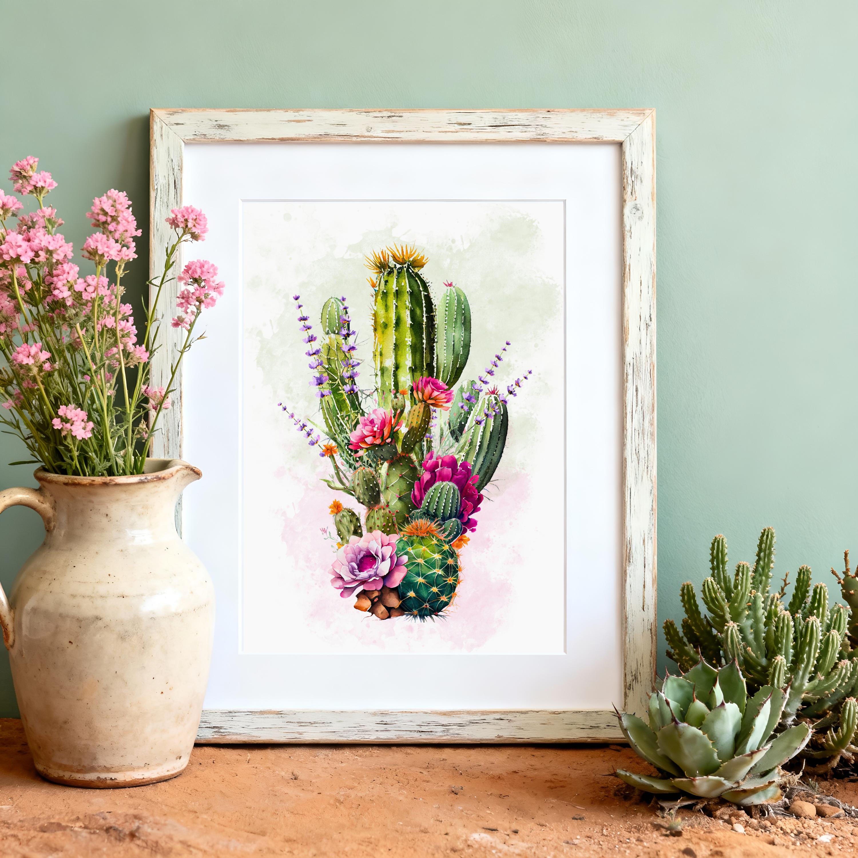 Perfect for adding warmth and color to your living room, bedroom, entryway, or office, this piece pairs rustic charm with Southwest flair. This art print also makes a thoughtful gift for cactus lovers, Southwest enthusiasts, or anyone who enjoys floral desert landscapes.