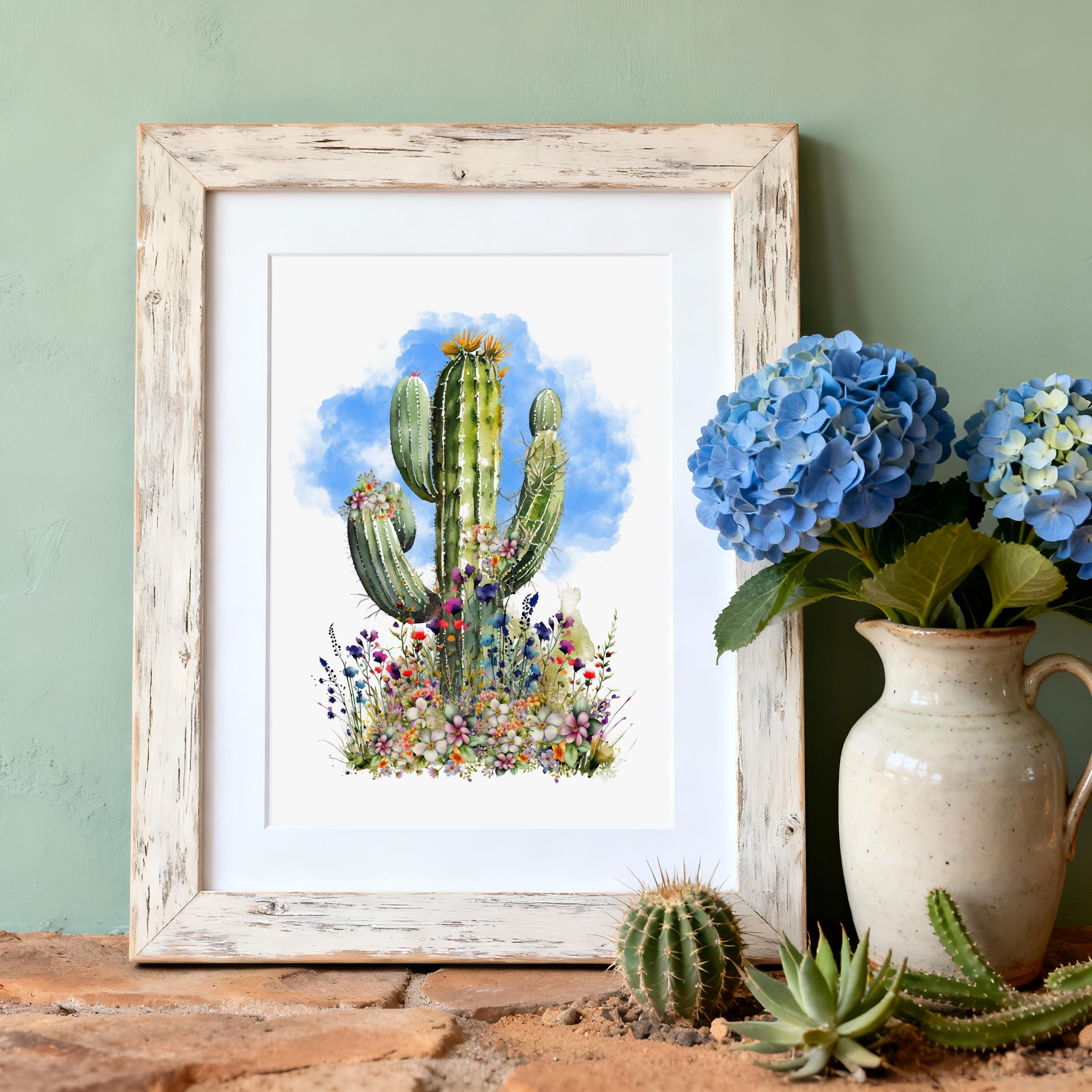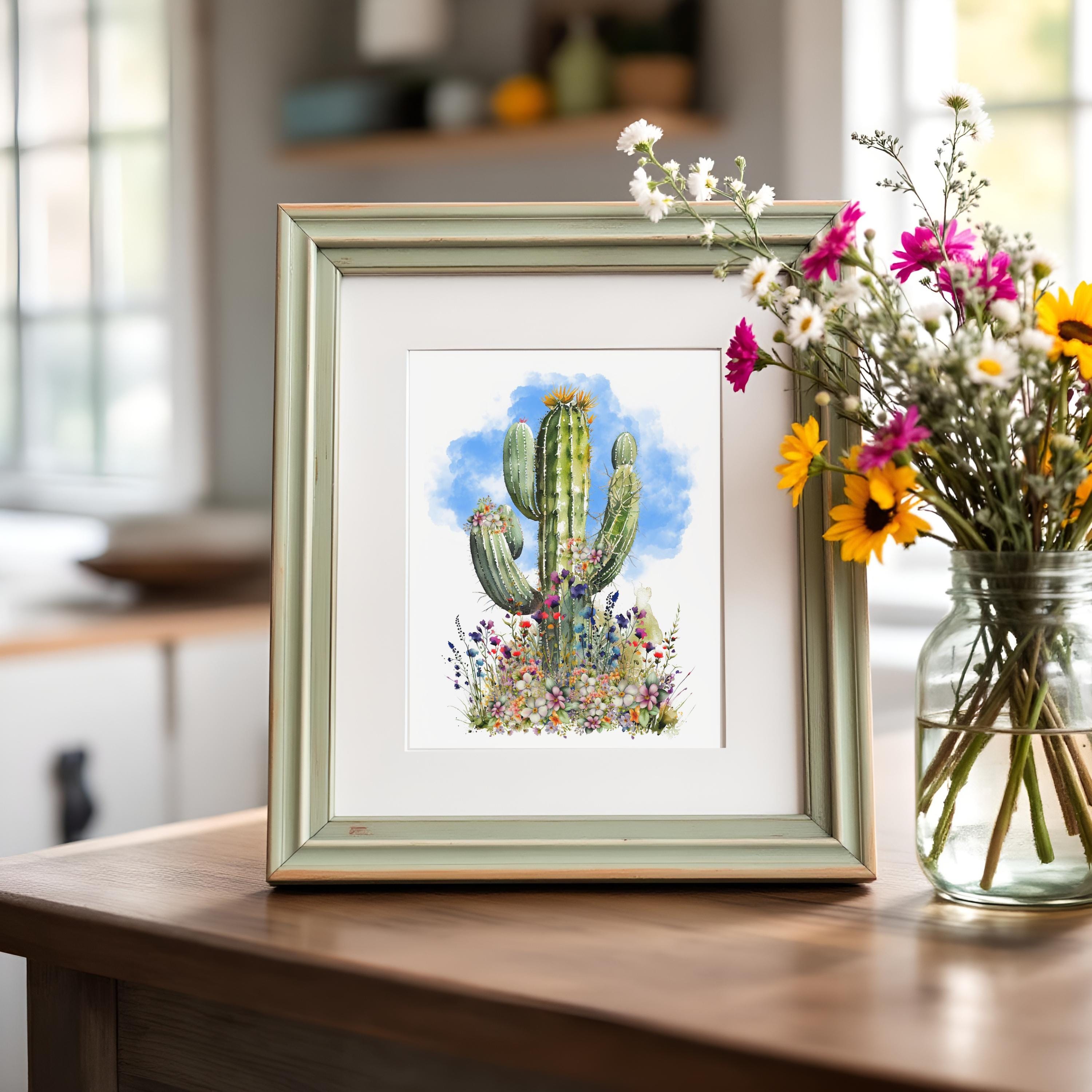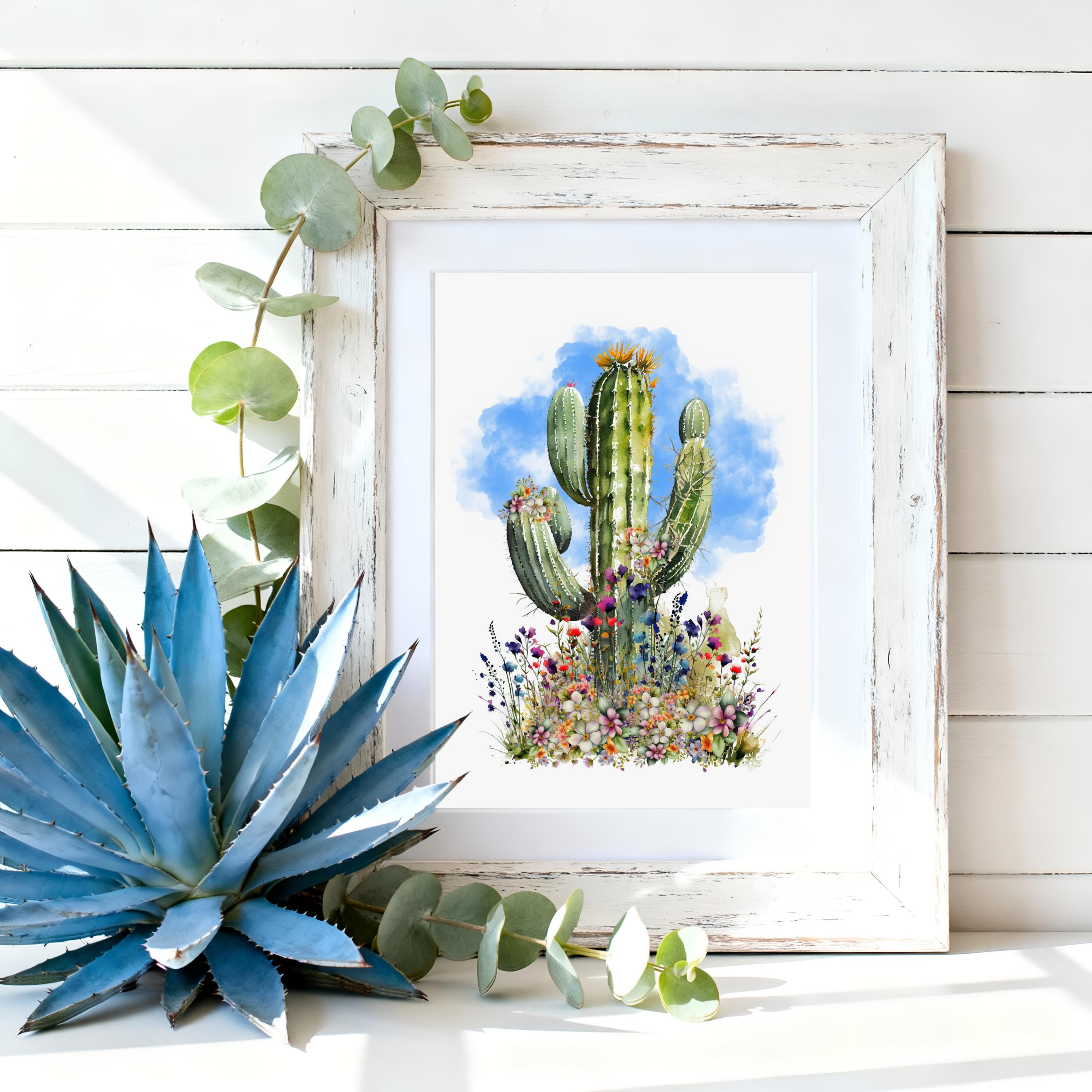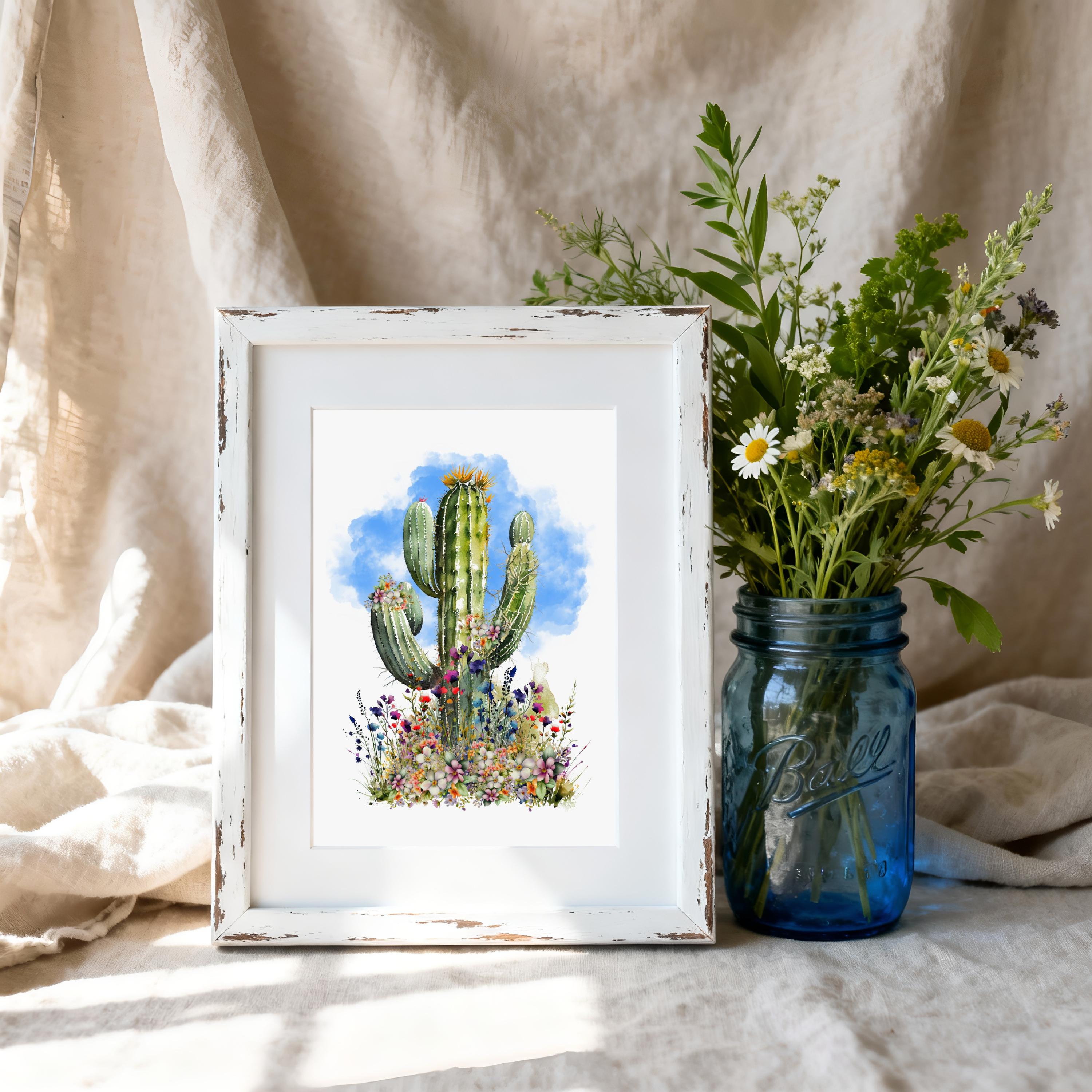 Bring the beauty of the Southwest into your home with this farmhouse-inspired cactus art print. Featuring a watercolor-style saguaro cactus surrounded by vibrant desert wildflowers, soft greenery, and an airy blue sky, this piece captures the charm of desert life with a fresh, farmhouse flair.