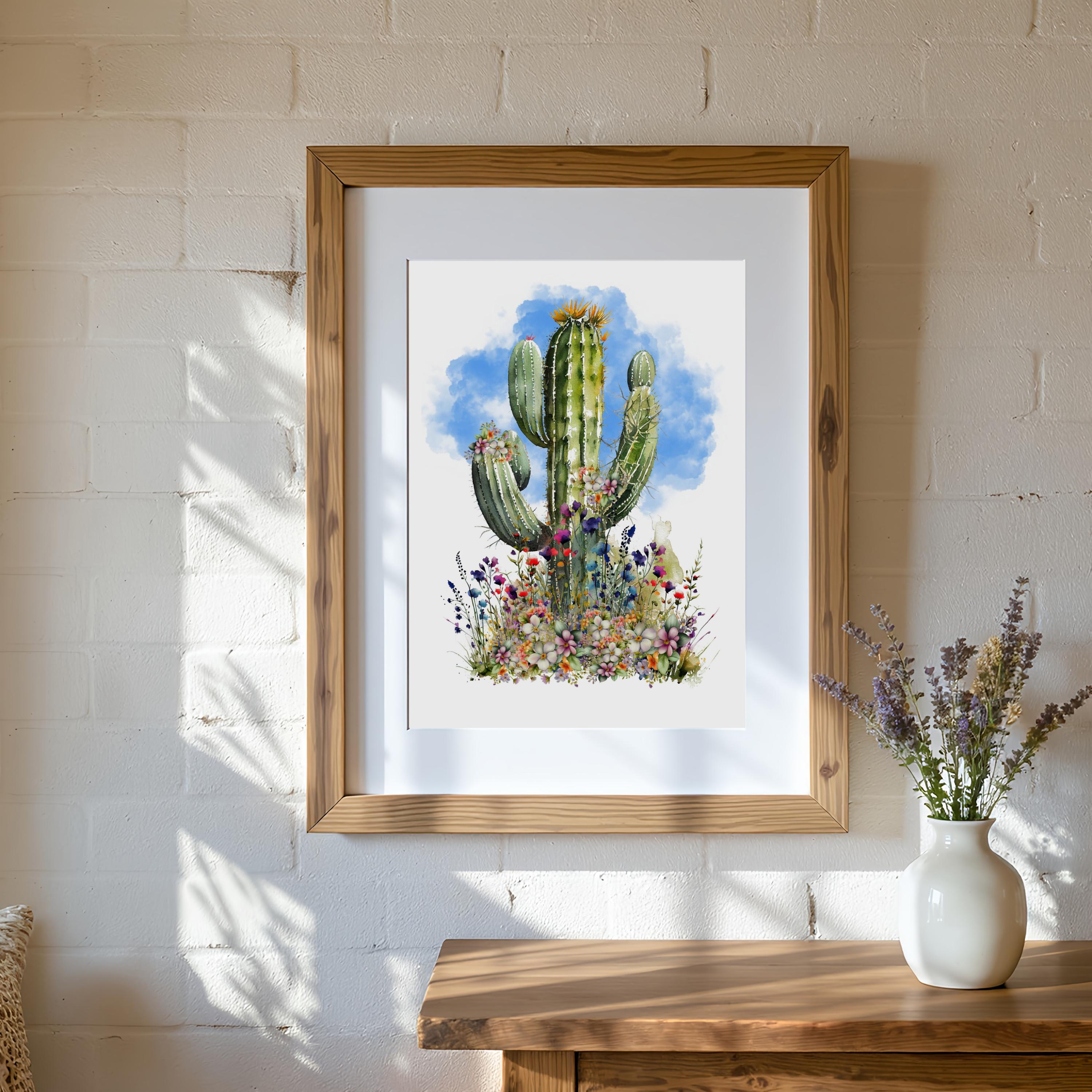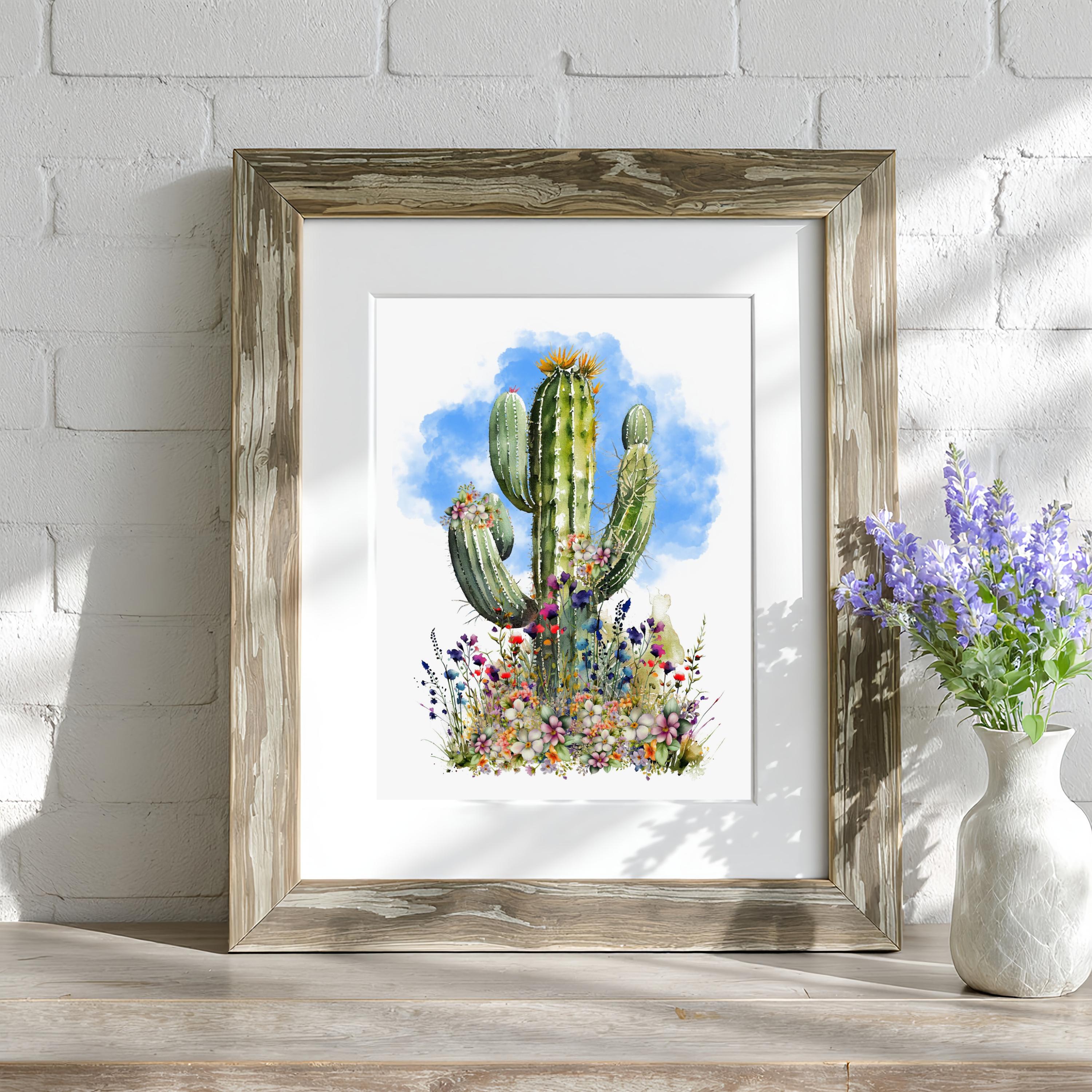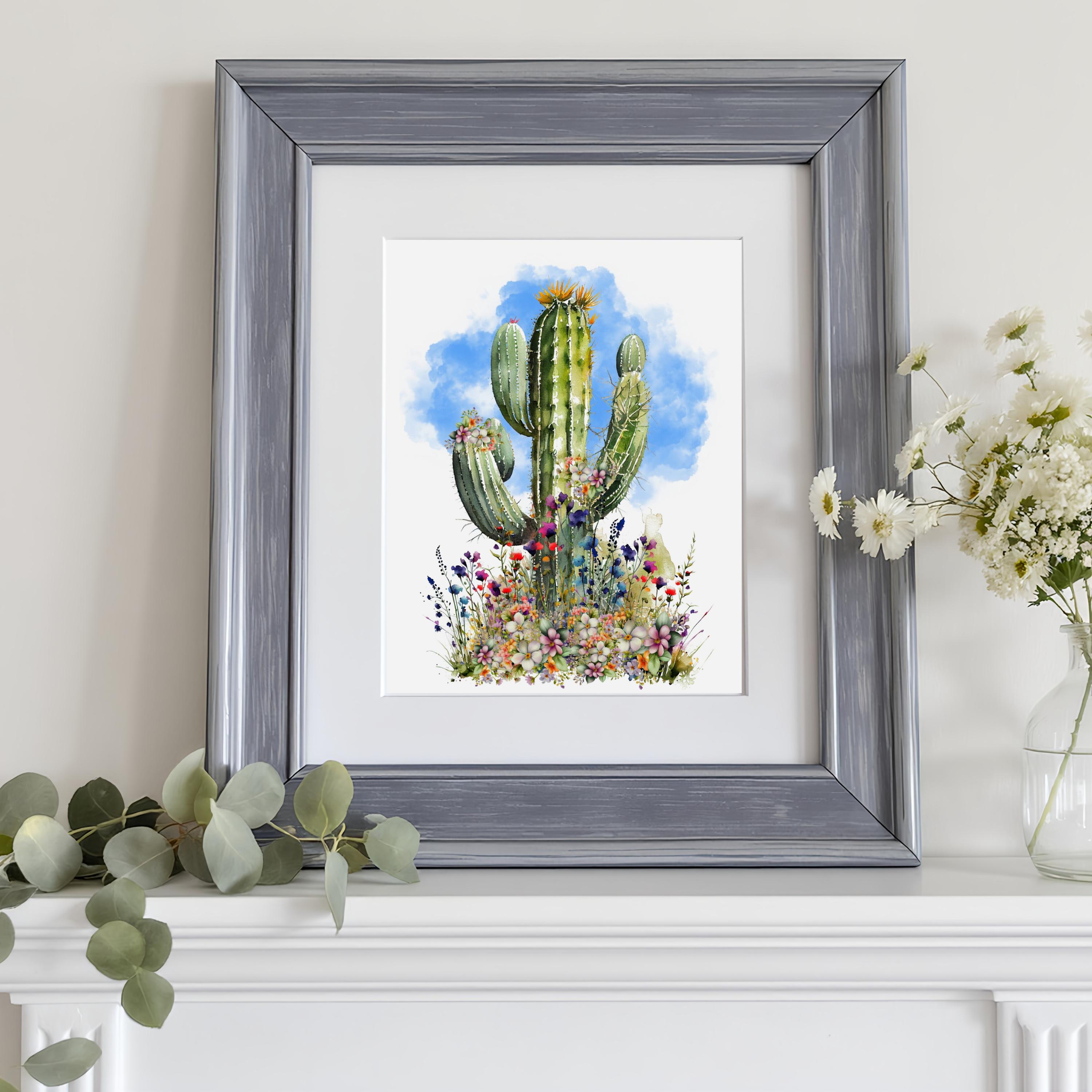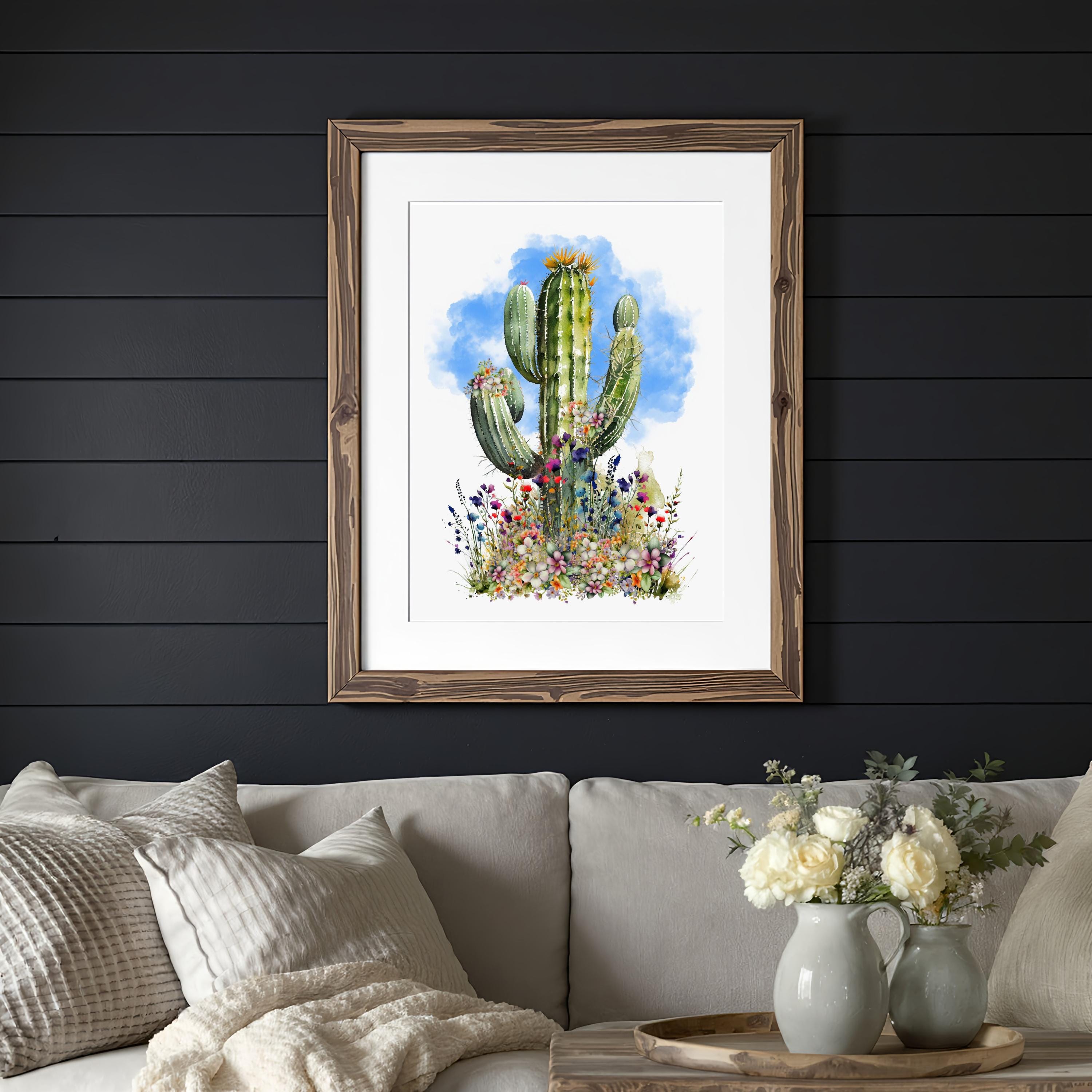 Bring the beauty of the Southwest into your home with this farmhouse-inspired cactus art print. Featuring a watercolor-style saguaro cactus surrounded by vibrant desert wildflowers, soft greenery, and an airy blue sky, this piece captures the charm of desert life with a fresh, farmhouse flair.
