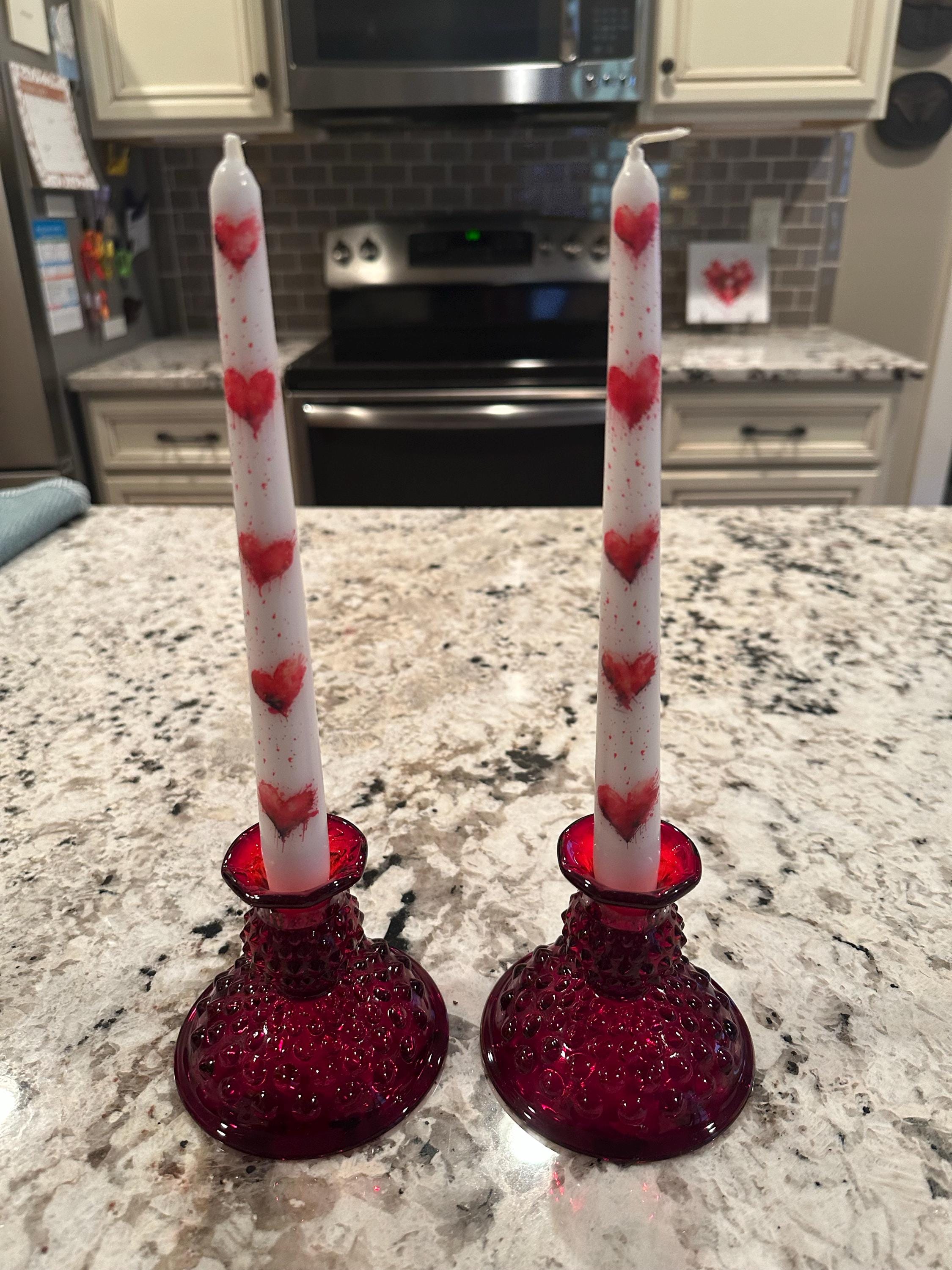 Celebrate love and warmth with this elegant set of two decorative taper candles from the Valentine Heart Collection. Each unscented candle features a hand-decorated design of vivid red watercolor hearts — perfect for romantic dinners, weddings, or heartfelt Valentine’s Day displays.