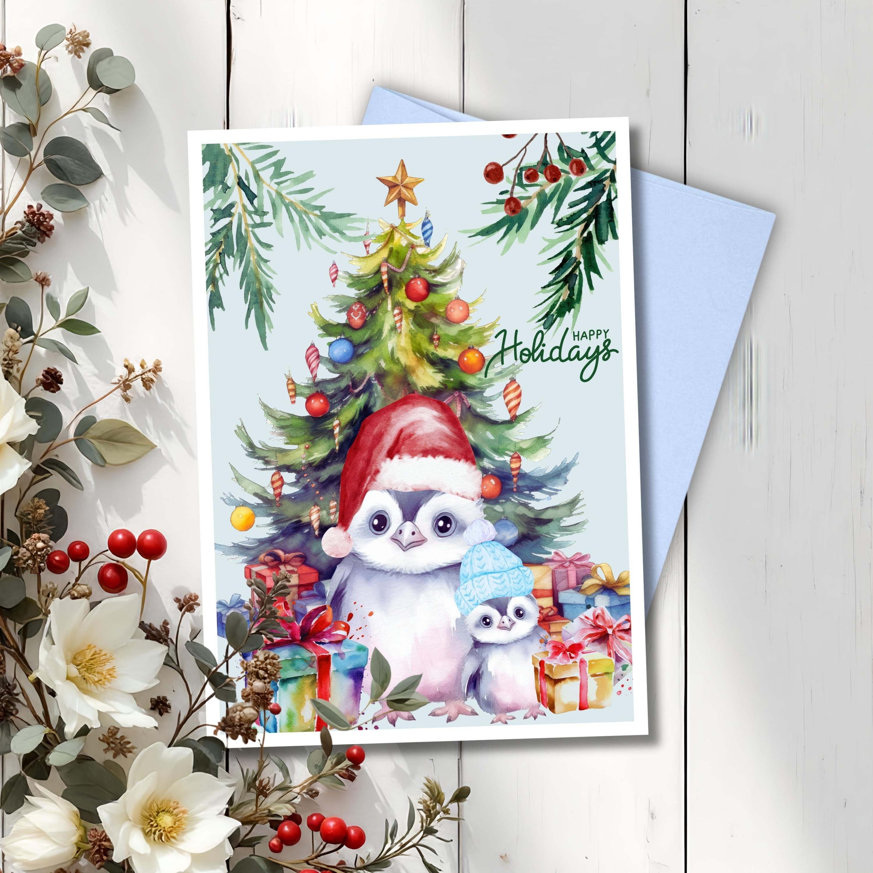 Celebrate the season with this heartwarming “Happy Holidays” card featuring two sweet penguins in cozy winter hats, surrounded by colorful presents and a beautifully decorated Christmas tree. This charming watercolor design brings a touch of playful joy and is perfect for families, kids, and anyone who loves cute holiday characters.