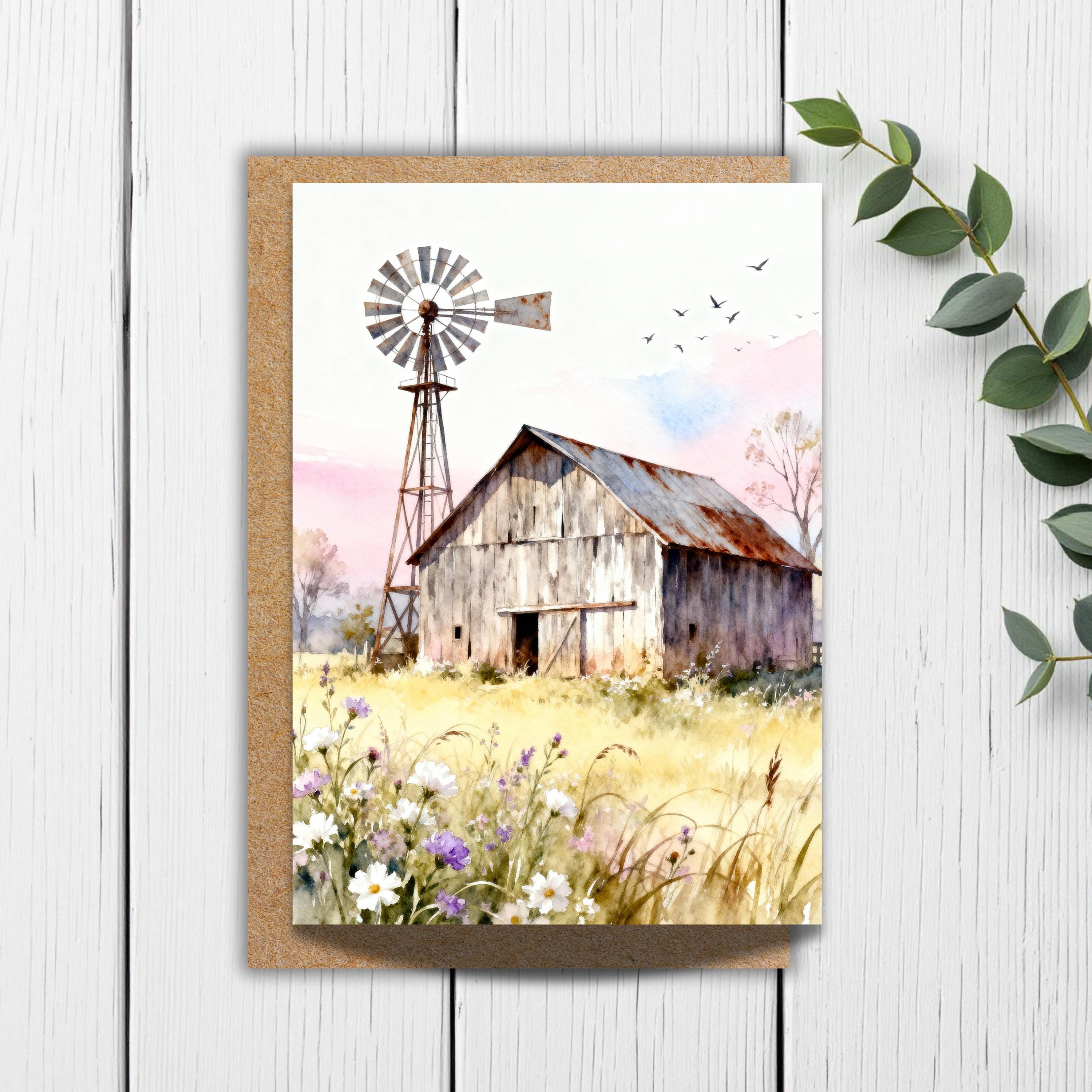 Bring the peaceful charm of the countryside to your correspondence with this softly illustrated rustic barn card. The watercolor scene features a weathered wooden barn, vintage windmill, pastel sunrise sky, and a field of wildflowers in soft purples, whites, and golds. Perfect for anyone who loves cozy farmhouse style, quiet rural landscapes, or timeless country nostalgia.