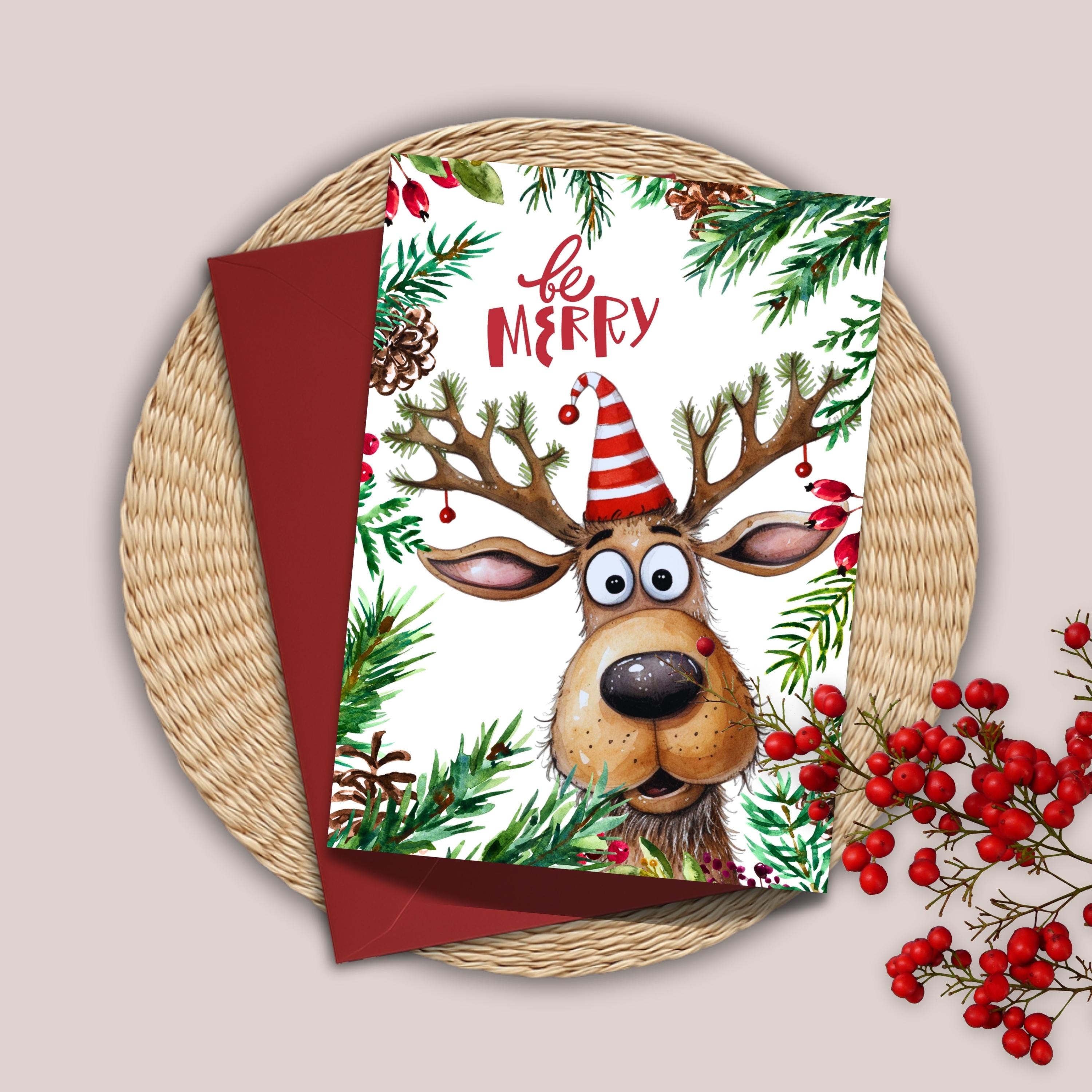 Send some holiday cheer with this whimsical watercolor reindeer card! Featuring a goofy reindeer in a striped Santa hat, surrounded by festive greenery and pinecones, this card is sure to bring a smile. The playful “Be Merry” message adds just the right touch of holiday fun. Perfect for friends, family, coworkers, or anyone who loves a good laugh during the season.