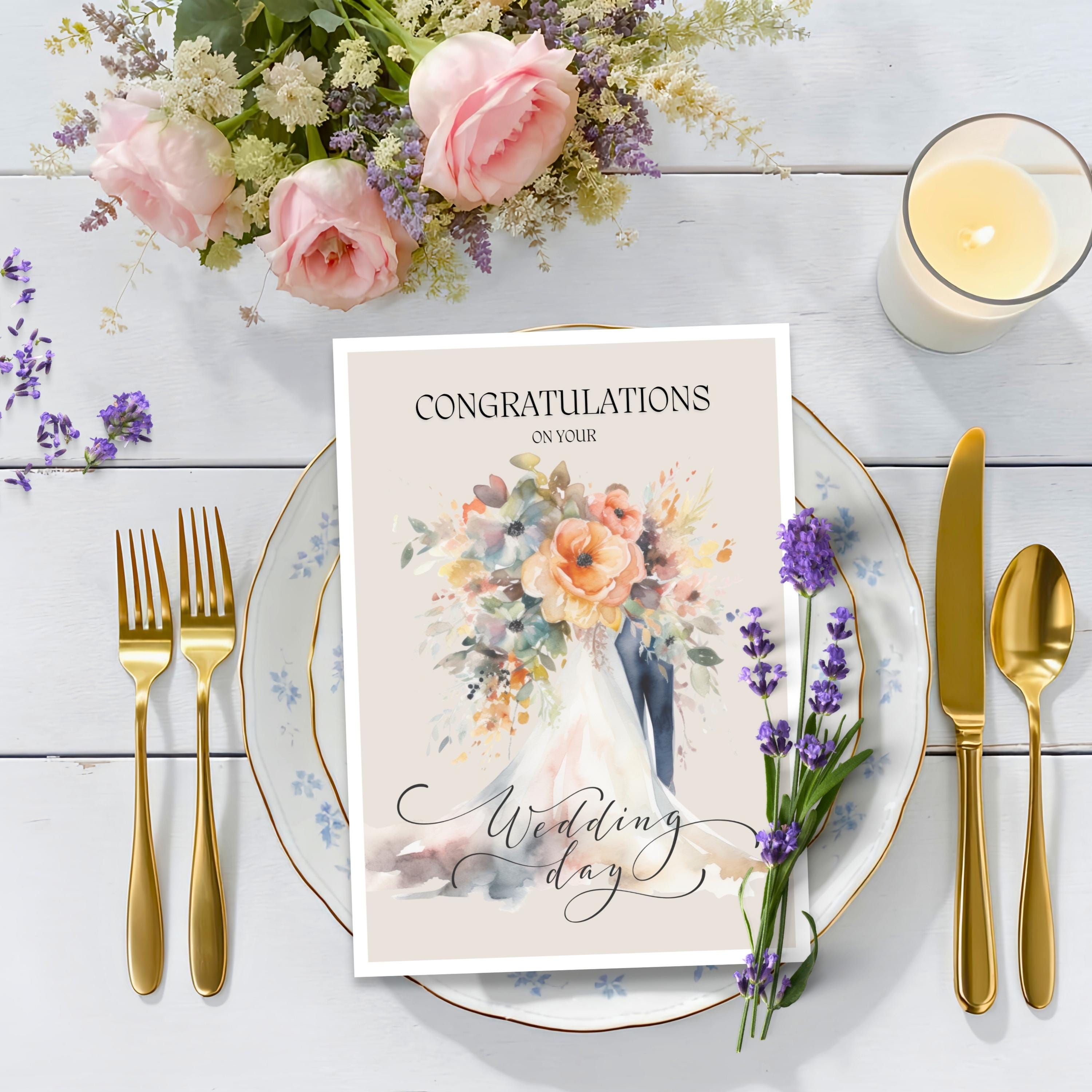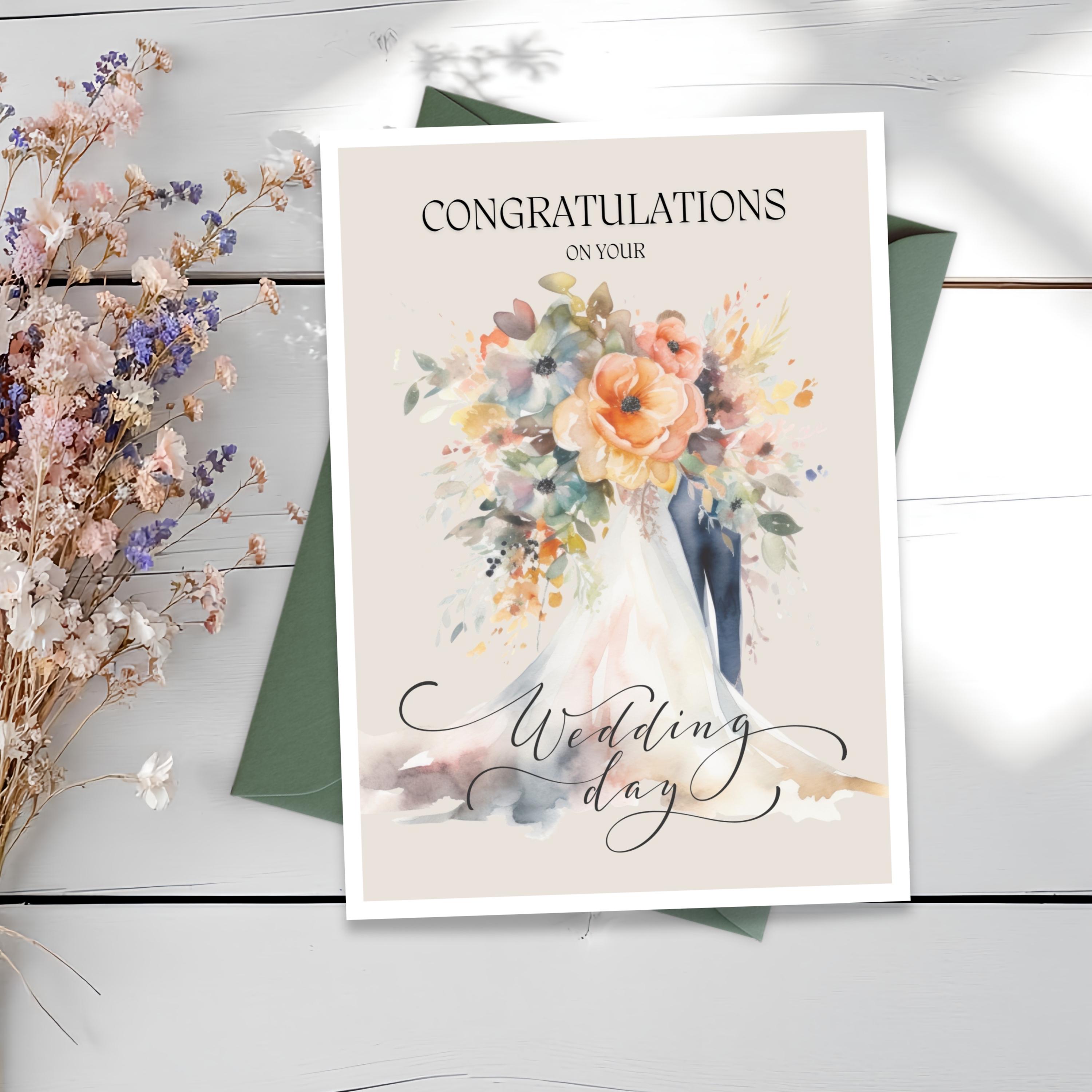 Celebrate the joyous union of a special couple with this elegant greeting card, featuring a charming illustration of a bride and groom standing in front of a stunning watercolor floral bouquet. The graceful flowers add a touch of whimsical beauty, perfectly complementing the heartfelt message of "Congratulations on your Wedding Day." Printed on high-quality cardstock and paired with a rustic Kraft envelope, this card is designed to make a lasting impression and become a cherished keepsake for the newlyweds.