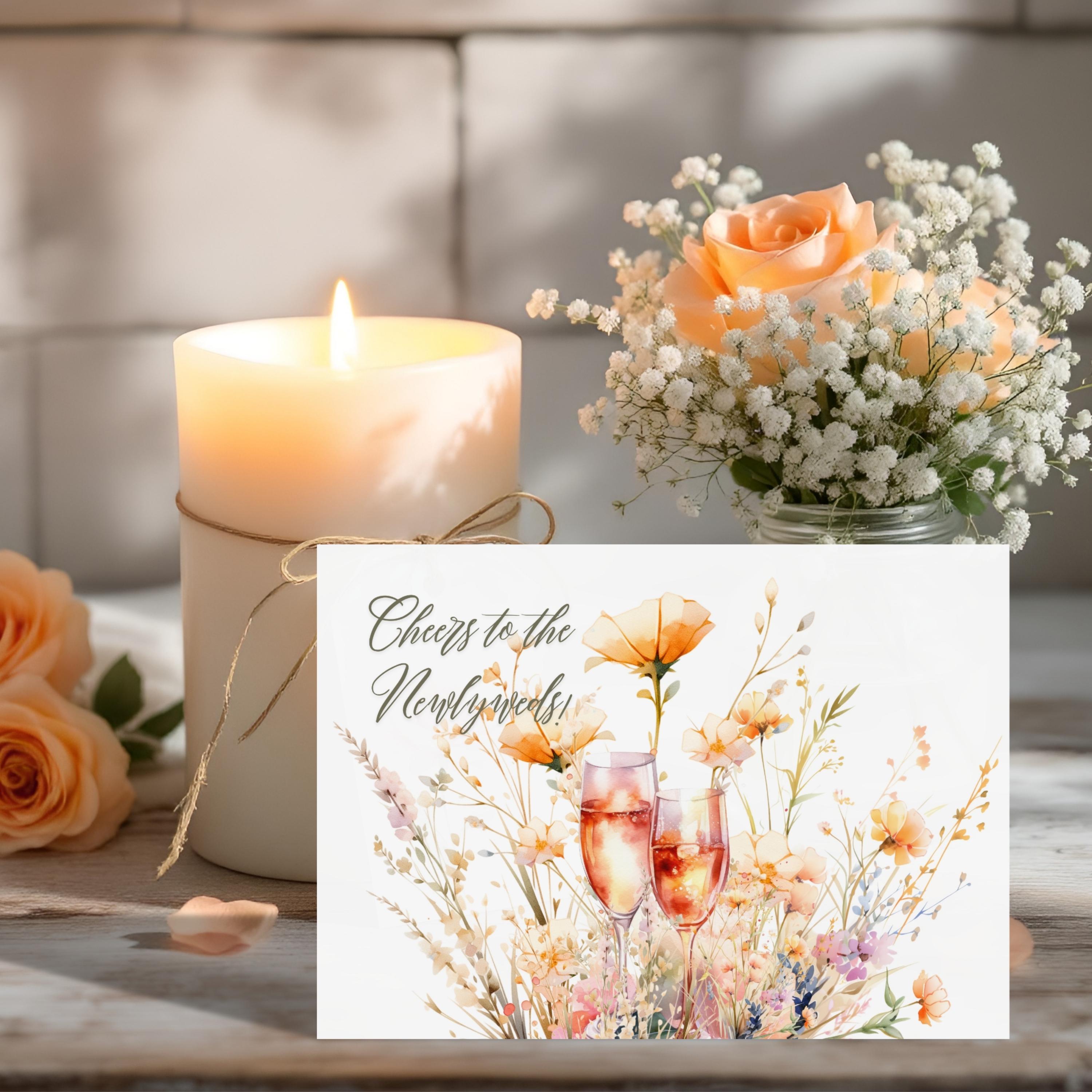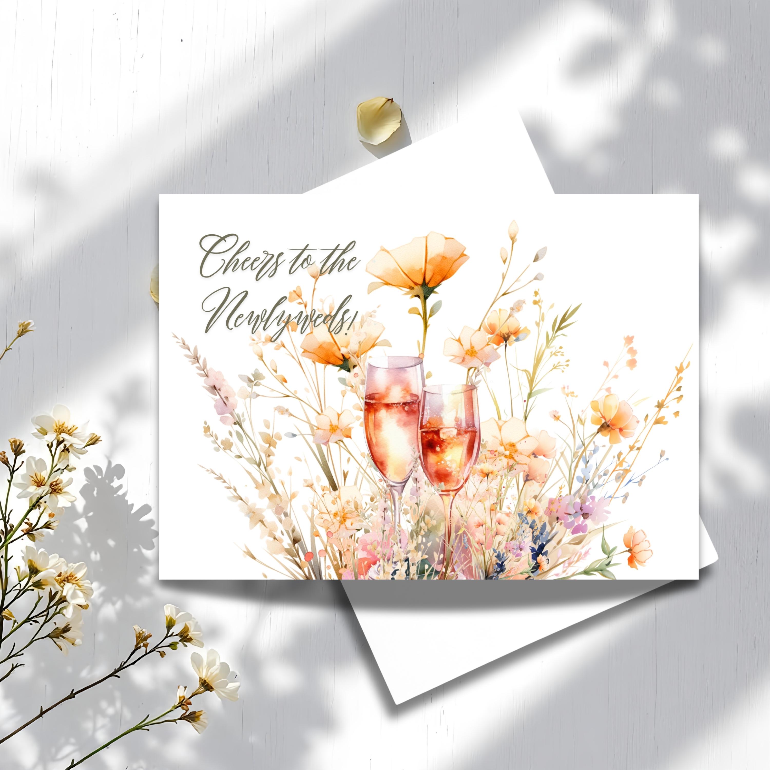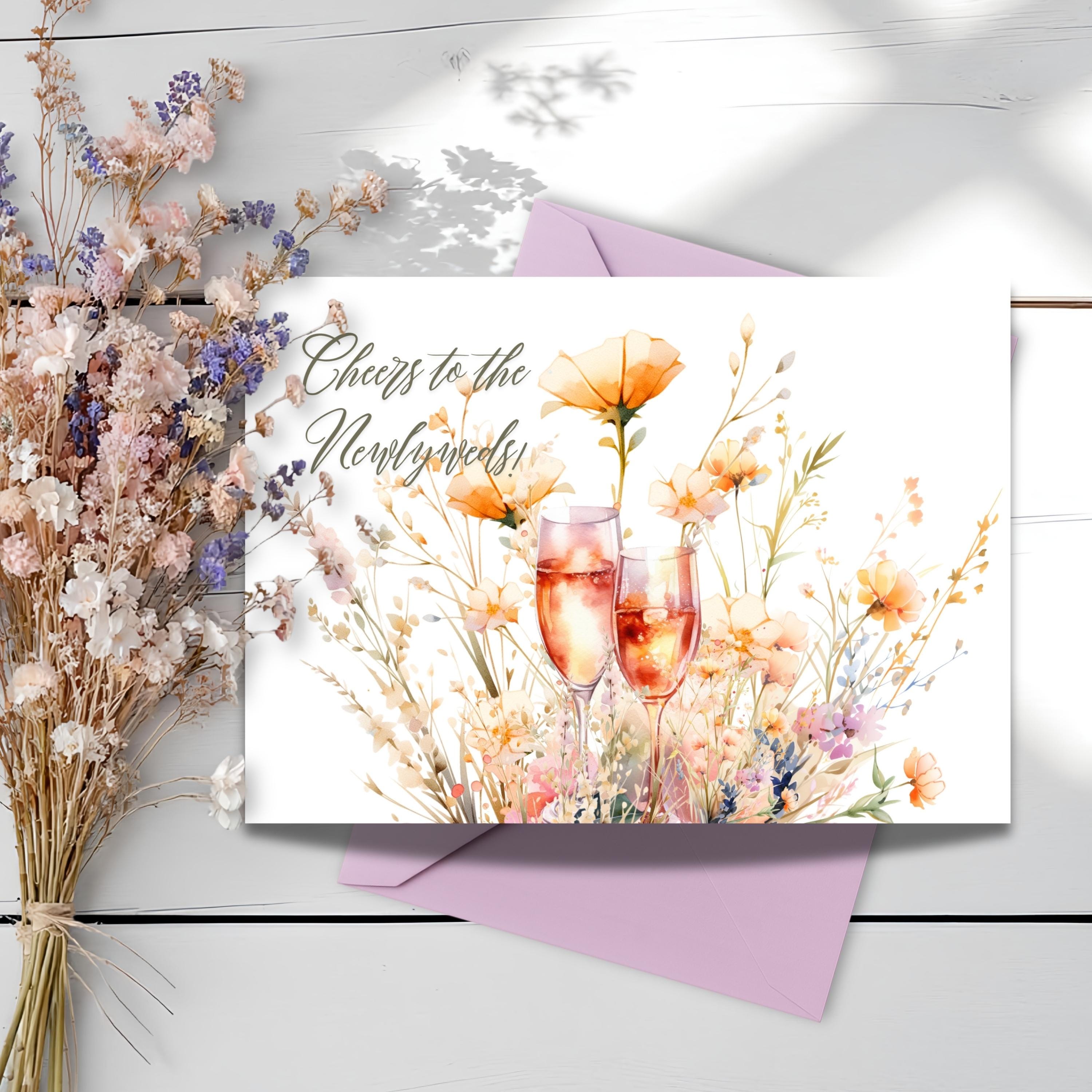 Celebrate love and new beginnings with our watercolor greeting card featuring a stunning arrangement of orange and beige boho flowers. At the heart of this charming design, two elegant champagne flutes clink together, perfectly capturing the joyous moment. The heartfelt message, "Cheers to the Newlyweds," adds a special touch of warmth and celebration. This beautiful card comes with a rustic Kraft envelope, making it the perfect choice for gifting to newlyweds or for adding a personal touch to any wedding celebration.