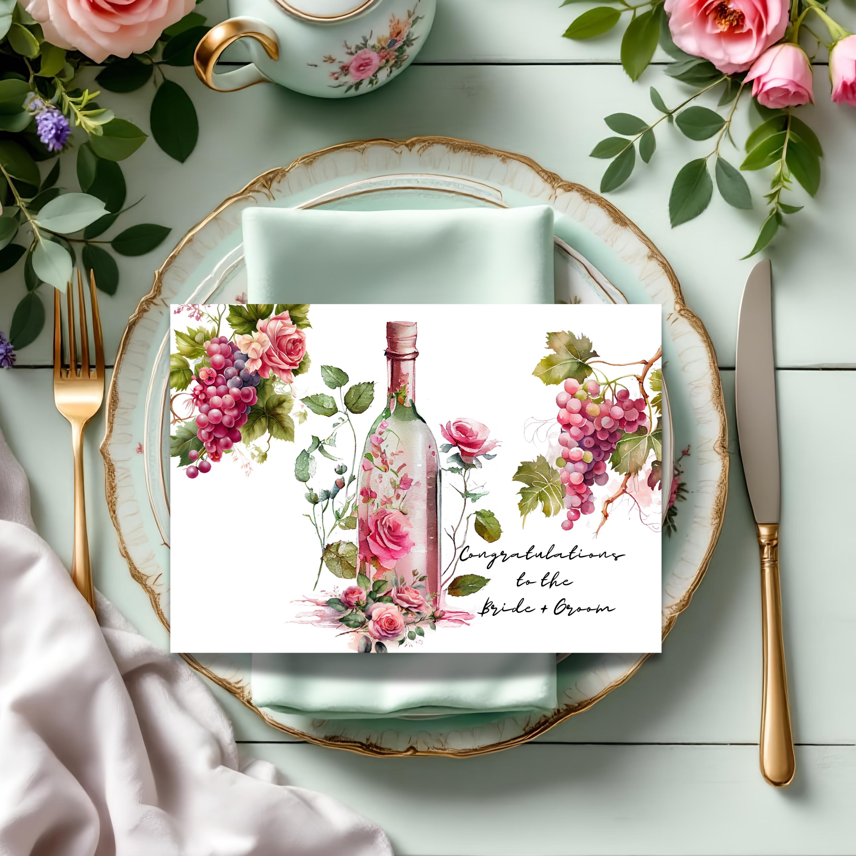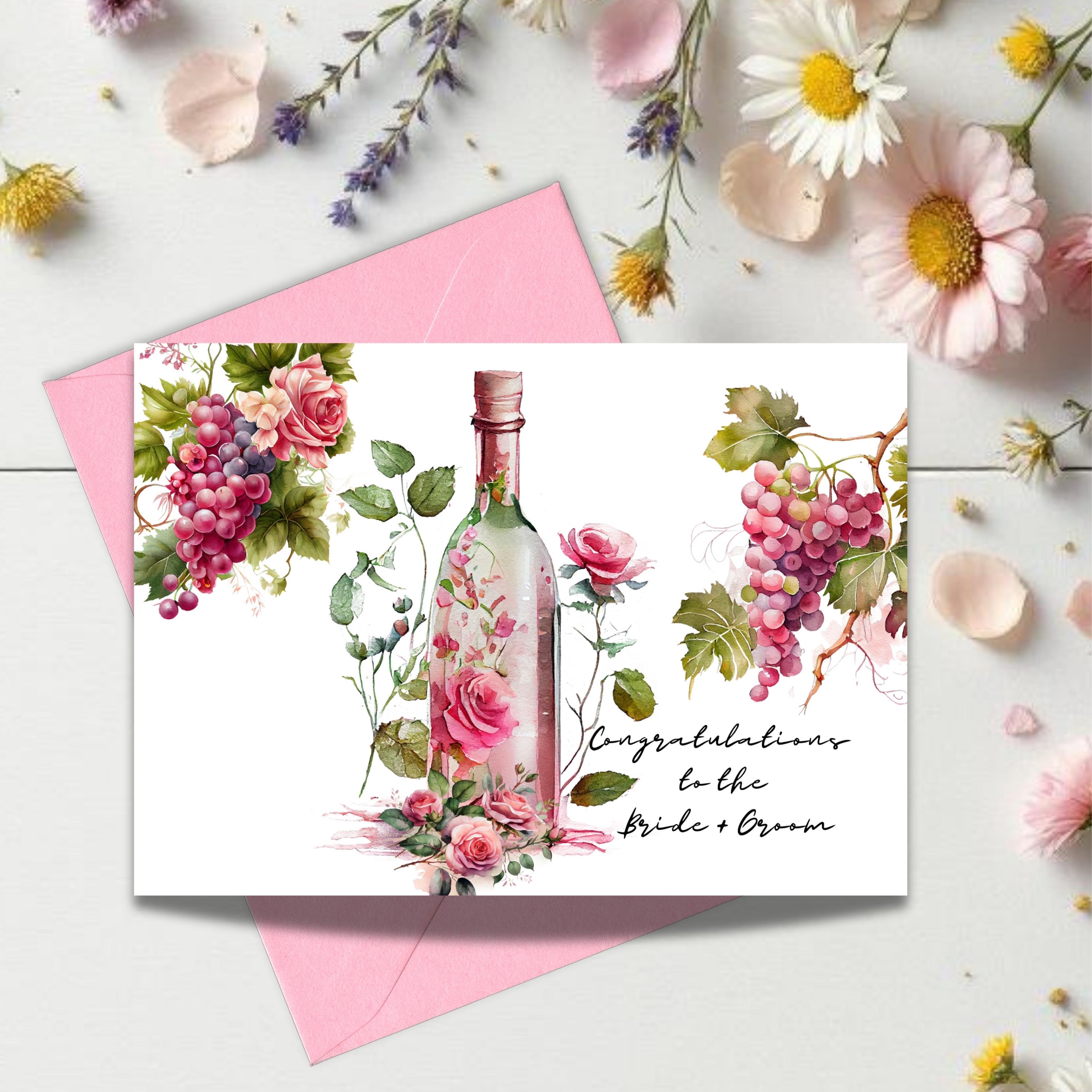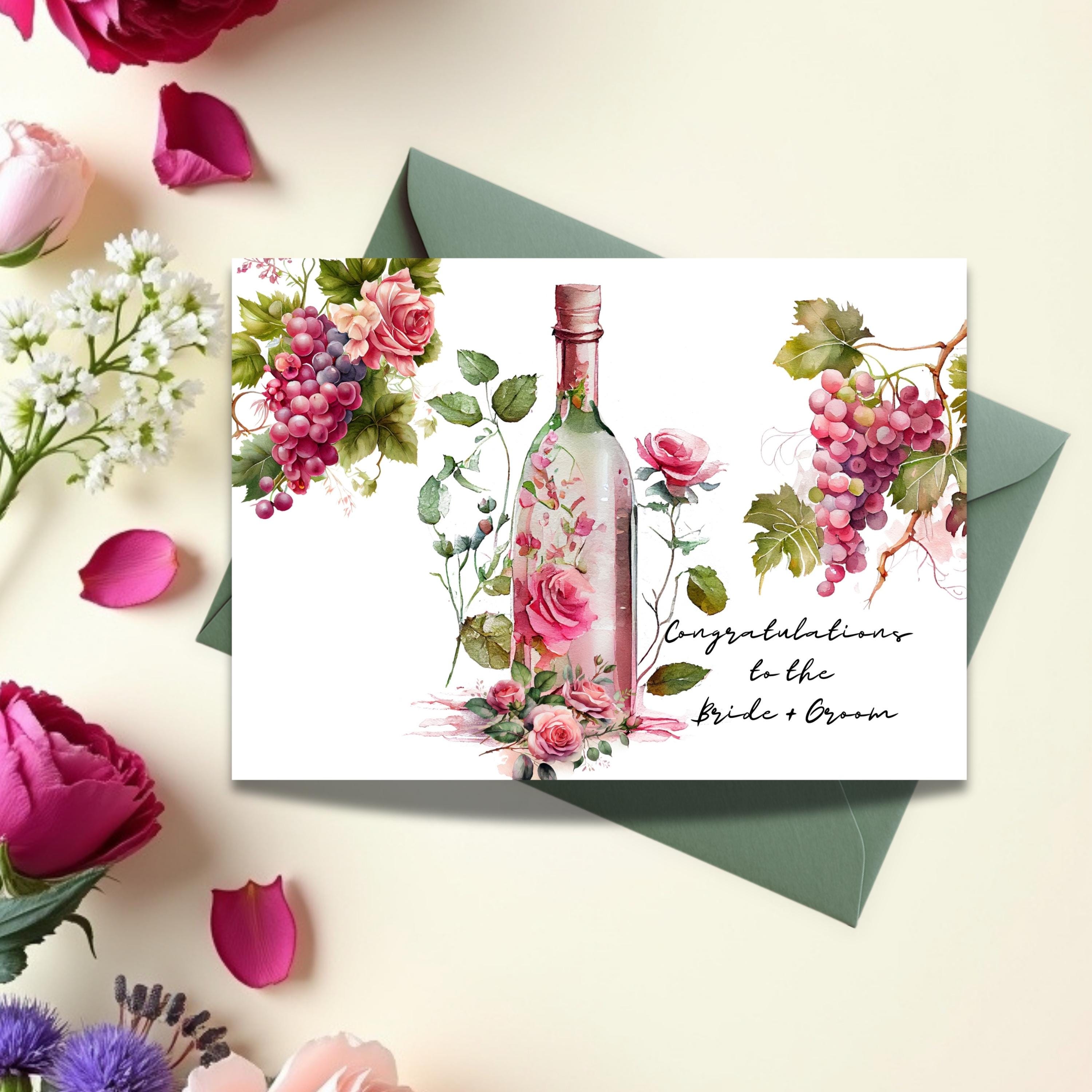 Celebrate the joyous union of the bride and groom with this exquisite watercolor greeting card. Adorned with a beautiful floral wine bottle design, cascading grapes, and delicate flowers, it captures the essence of their special day. The heartfelt message "Congratulations to the Bride and Groom" adds a personal touch, making it the ideal keepsake for wine enthusiasts. Nestled in a charming kraft envelope, this thoughtful and elegant card is sure to convey your warm wishes and add a touch of charm to their new journey together.