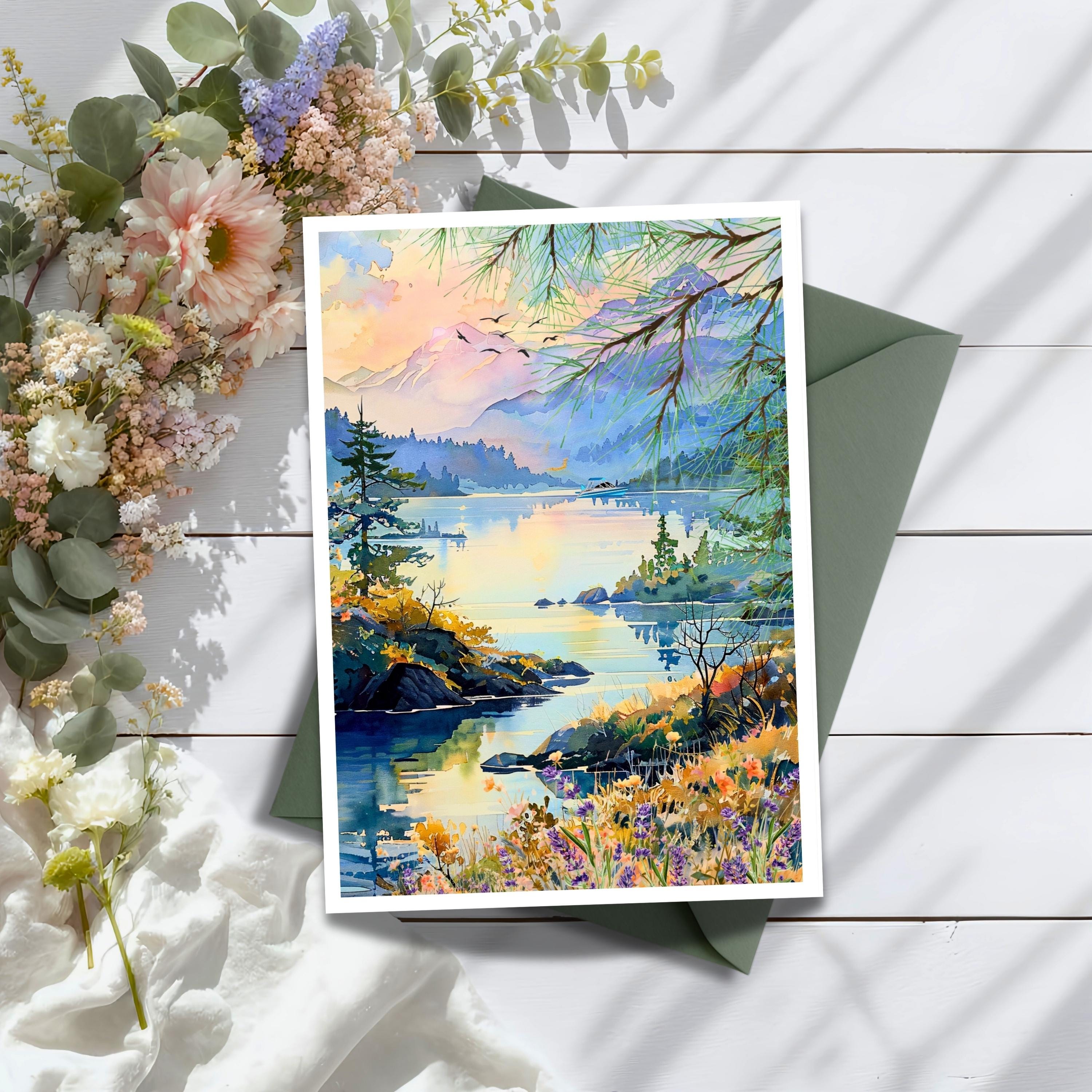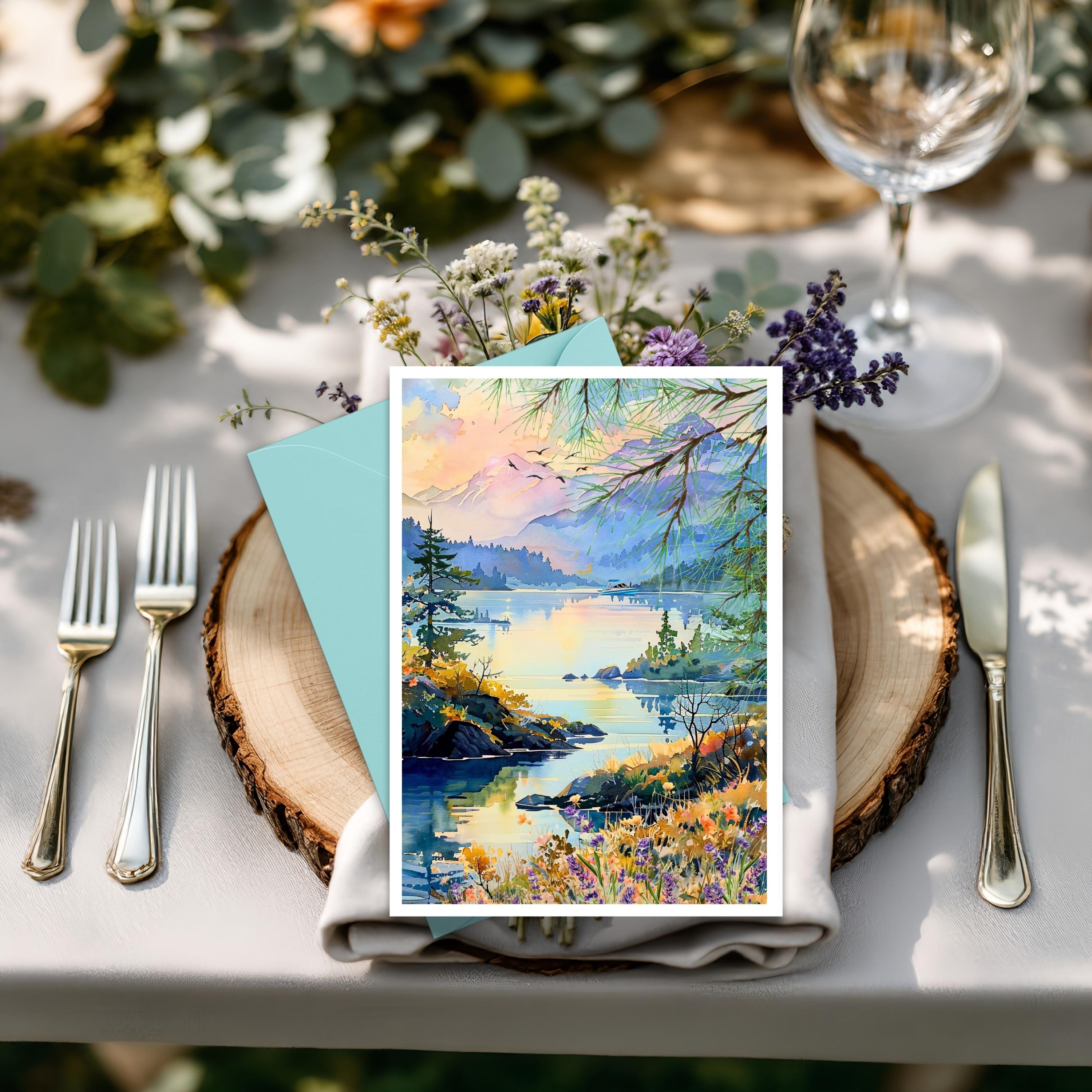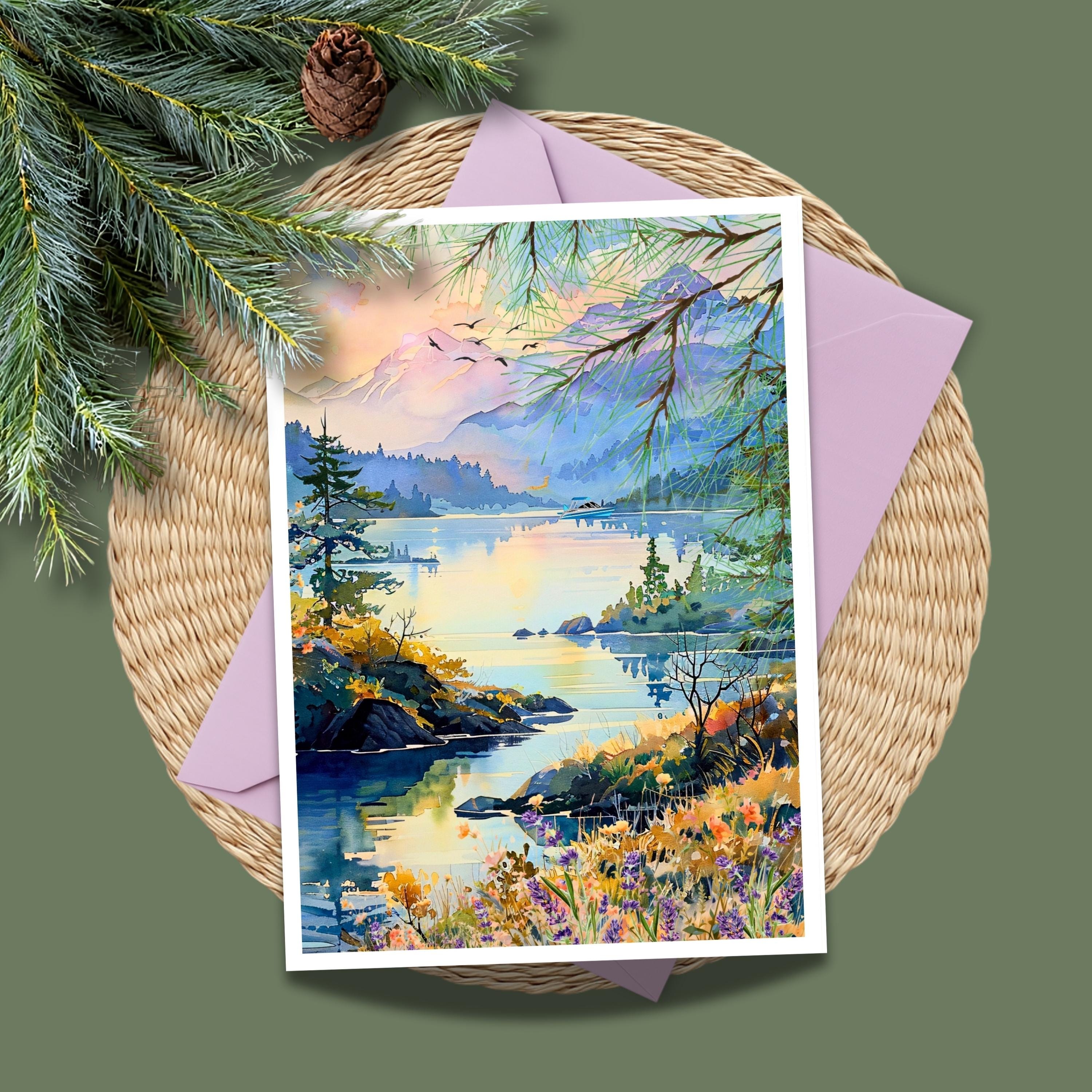 Celebrate the breathtaking beauty of the Pacific Northwest with this exquisite watercolor greeting card, featuring the majestic Olympic Mountains towering behind a serene forest lake. The tranquil scene captures the essence of the region's natural splendor, evoking a sense of peace and wonder. Perfect for those who appreciate the allure of untouched landscapes, this card offers a serene way to convey your heartfelt sentiments. Paired with a rustic Kraft envelope, it provides a complete and thoughtfully packaged message, ideal for sharing the tranquil charm of the Pacific Northwest with friends and loved ones.