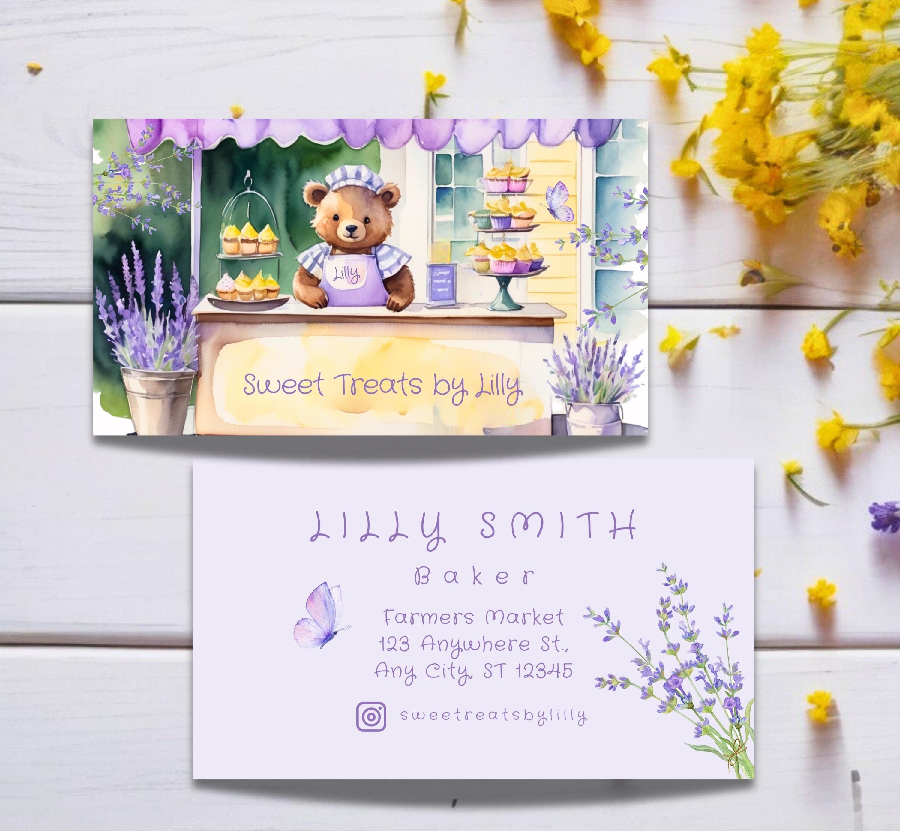 Make a sweet impression with these custom watercolor business cards, perfect for young bakers, lemonade stand stars, or mini market vendors! Featuring a whimsical bear in a lavender bakery stand with floral and butterfly accents, these personalized 3.5x2-inch cards are ideal for kids who love sharing their treats and talents with the world.