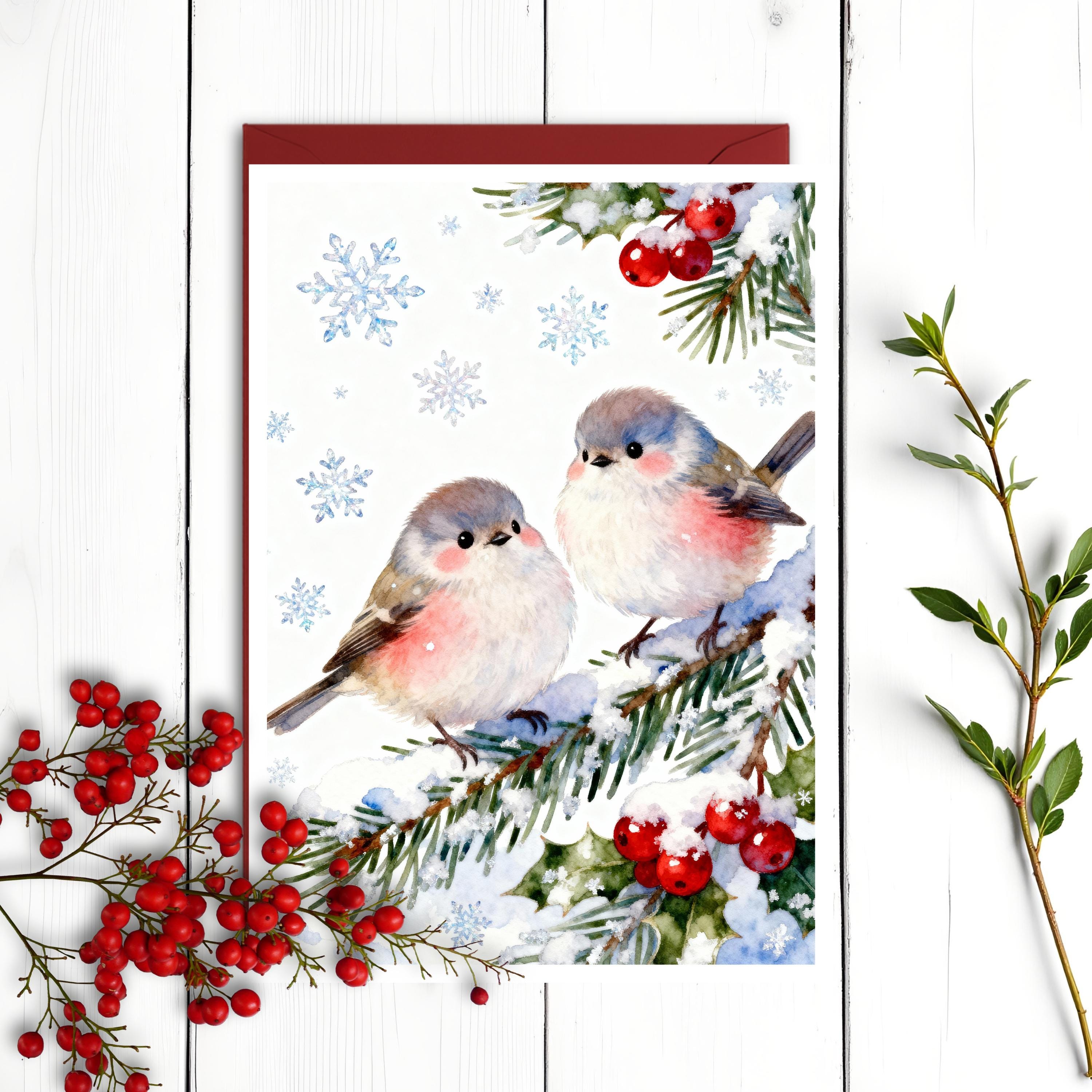 Bring a touch of winter charm to your correspondence with this beautifully illustrated woodland bird card. Two fluffy winter birds perch on a snowy pine branch surrounded by holly berries and delicate snowflakes, creating a crisp and cheerful seasonal scene. Perfect for Christmas, holiday messages, winter birthdays, or gifting to nature and bird lovers.