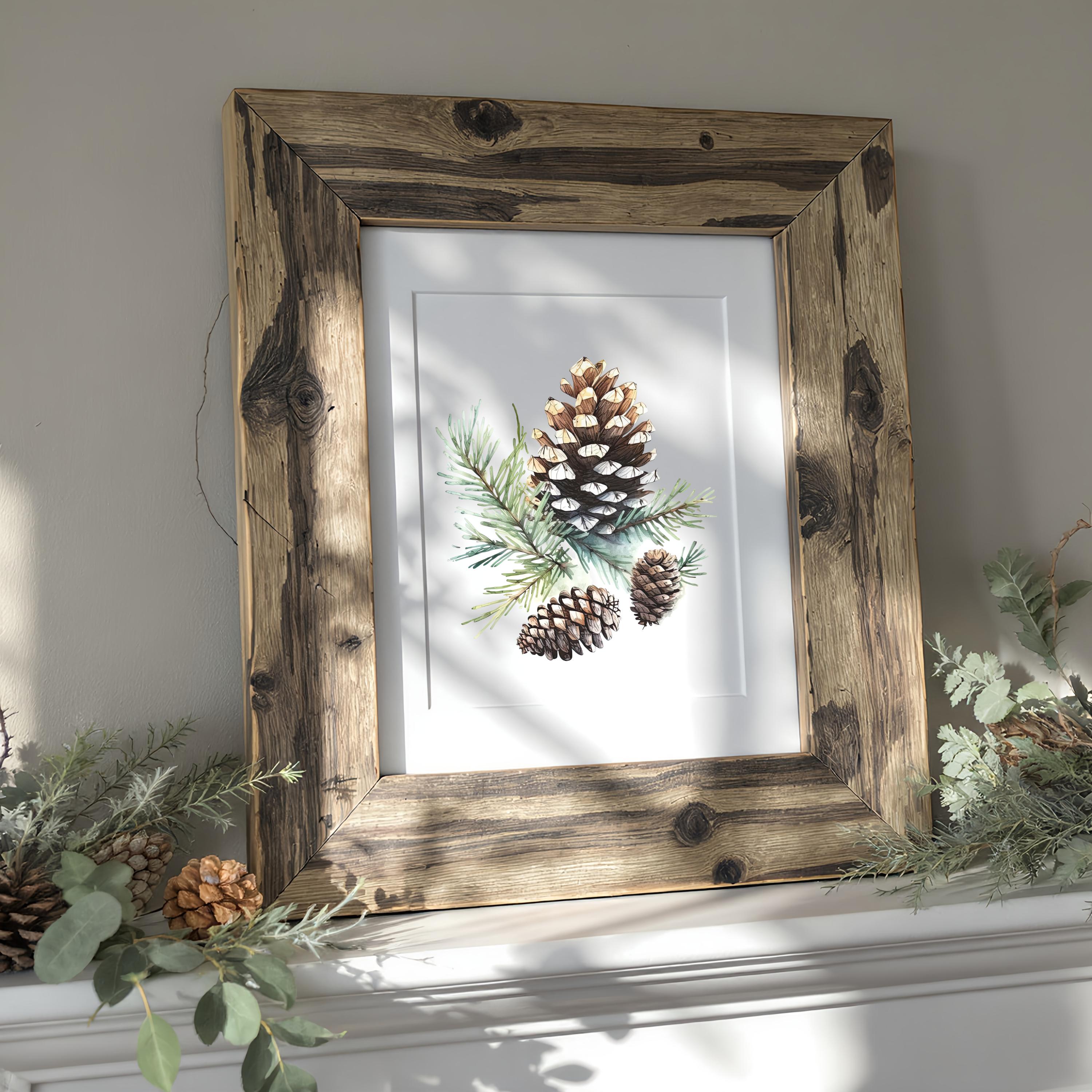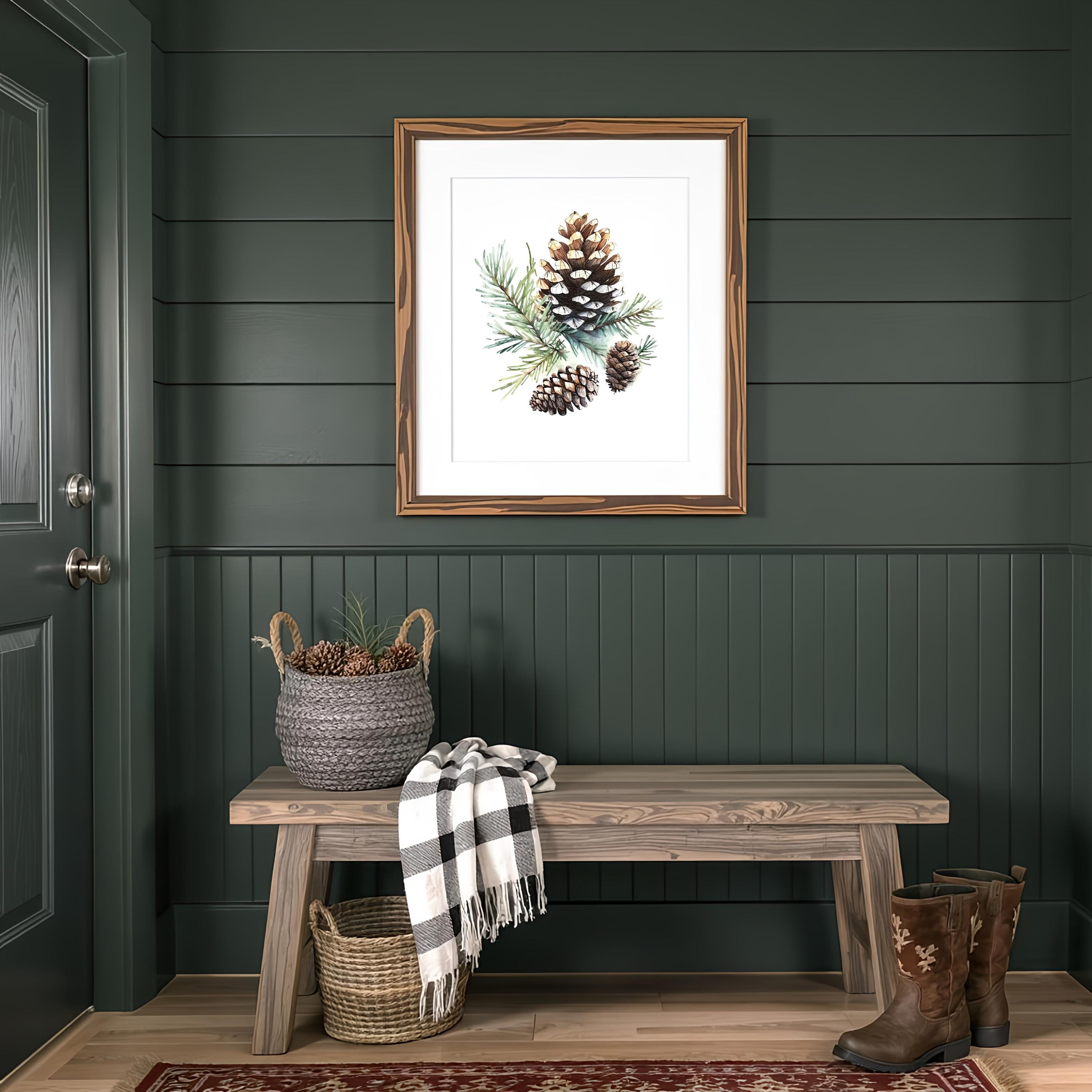 Bring the charm of the season indoors with this watercolor pinecone art print, featuring a trio of pinecones nestled in evergreen branches. Softly painted in natural hues, this piece adds a cozy, rustic touch to any holiday display—perfect for entryways, mantels, or seasonal gallery walls.