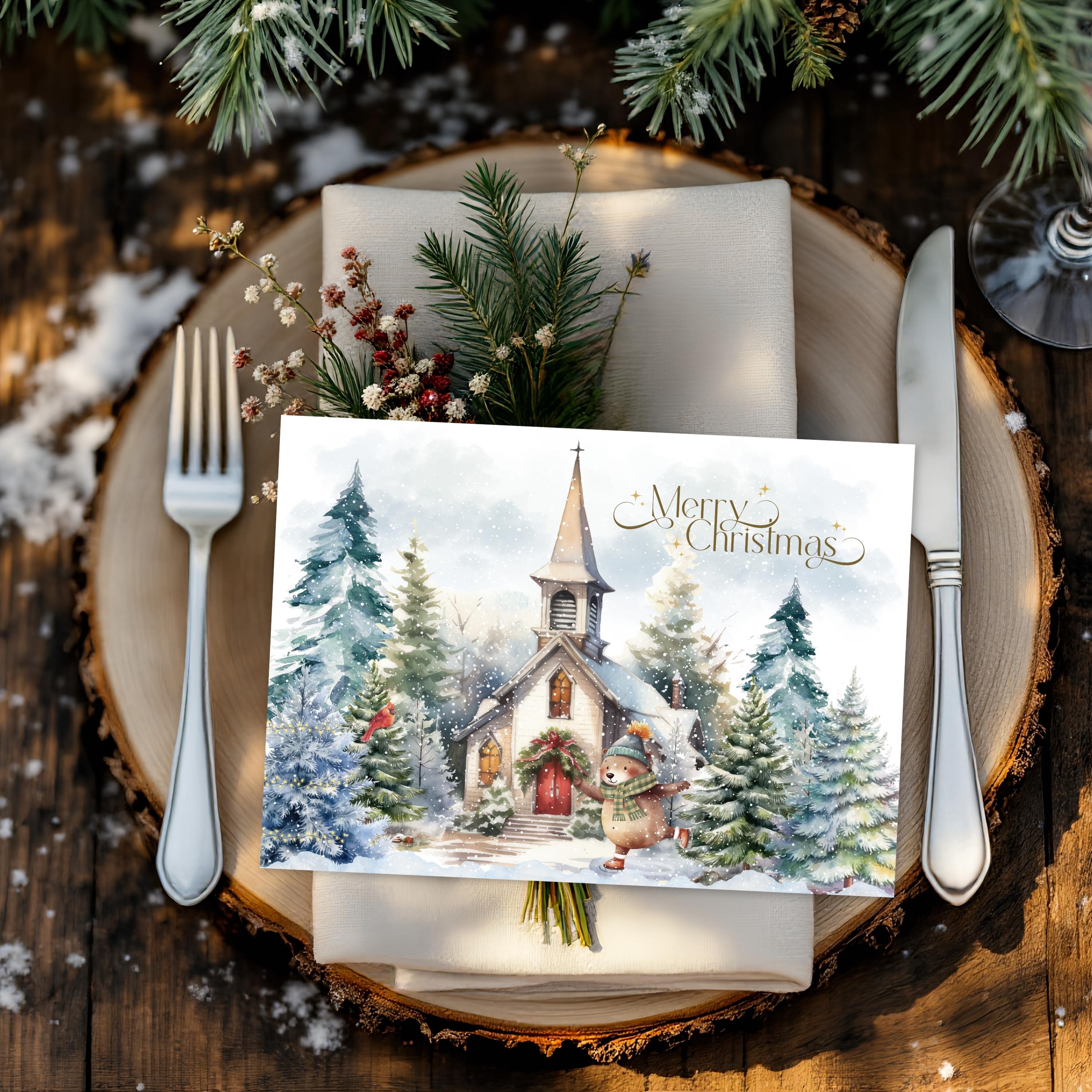 Celebrate the season with this charming winter greeting card featuring a joyful bear skating in front of a snow-dusted chapel. Surrounded by evergreens, twinkling lights, and a bright red cardinal, this festive scene captures the warmth and wonder of Christmas. Elegant “Merry Christmas” lettering adds the perfect finishing touch.