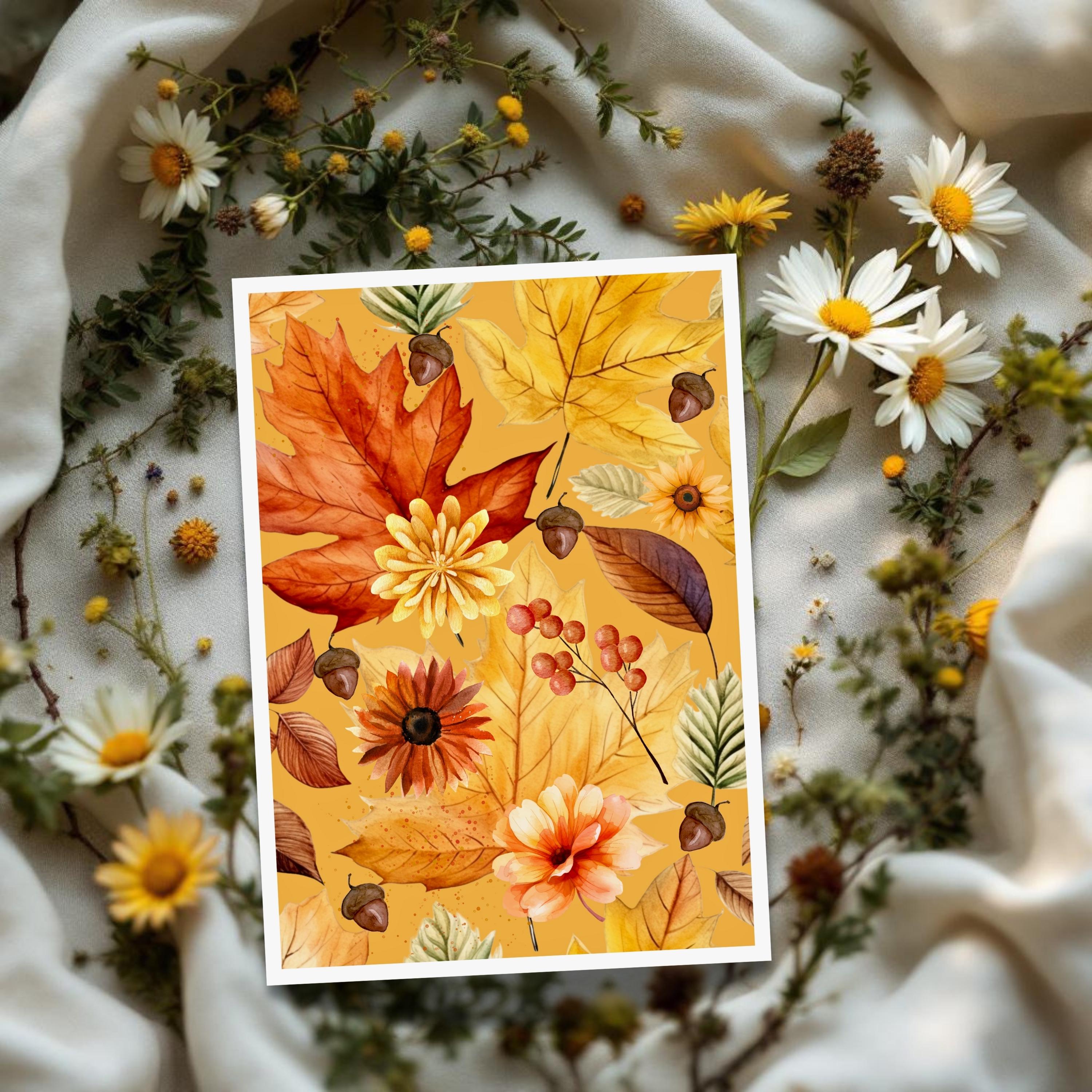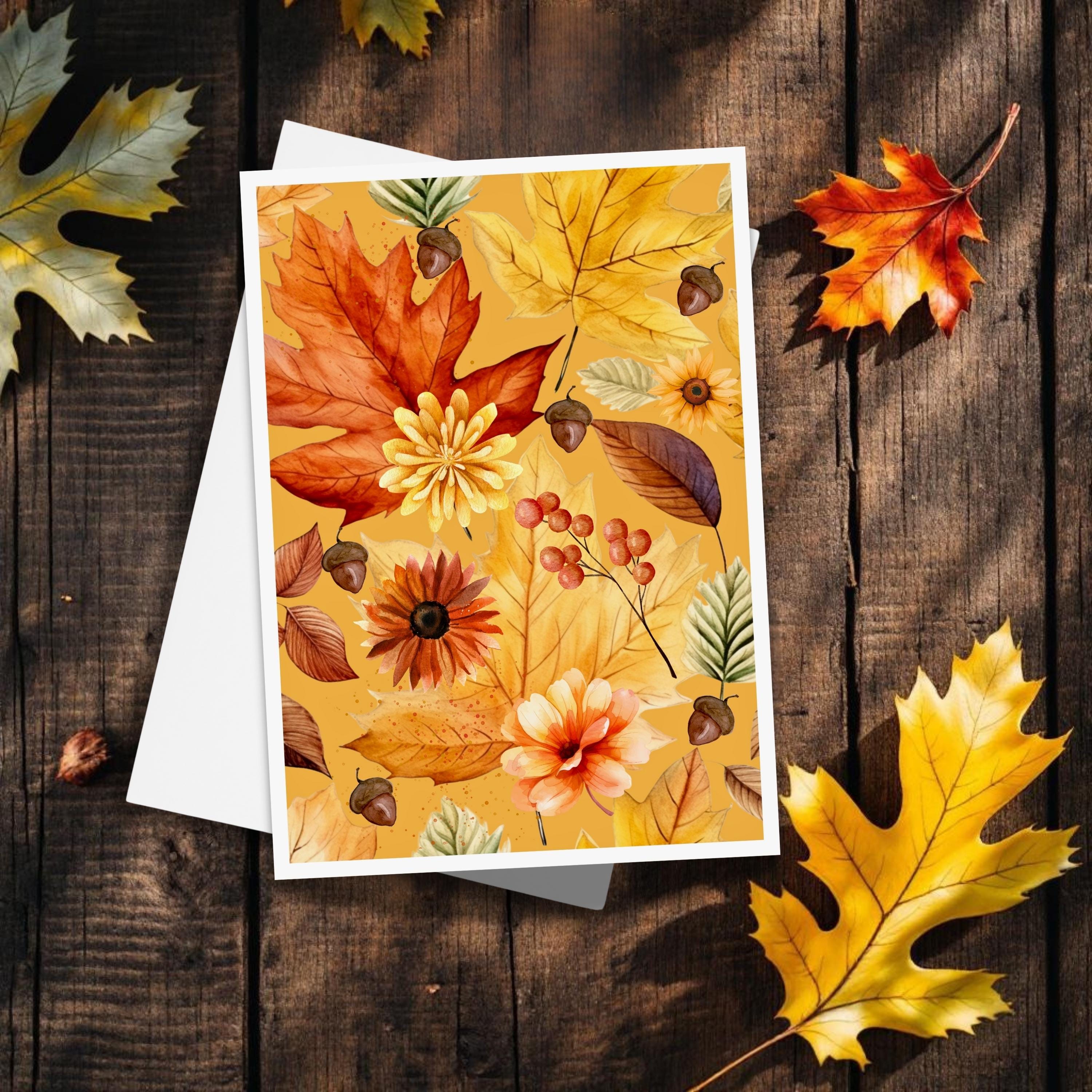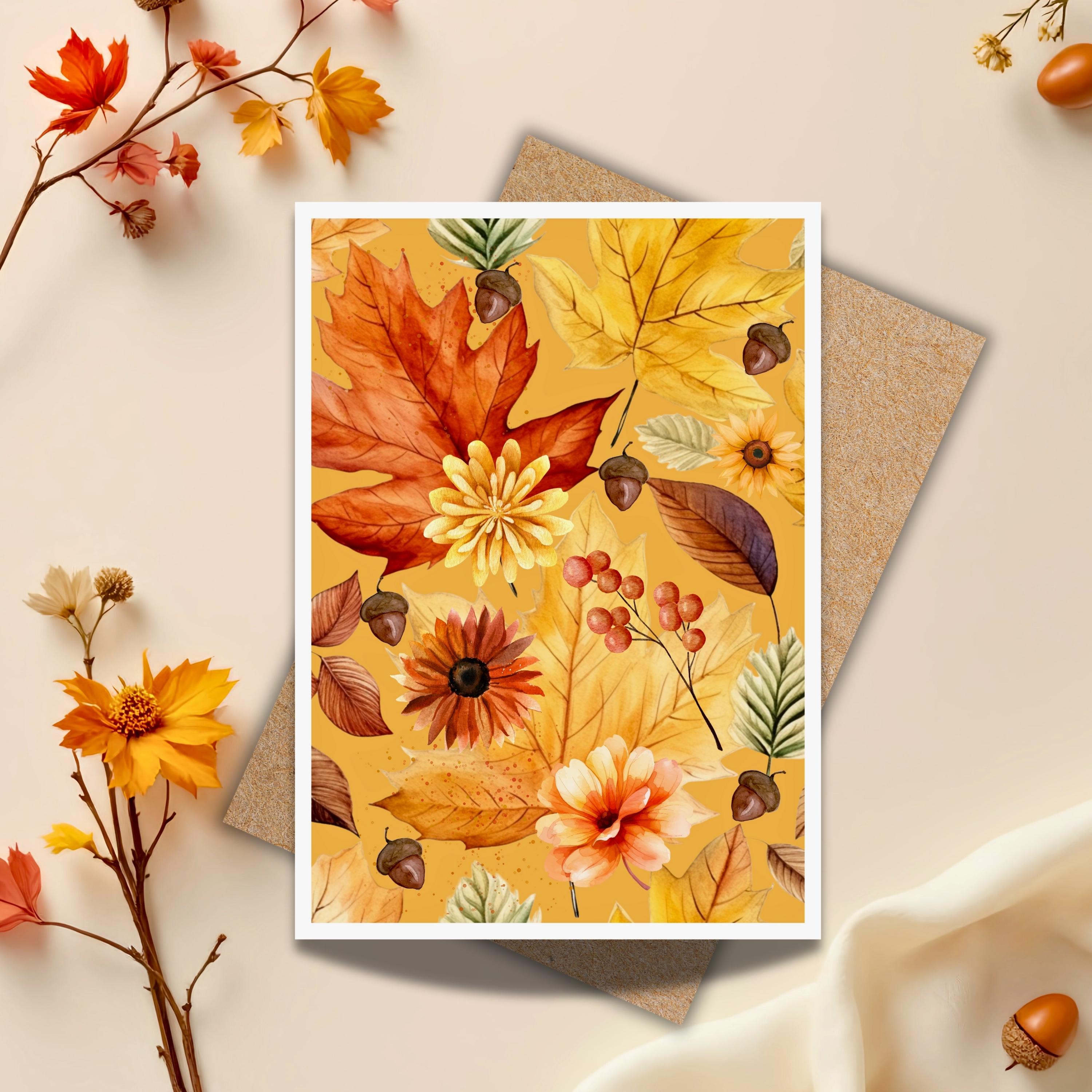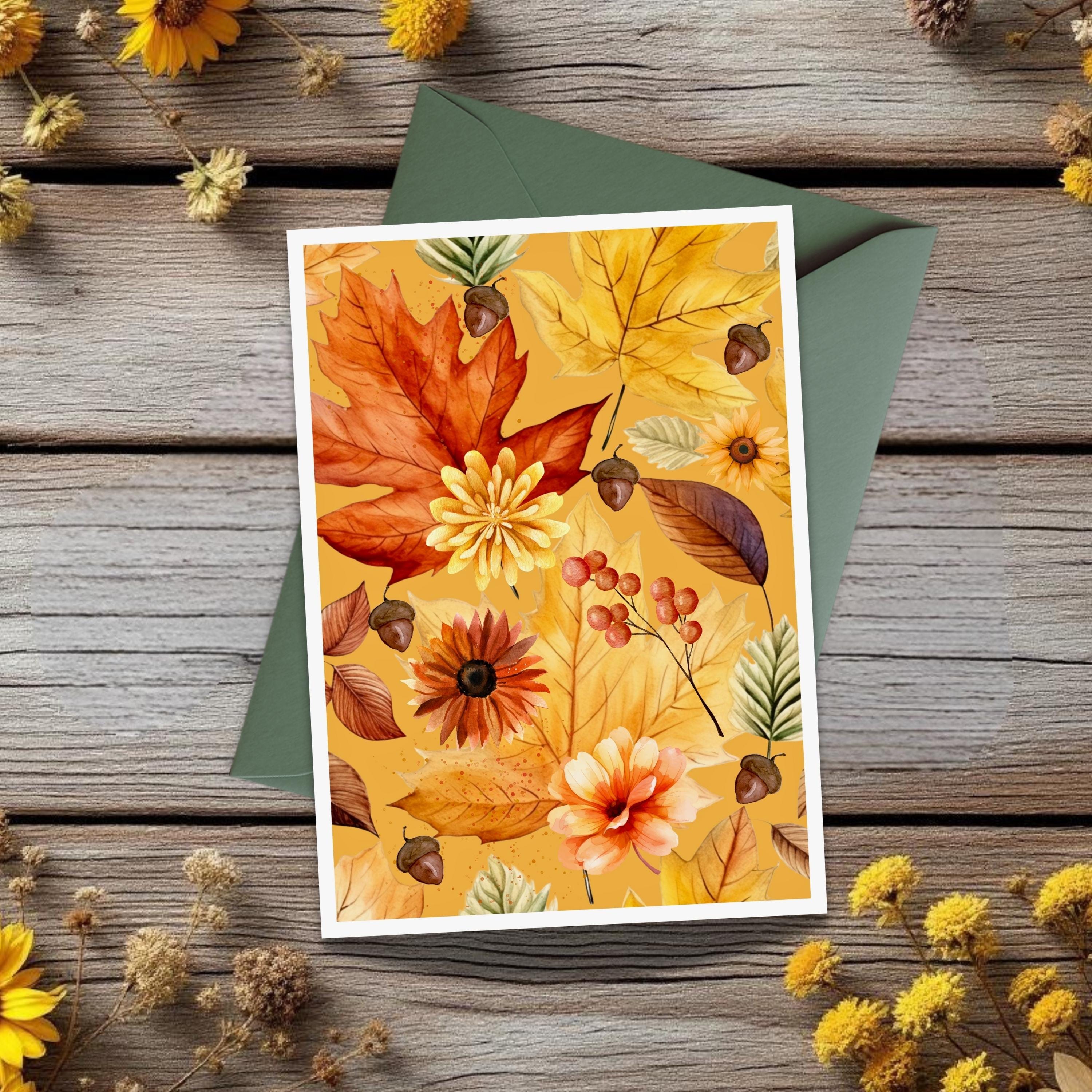 Celebrate the autumn season with our enchanting watercolor greeting card featuring a charming pumpkin patch scene. The artwork beautifully captures pumpkins and delicate botanicals artistically arranged around a rustic wagon, set against a backdrop of trees bursting with vibrant fall leaves. Printed on high-quality cardstock, this card ensures your message stands out with elegance.