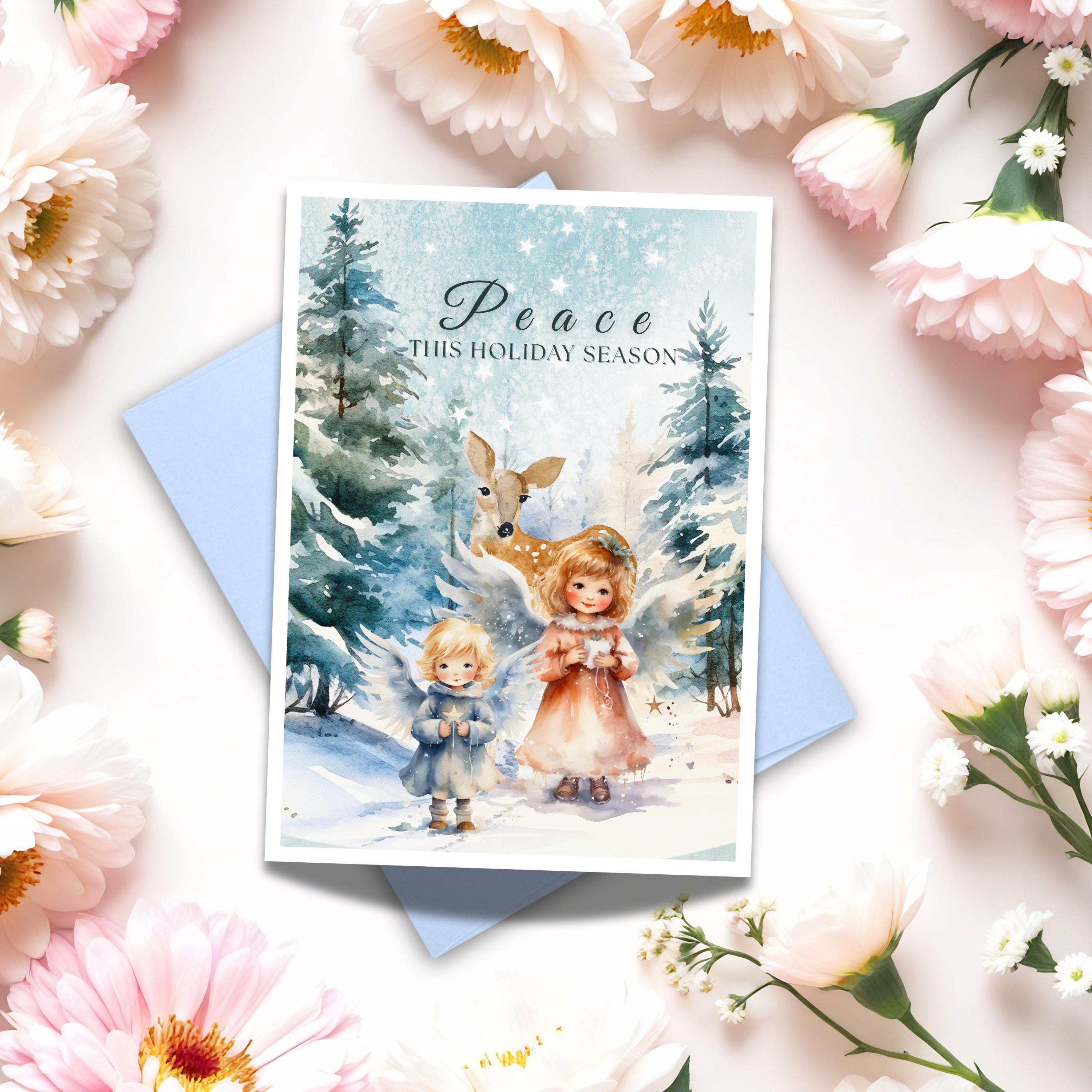 Send heartfelt holiday wishes with this charming Angel Christmas Card, featuring a sweet vintage-inspired angel dressed in festive red with golden hair and wings. Snow falls softly around her, creating a magical winter scene that captures the spirit of Christmas.