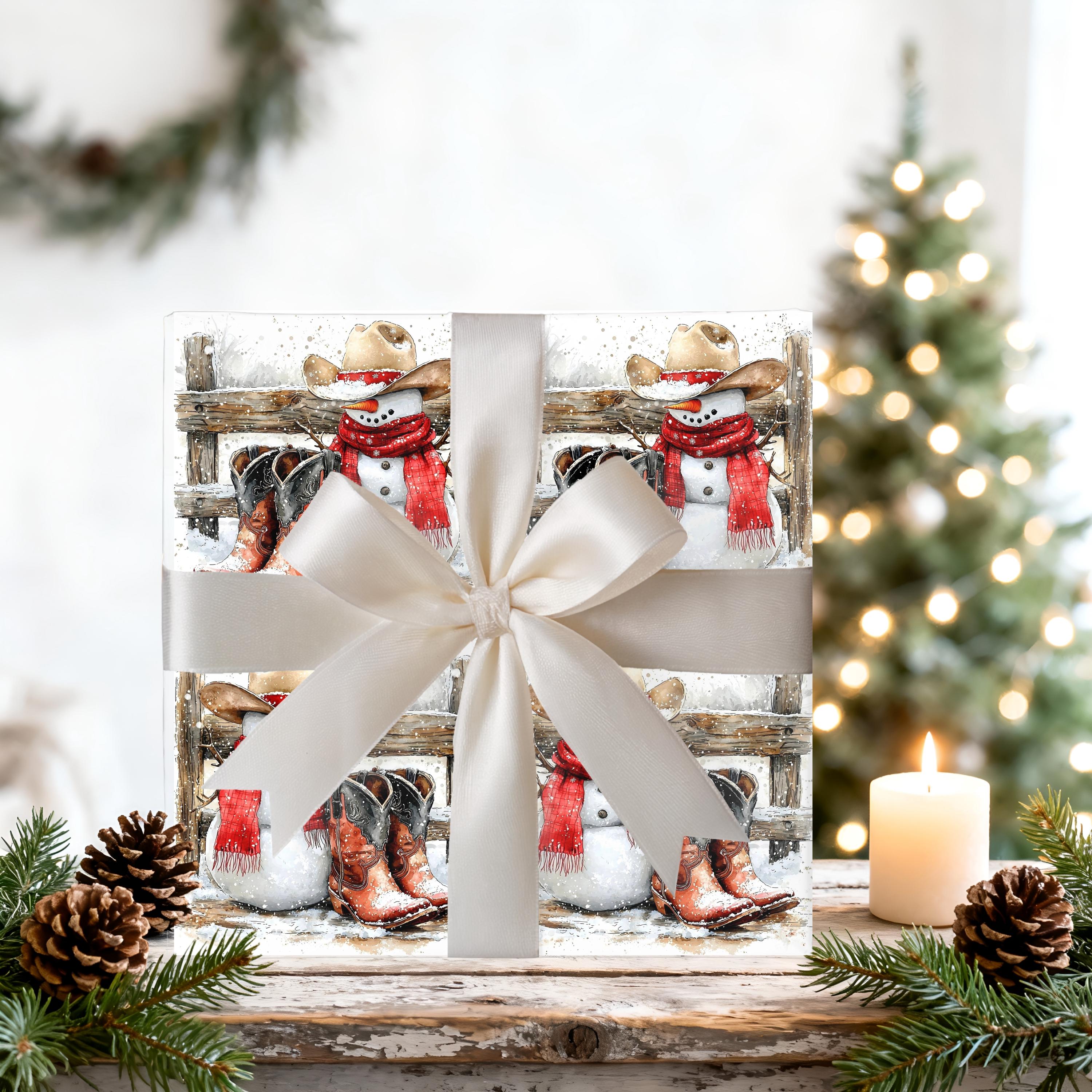 Bring western charm to your Christmas gifts with our Cowboy Snowman Wrapping Paper. Featuring a festive snowman in boots, hat, and scarf, this rustic farmhouse design is perfect for anyone who loves cowboy style or country living. Professionally printed on high-quality, glossy wrapping paper — sturdy enough for premium holiday gifting.