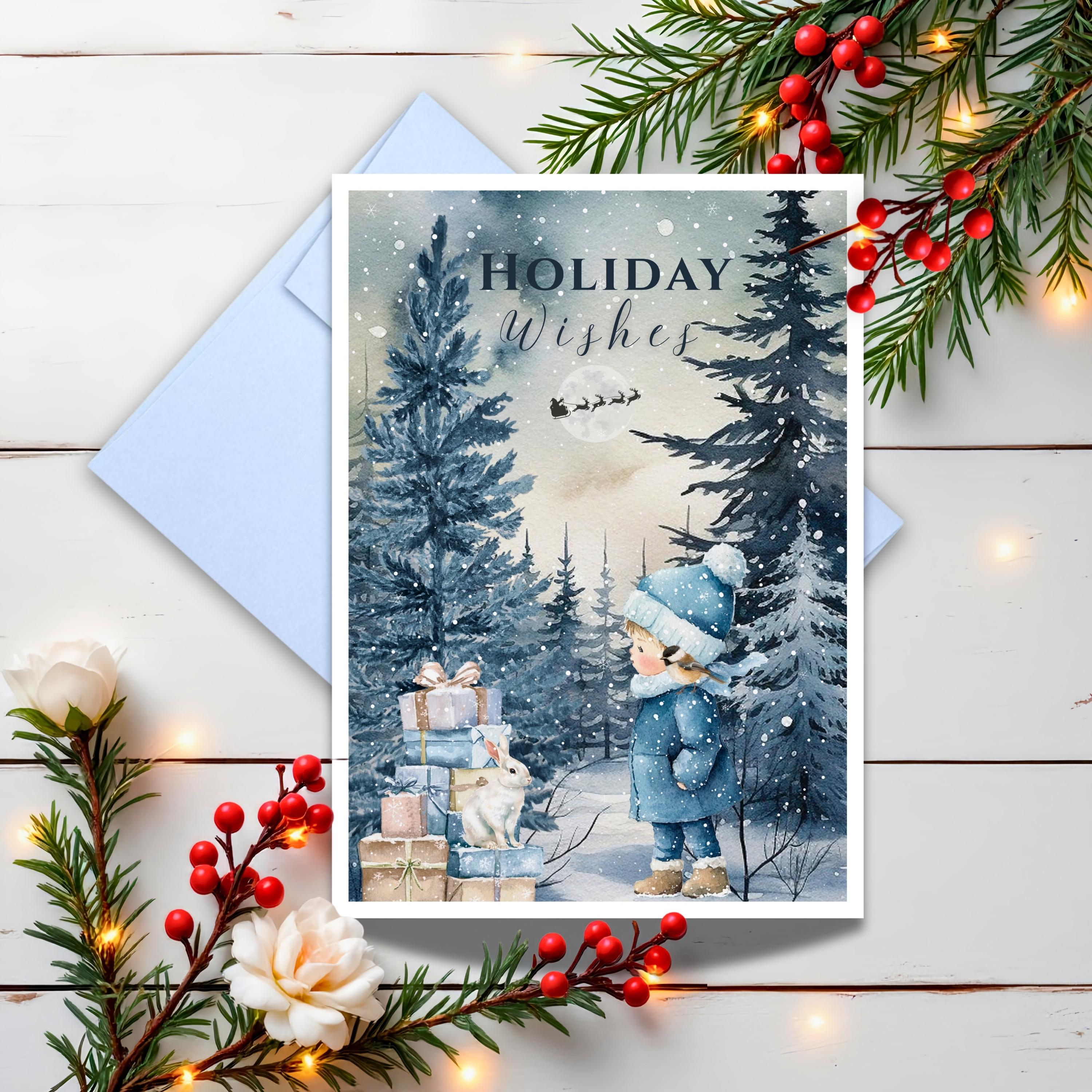 Send a touch of storybook charm this season with our Holiday Wishes greeting card, featuring a whimsical watercolor illustration of a child in a snowy forest, a curious rabbit by stacked gifts, and Santa’s sleigh gliding across the winter moon. Perfect for spreading joy, this enchanting card captures the wonder of Christmas with a cozy woodland feel.