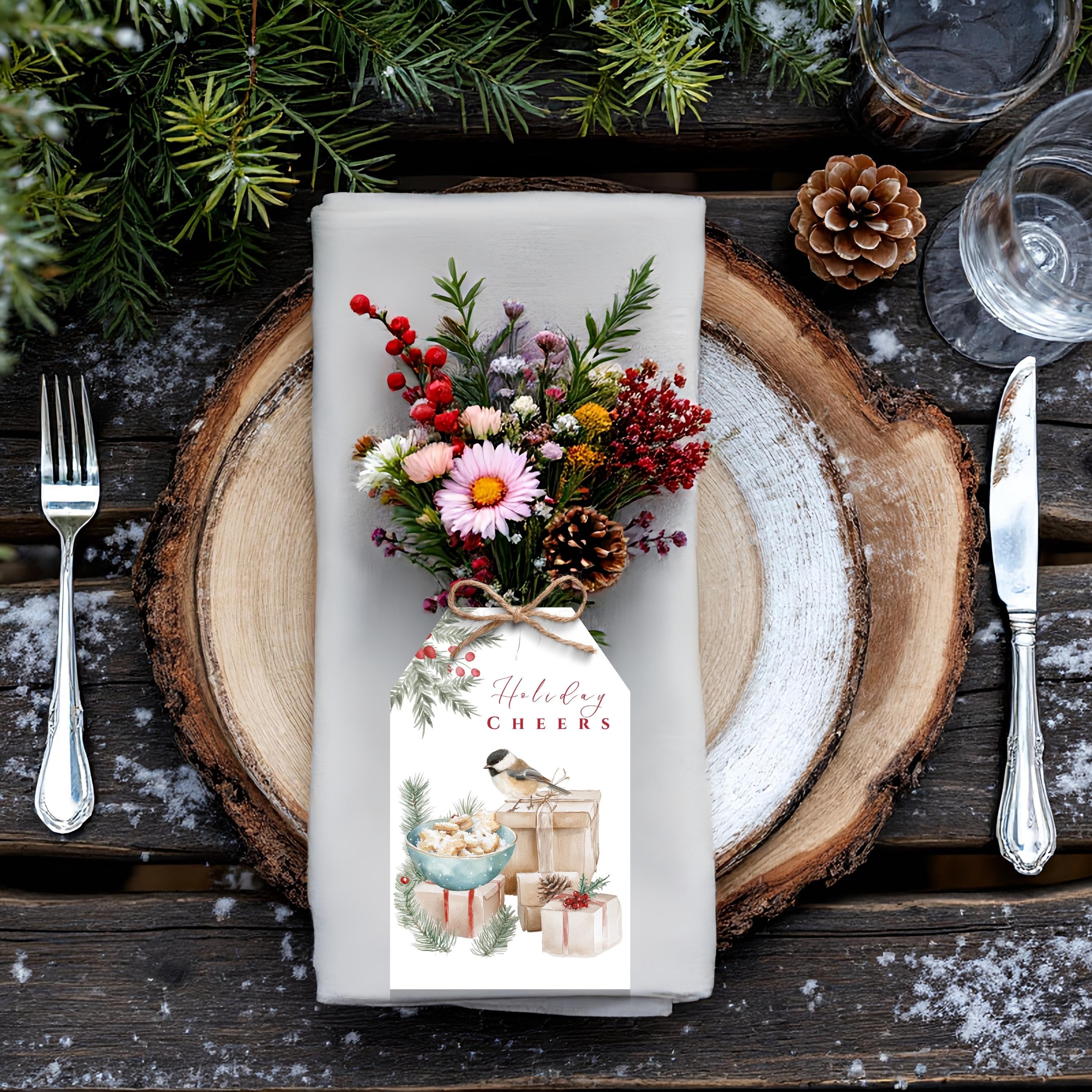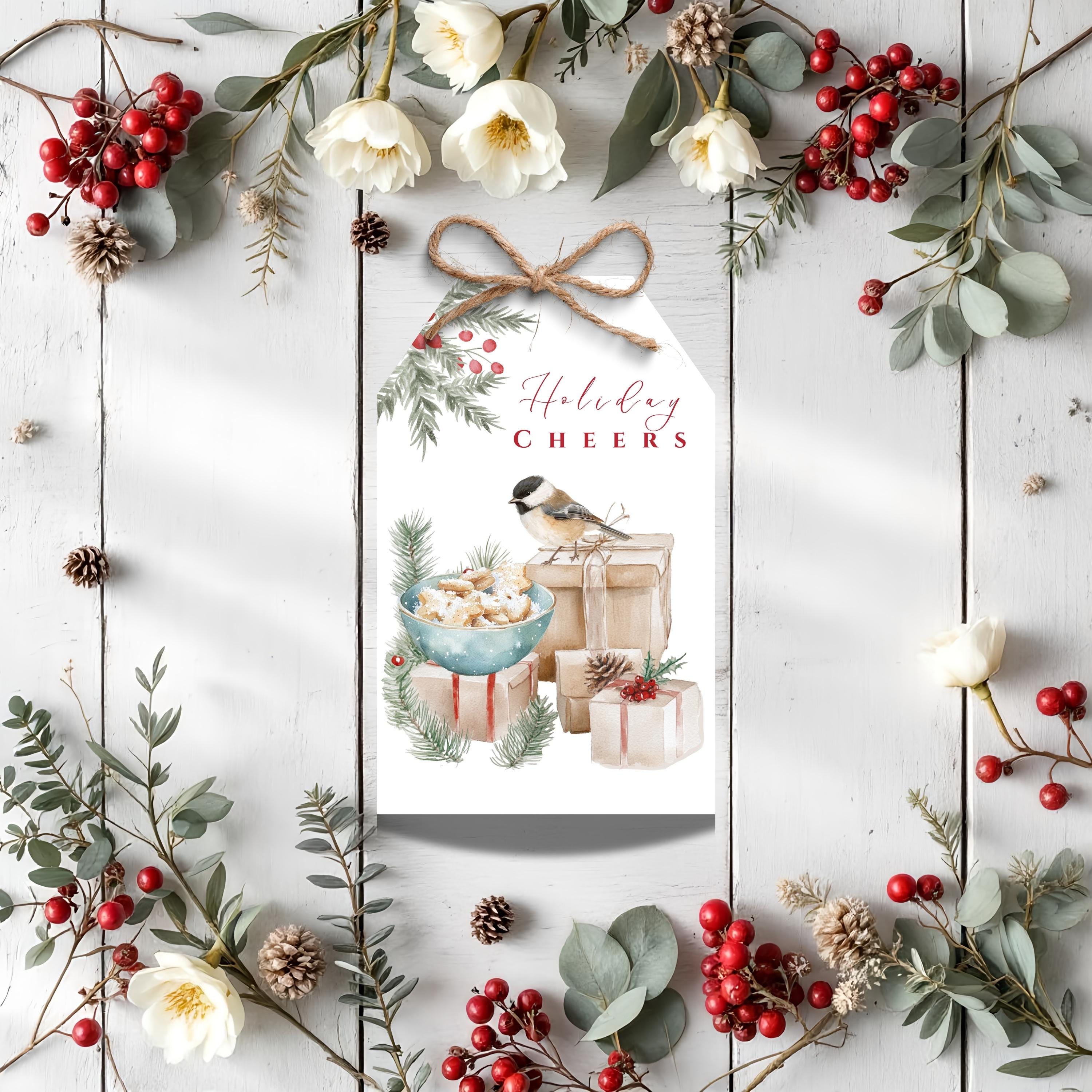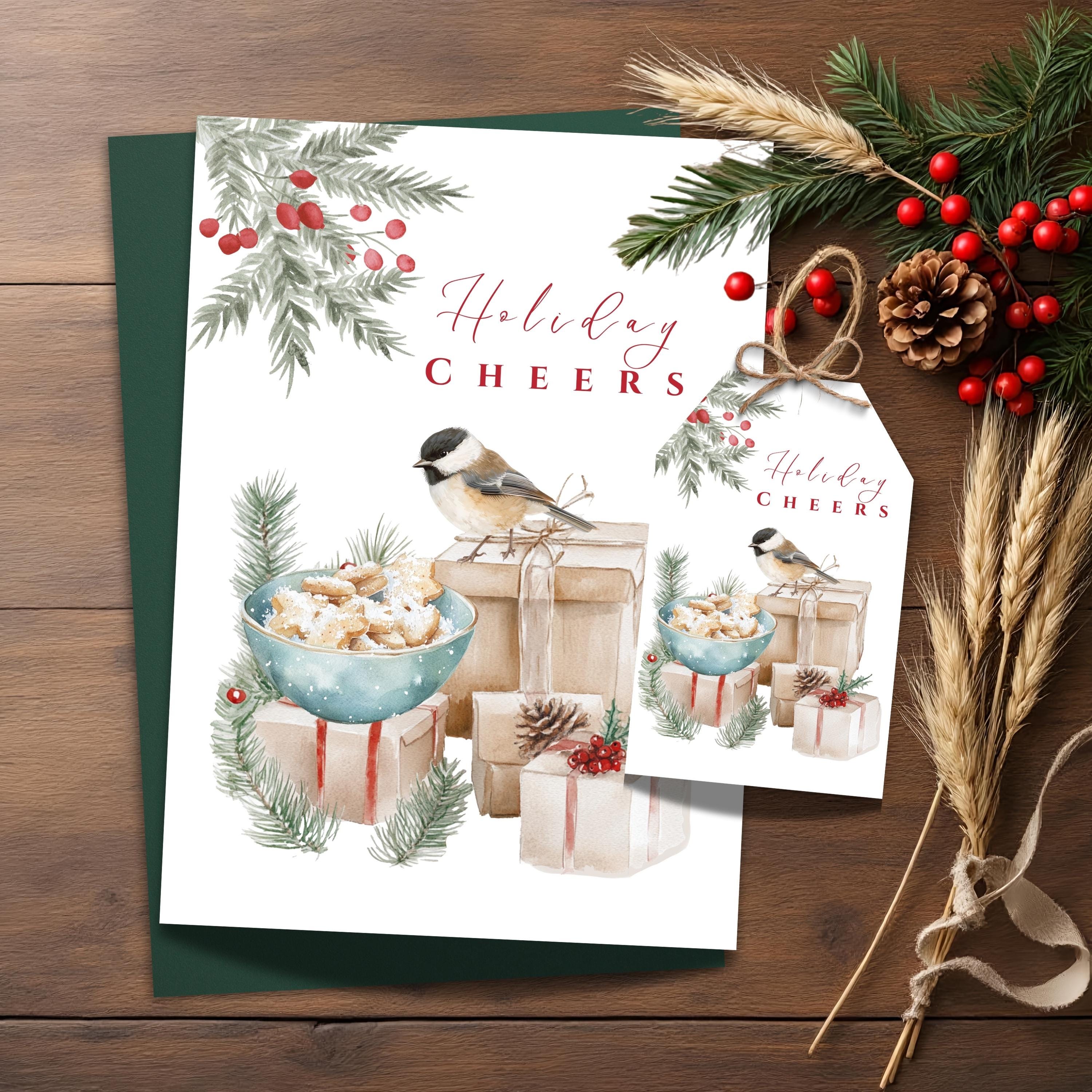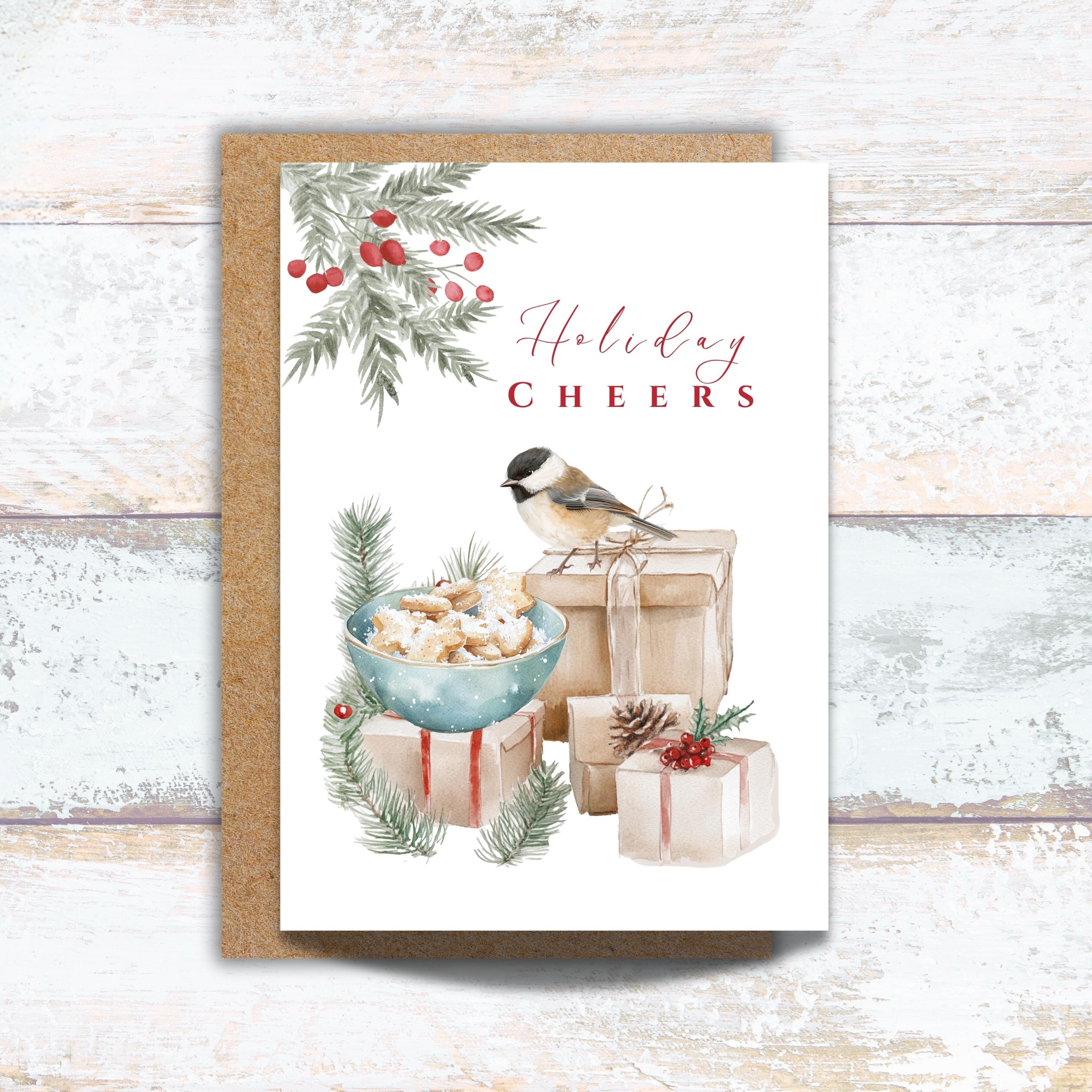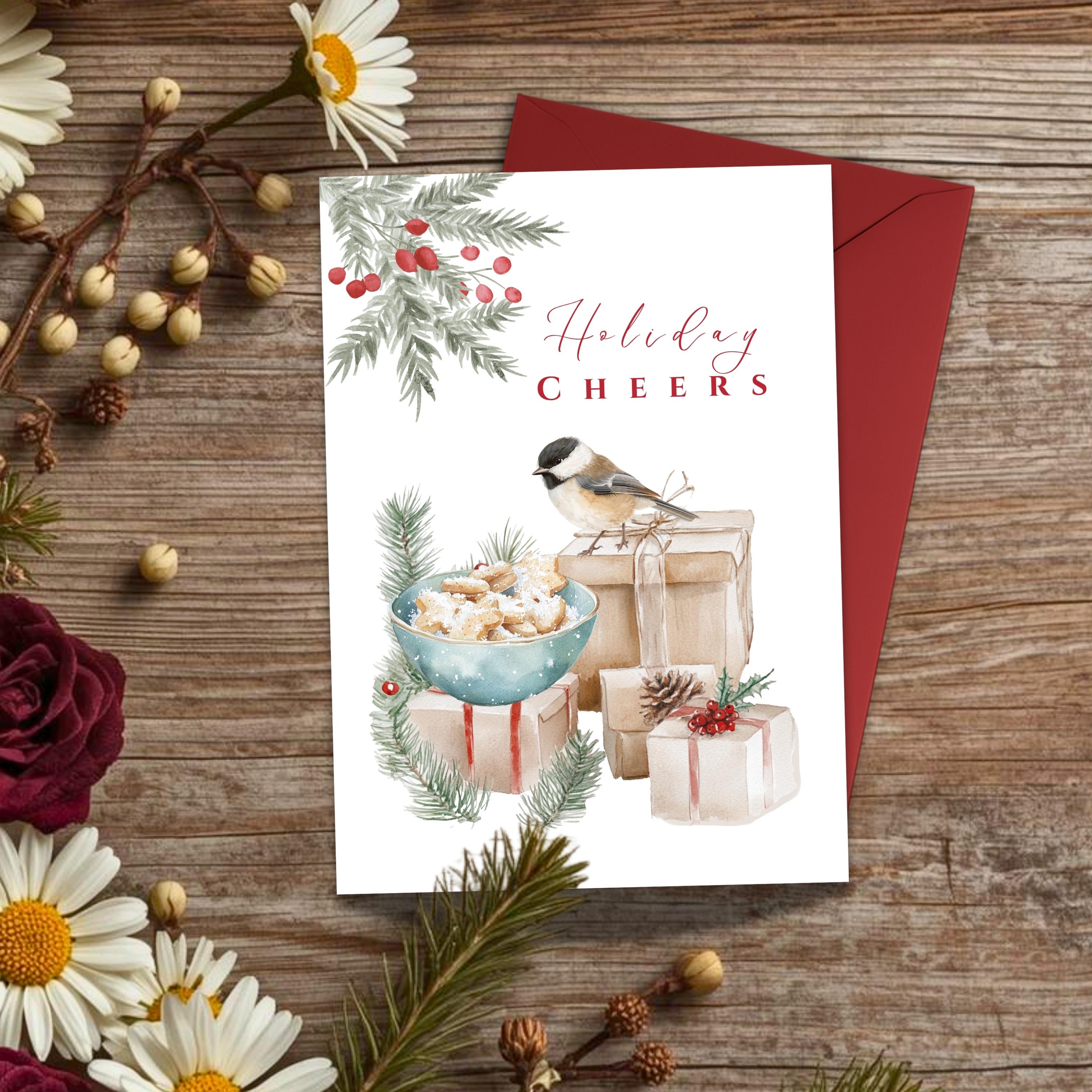 Share the warmth of the season with this charming holiday greeting card. A sweet chickadee perches on wrapped gifts beside a bowl of cookies, framed with pine greenery and festive berries. The watercolor design pairs beautifully with the “Holiday Cheers” message, making it perfect for sending holiday wishes, gifting with presents, or displaying in a boutique.