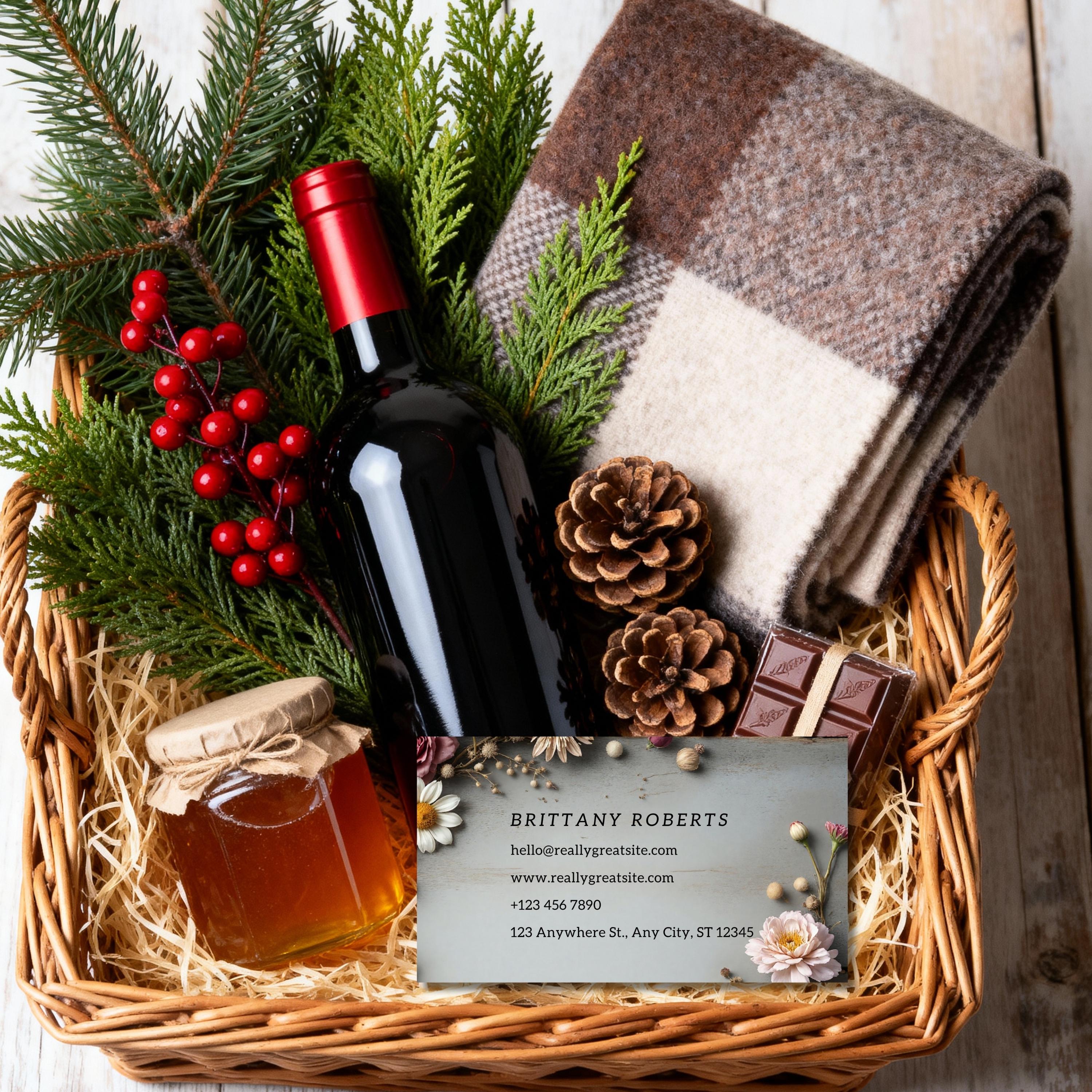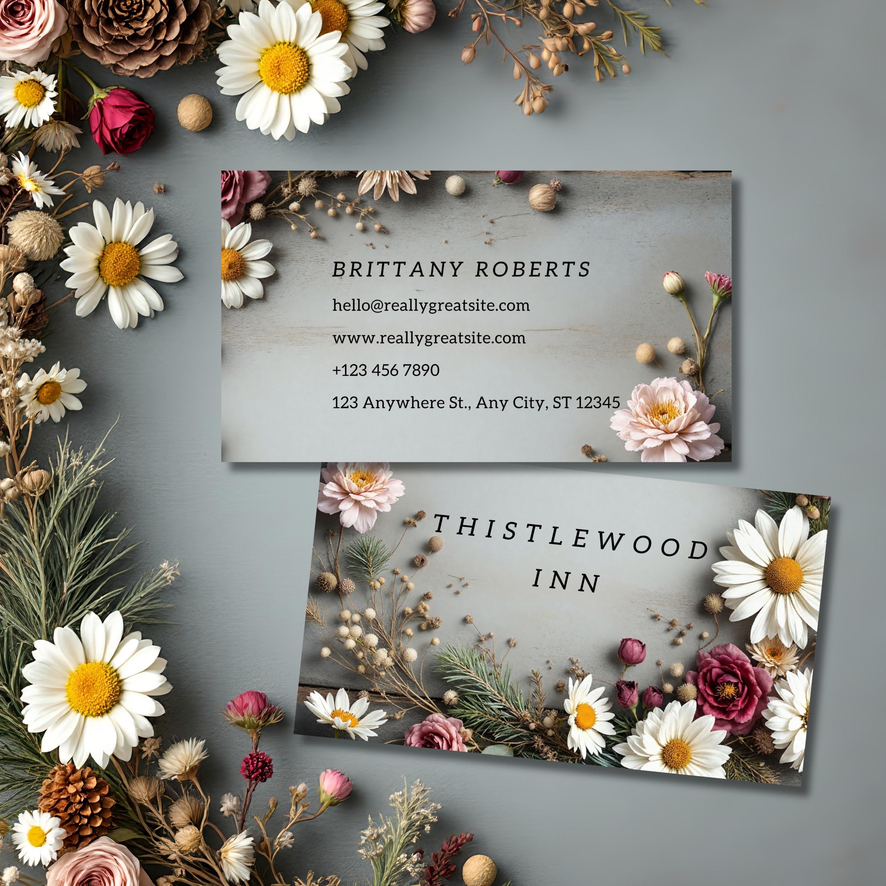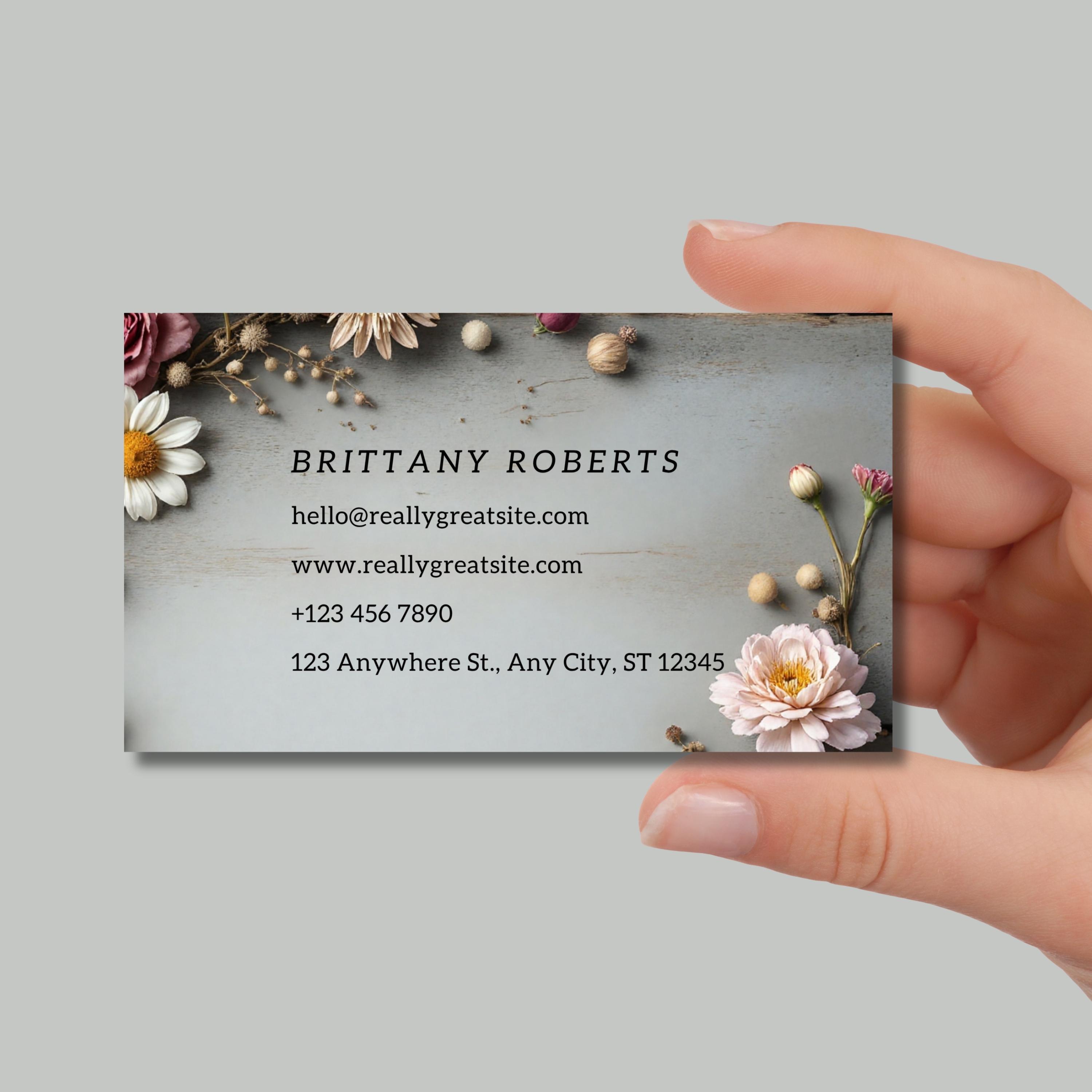 The design features pressed-style florals, soft rustic wood tones, and elegant typography for a balance of professional polish and vintage charm. Double-sided printing highlights your business name or venue on the front and your personalized details on the back.