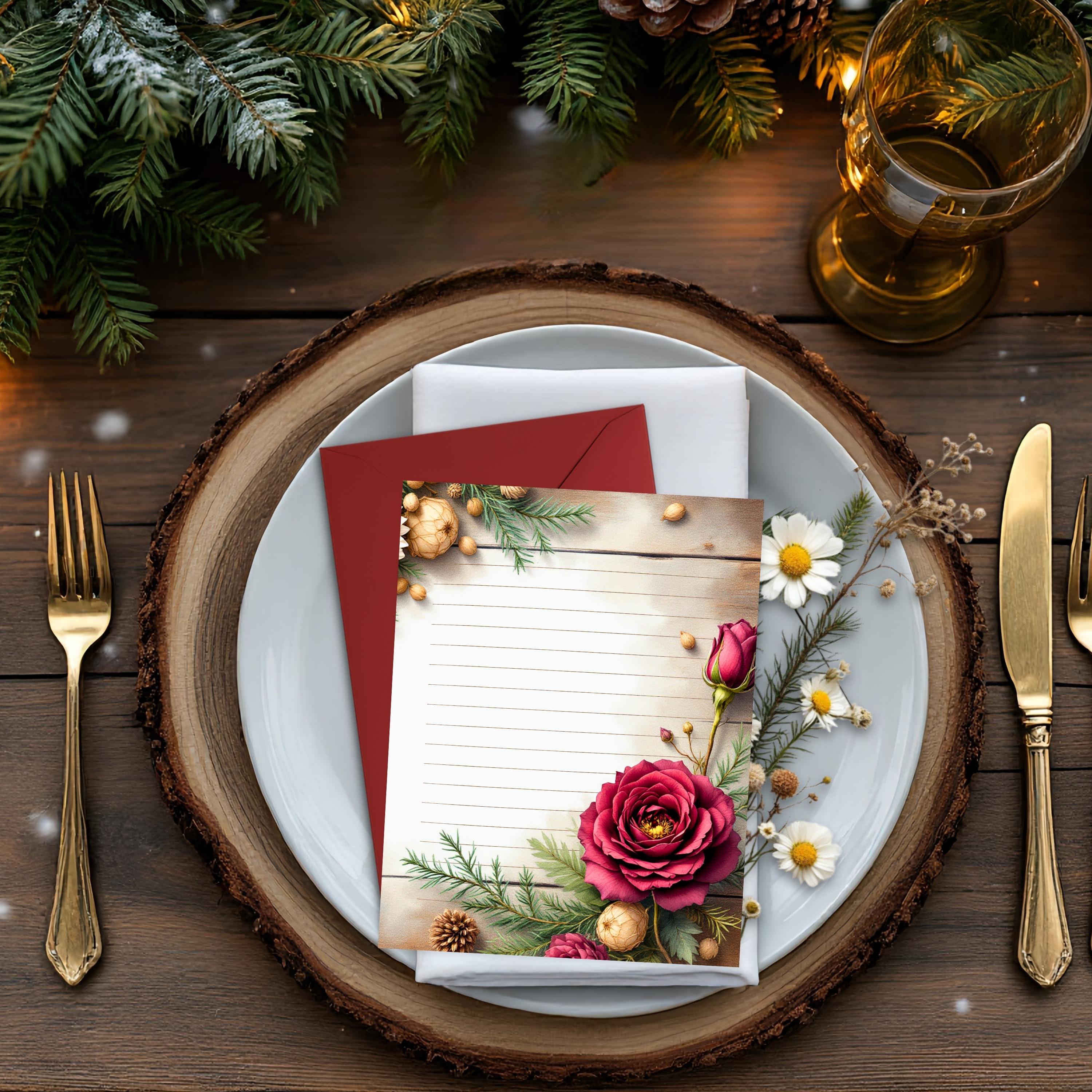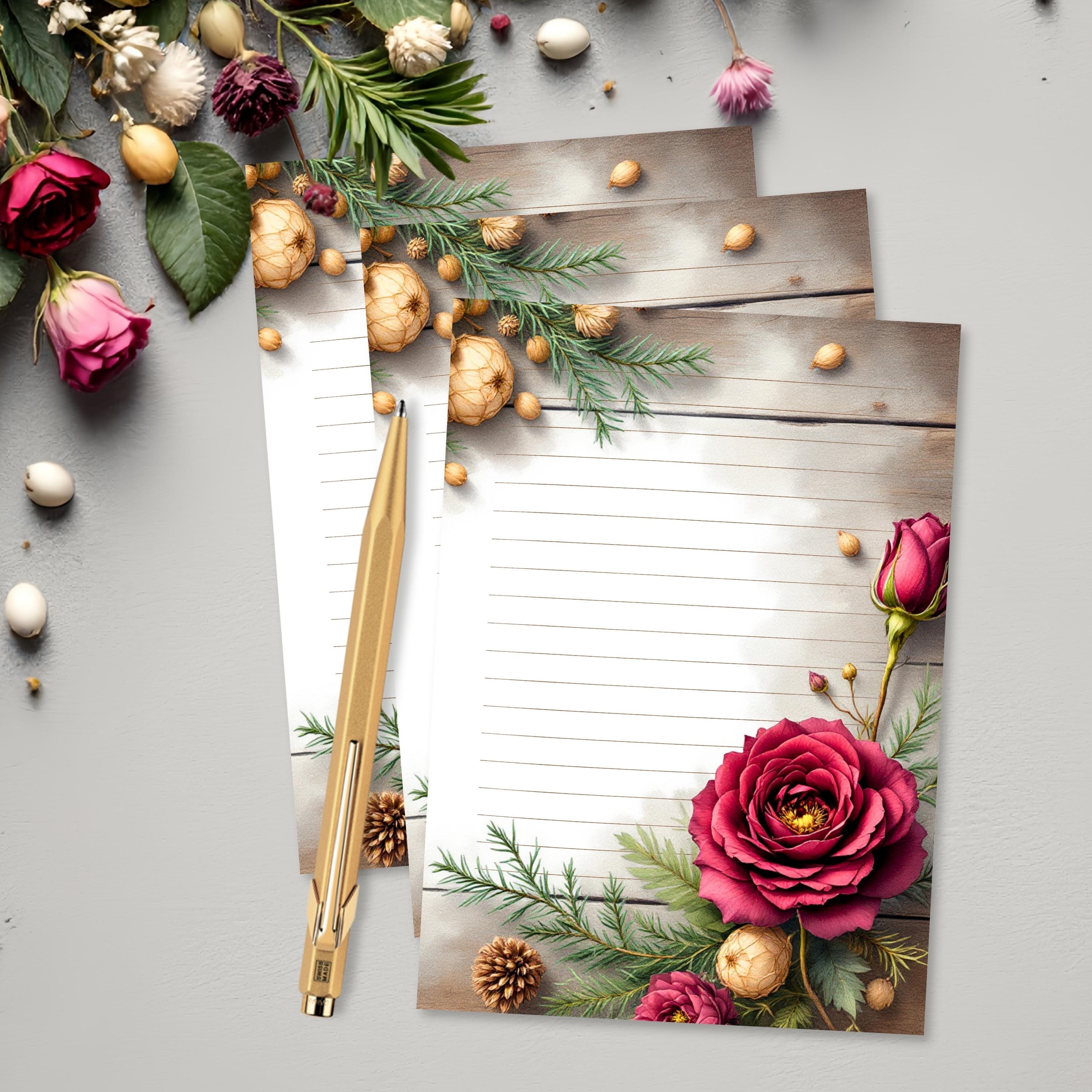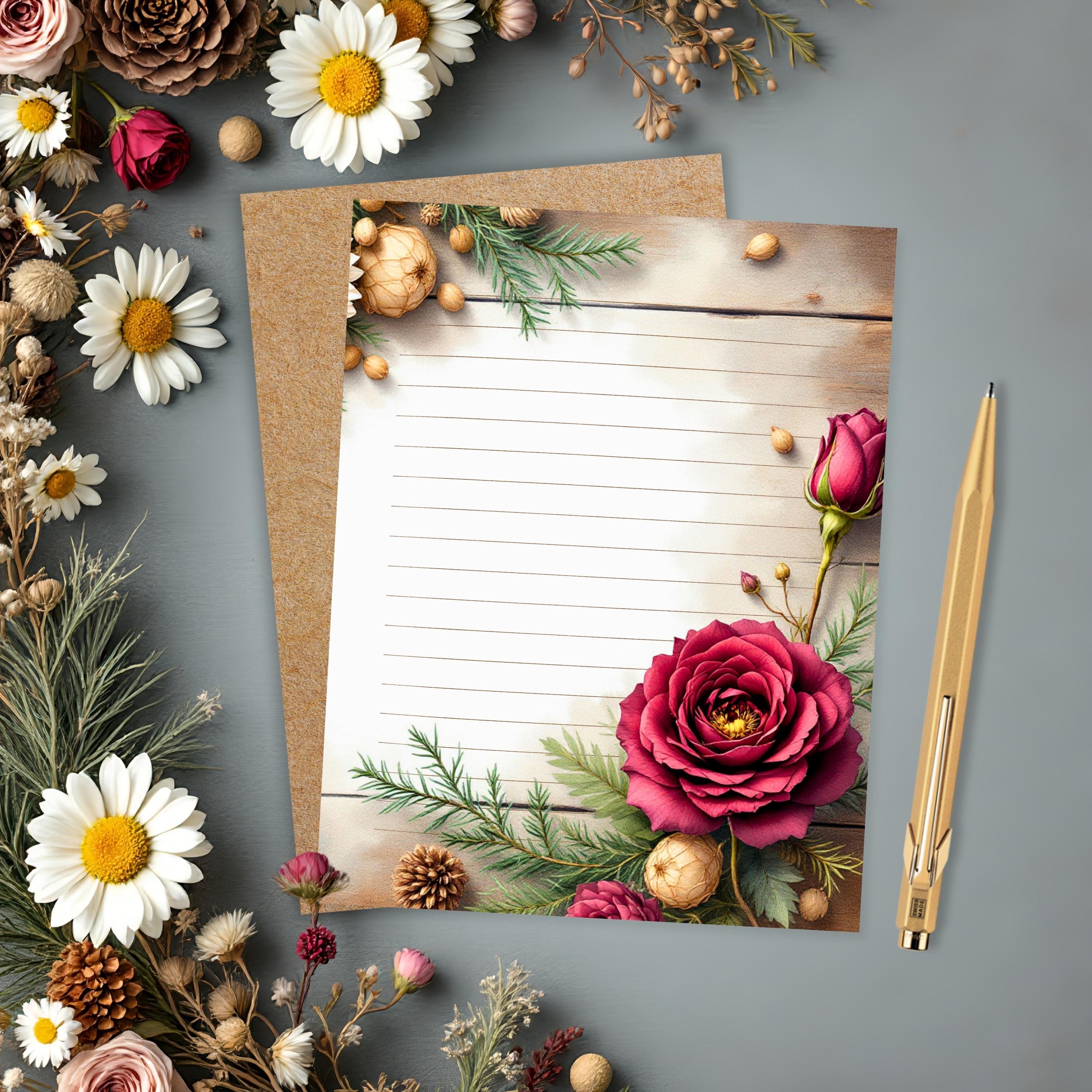 Write beautifully and thoughtfully with our Vintage Rose Stationery Set, featuring lined 5x7 sheets adorned with deep rose blooms, pine sprigs, and natural seed accents. Each page captures the romance of old-world correspondence — perfect for letter writing, journaling, or adding to gift enclosures.