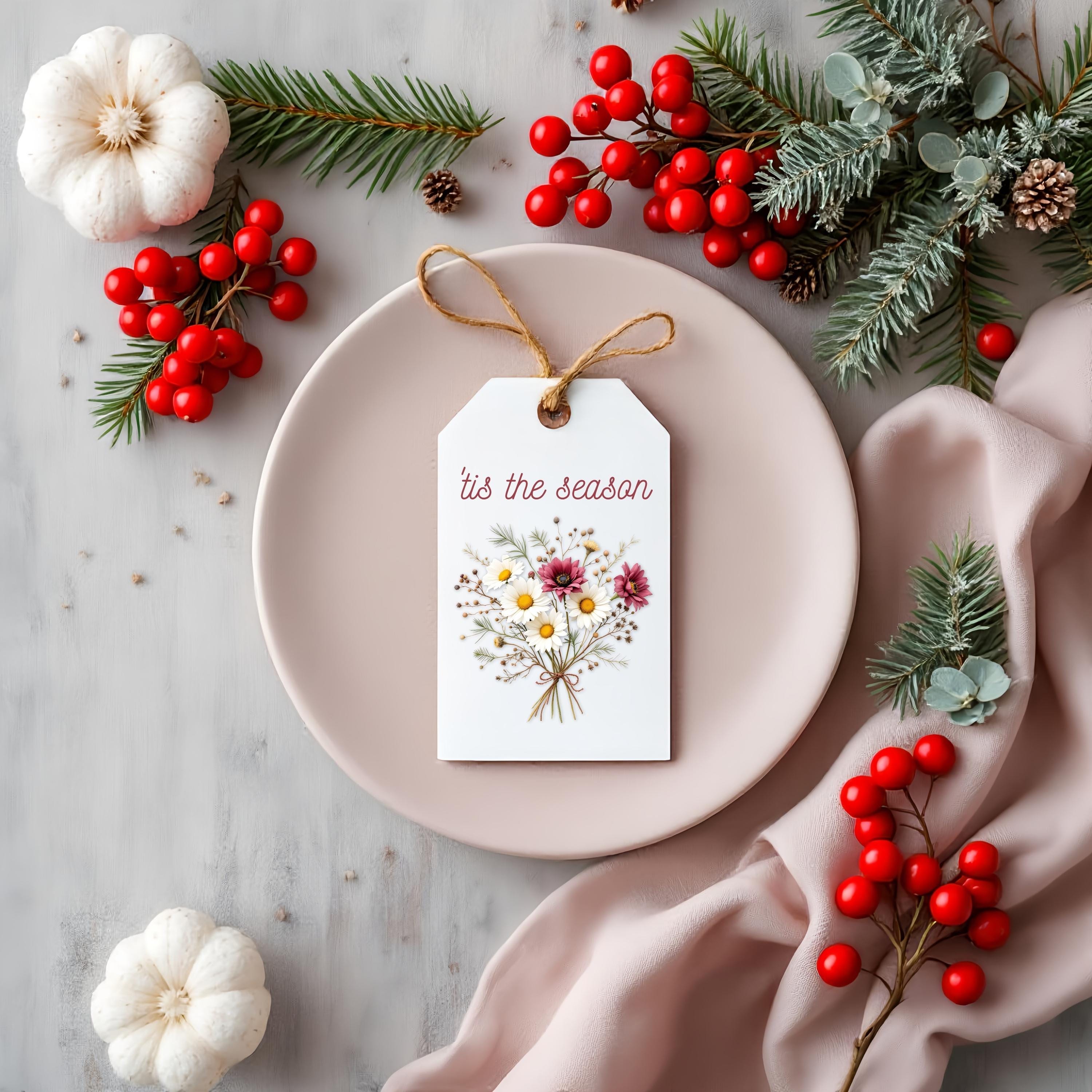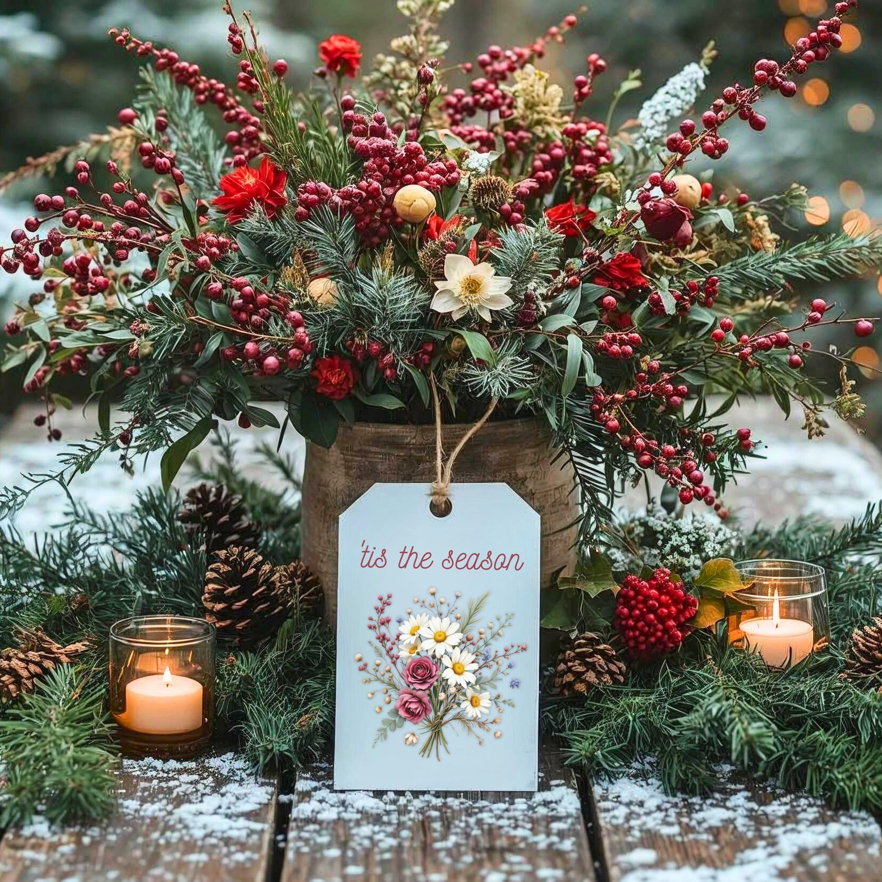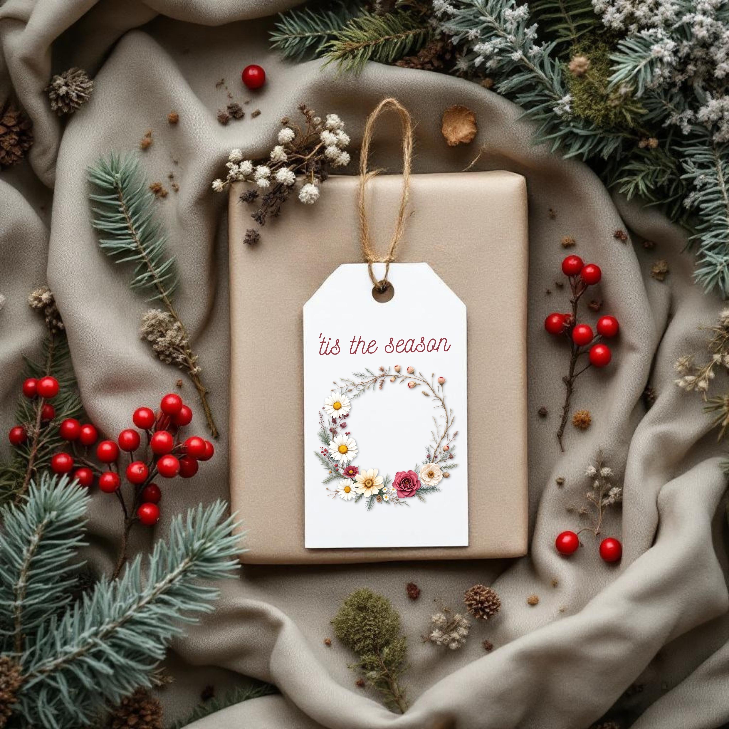 Add a touch of rustic elegance to your holiday wrapping with our ‘Tis the Season Gift Tags, featuring festive wildflower bouquets and winter wreaths in soft seasonal tones. Perfect for adorning gifts, baked goods, or boutique packaging, each tag captures the cozy beauty of a woodland Christmas.