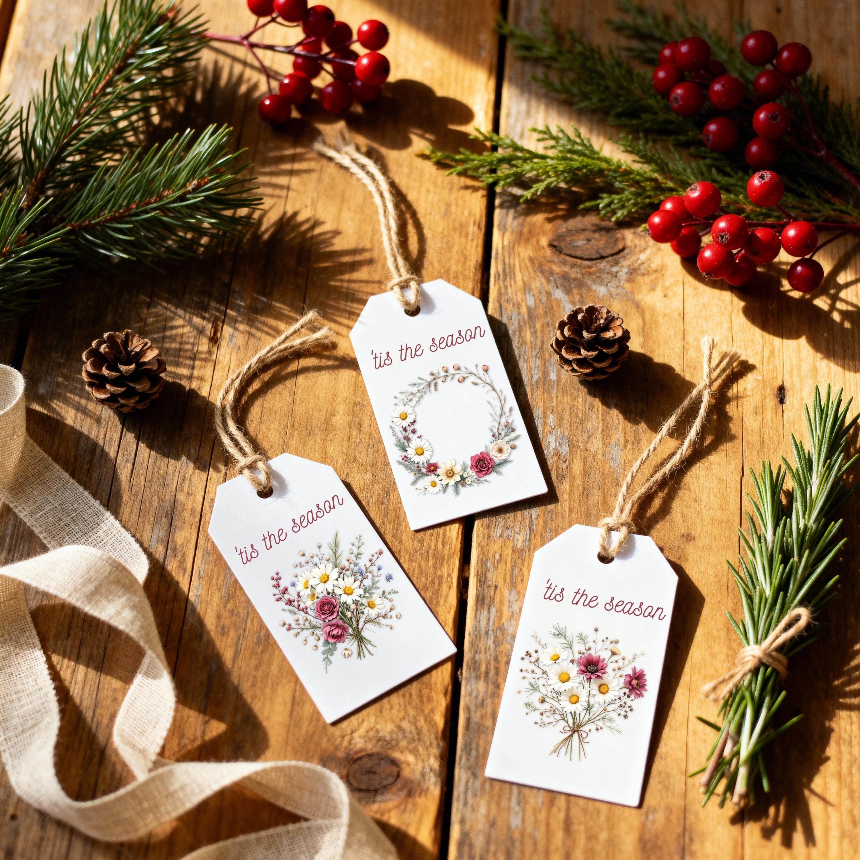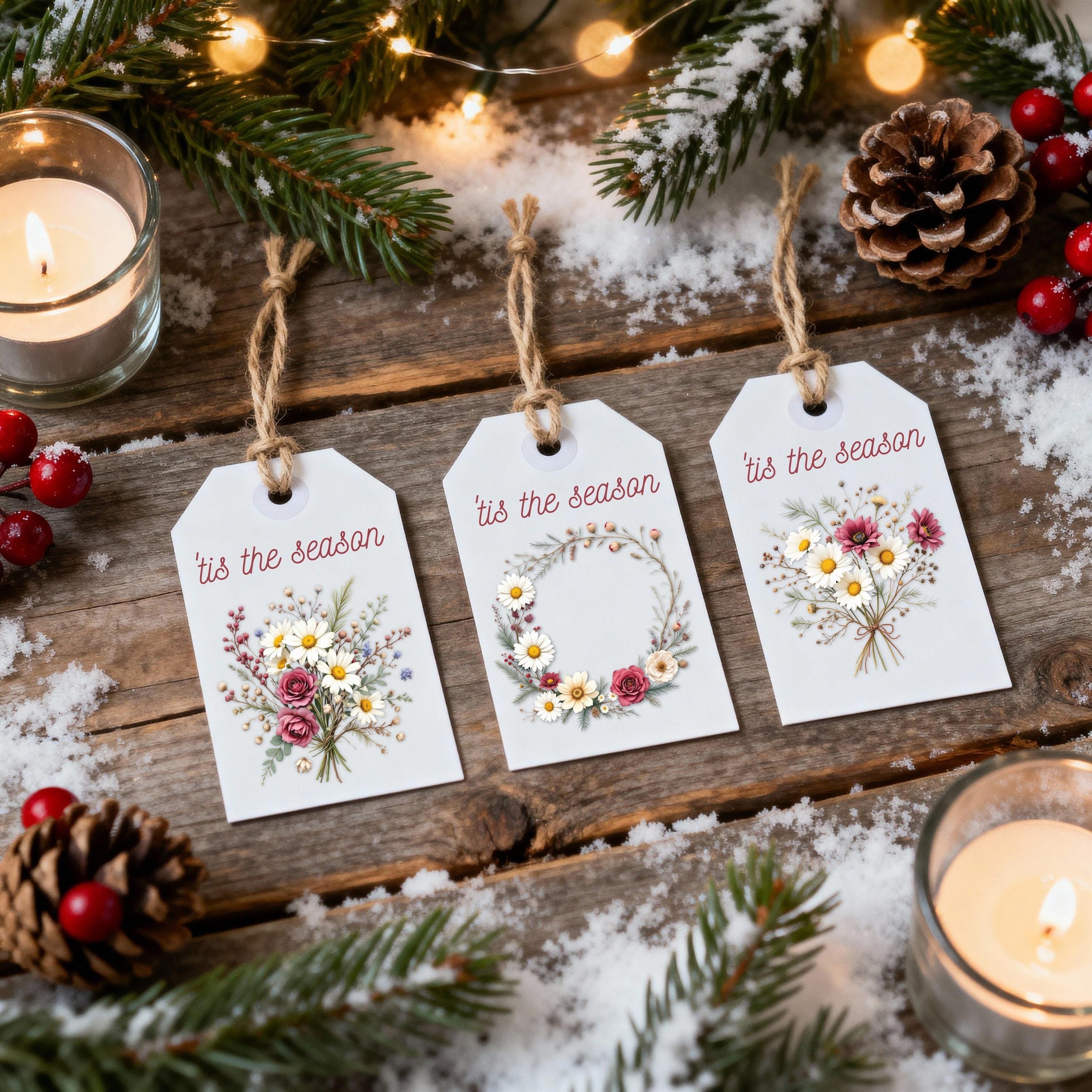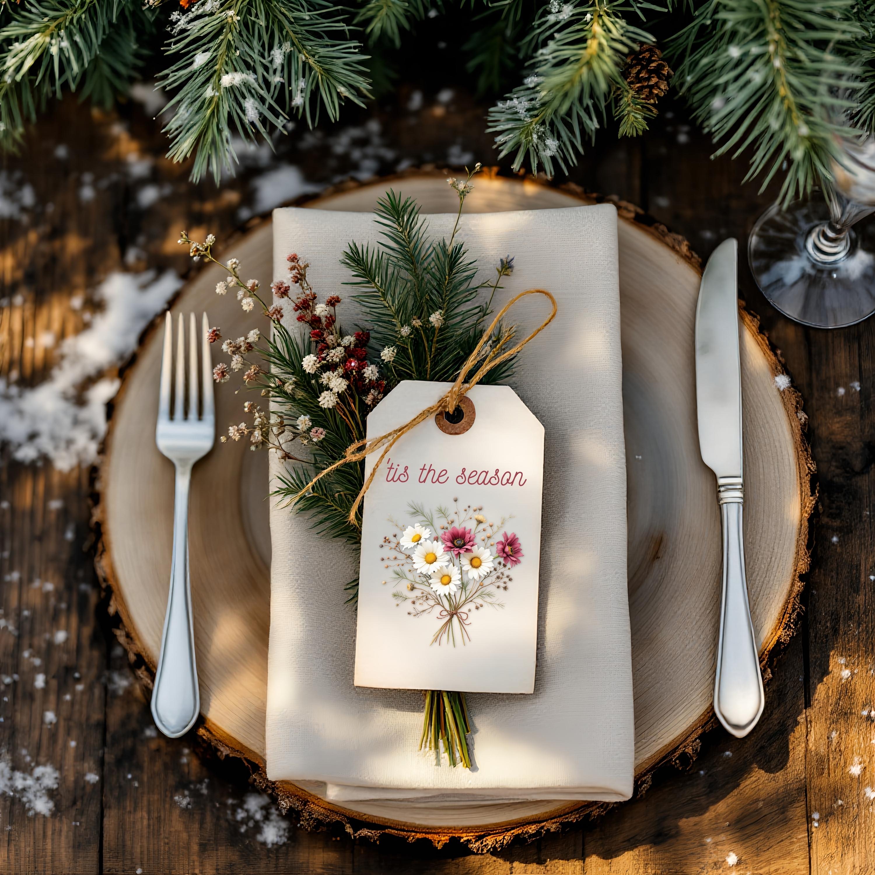 Add a touch of rustic elegance to your holiday wrapping with our ‘Tis the Season Gift Tags, featuring festive wildflower bouquets and winter wreaths in soft seasonal tones. Perfect for adorning gifts, baked goods, or boutique packaging, each tag captures the cozy beauty of a woodland Christmas.