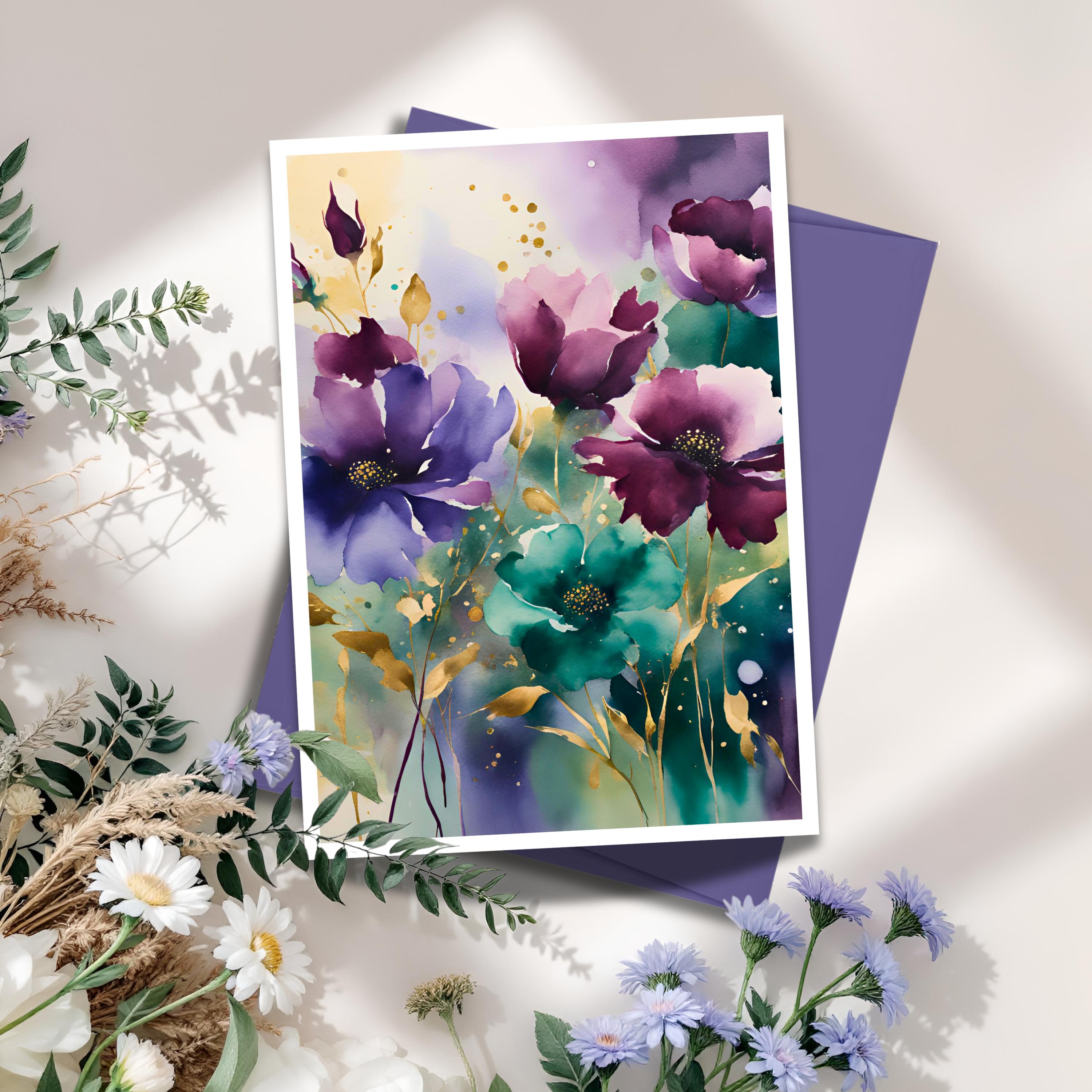 Send something truly special with this Burgundy Bloom Greeting Card, featuring watercolor florals in deep burgundy, violet, and teal tones with golden accents. Each card feels like a small piece of painted art — ideal for heartfelt notes, special occasions, or framing as a keepsake.