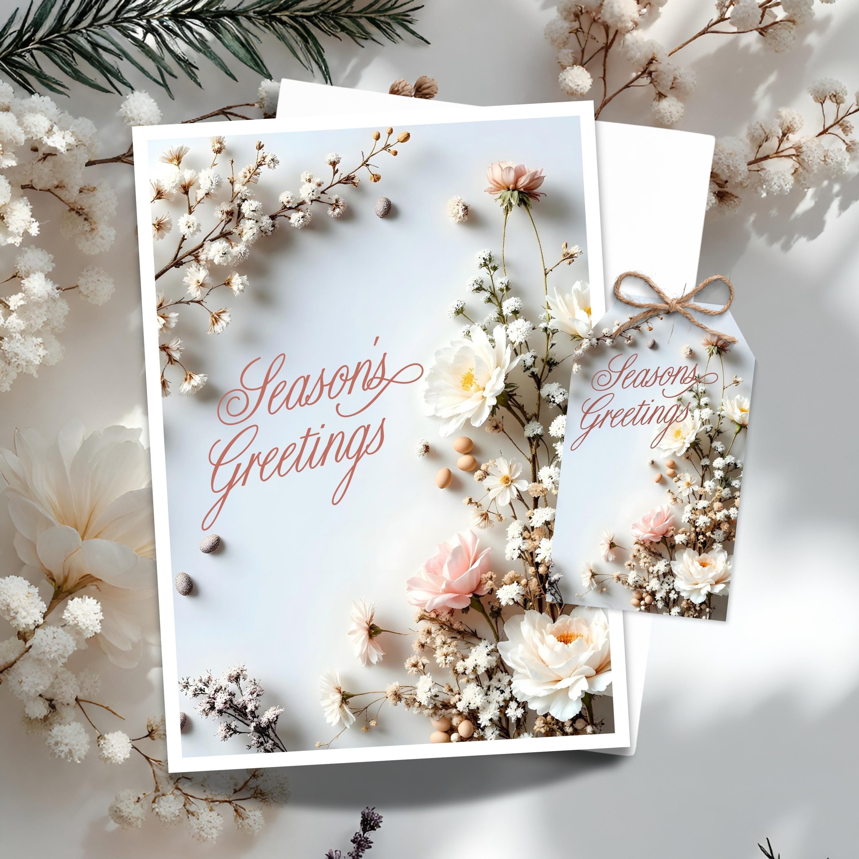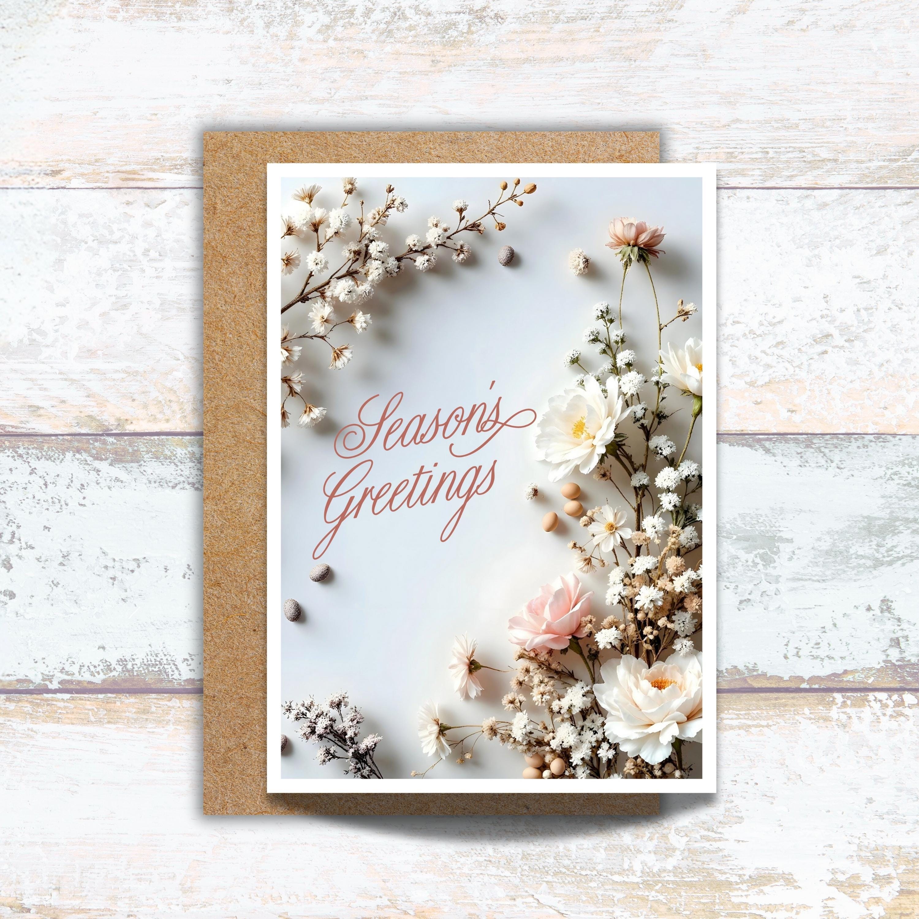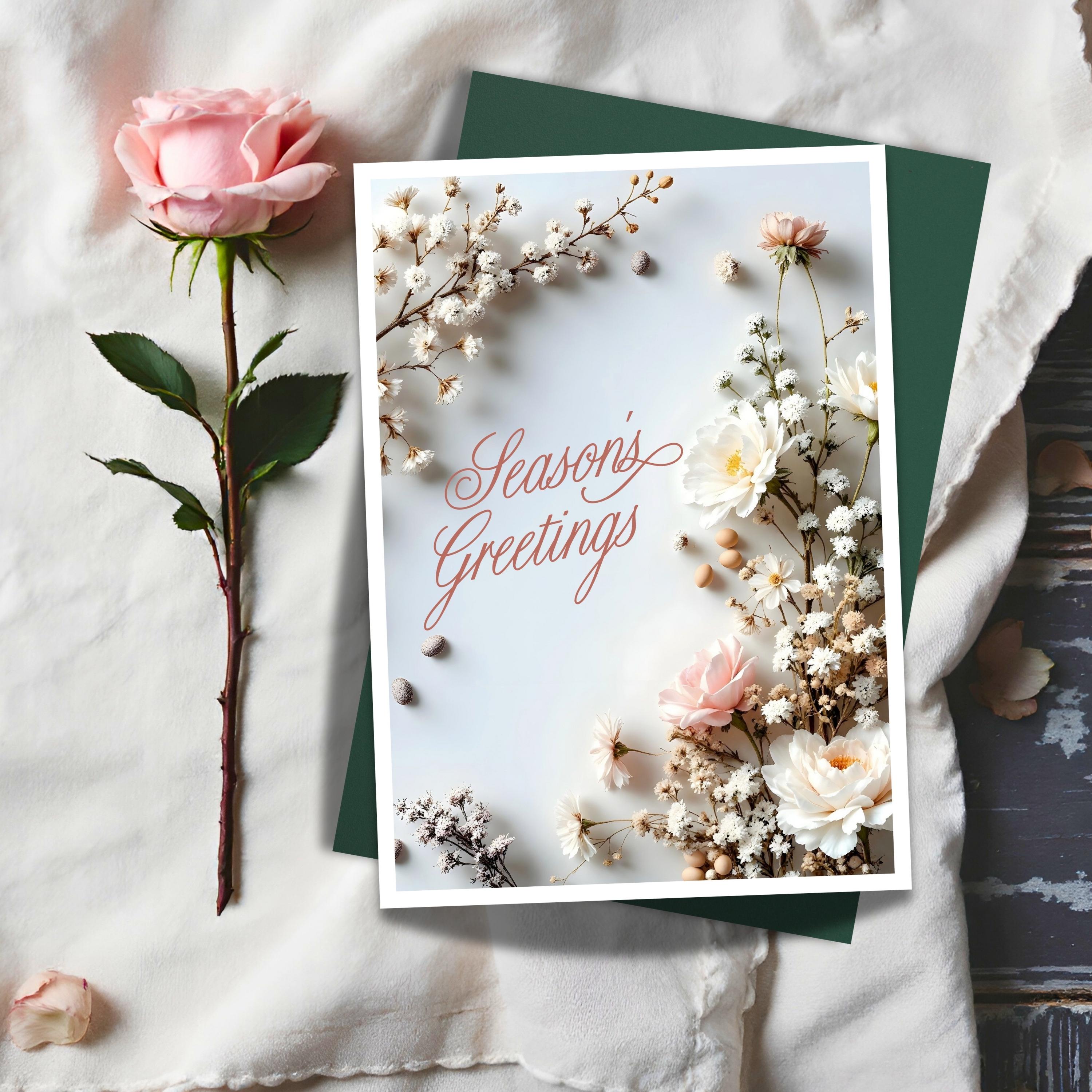 Send a touch of quiet winter beauty with this Season’s Greetings card featuring a delicate arrangement of blush and ivory florals, soft pine sprigs, and warm holiday tones. Perfect for thoughtful gifting, boutique displays, or sending a simple note of cheer during the holiday season.