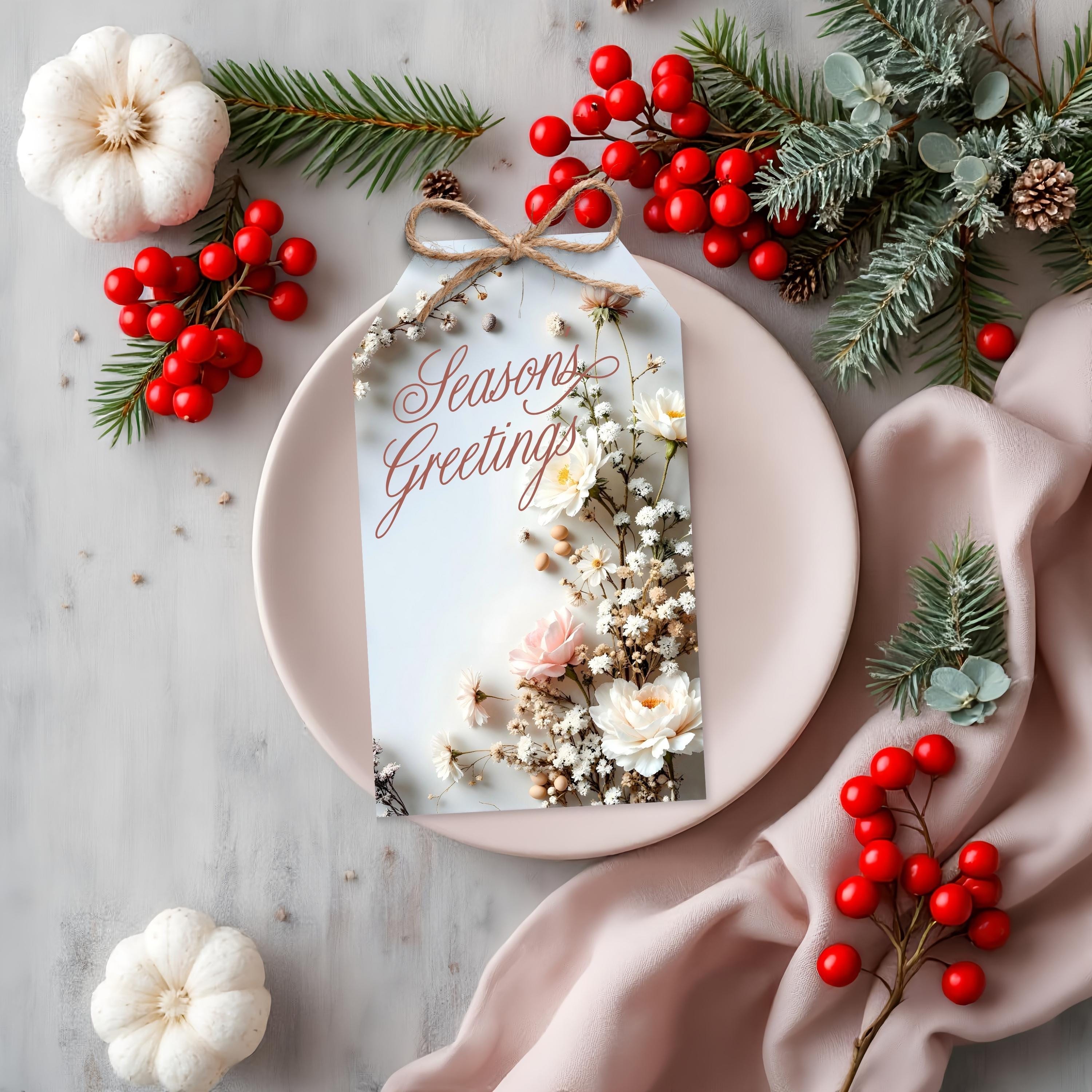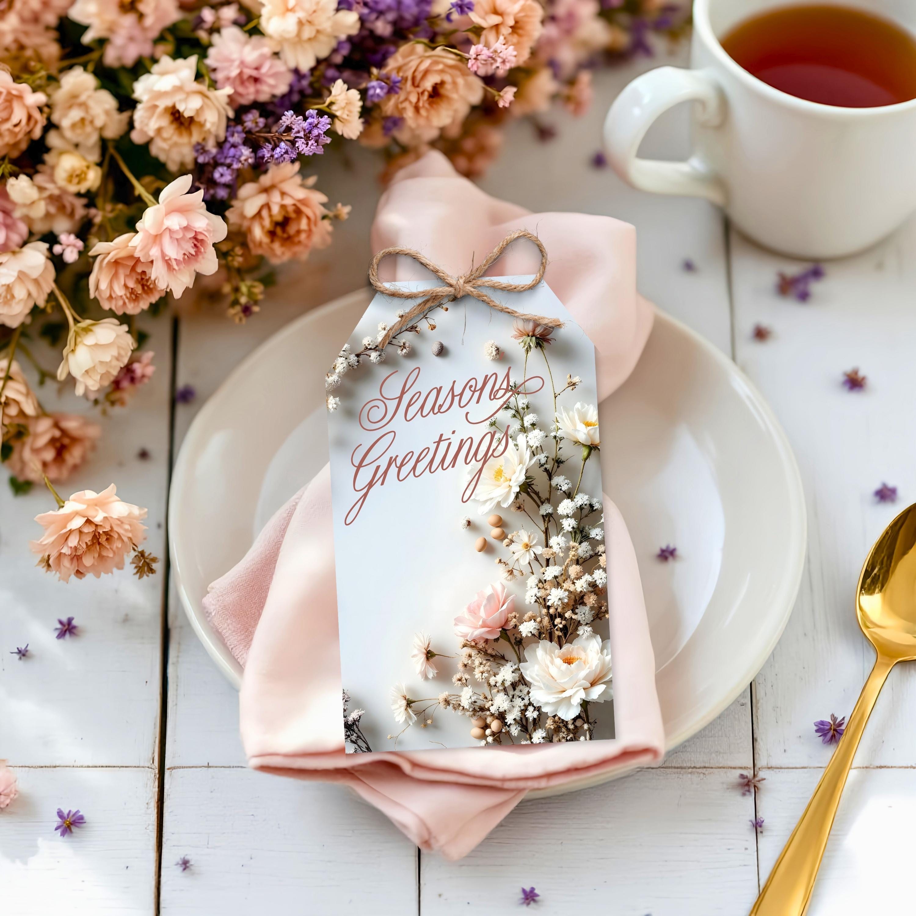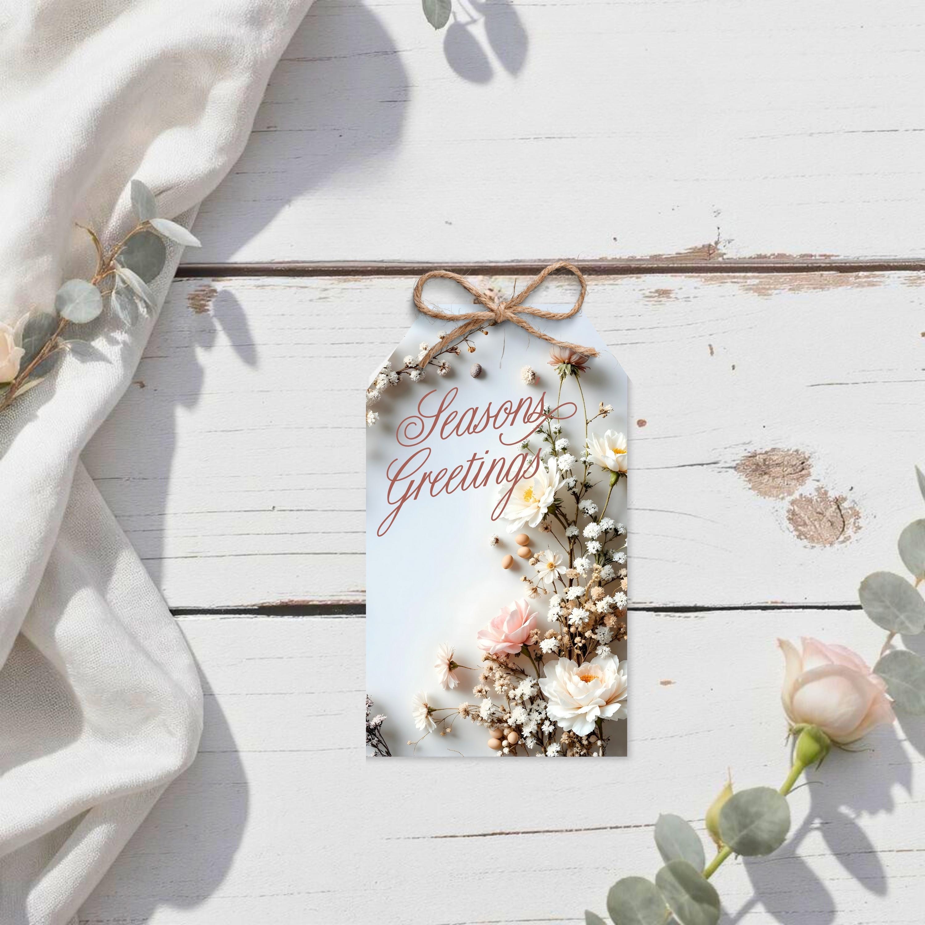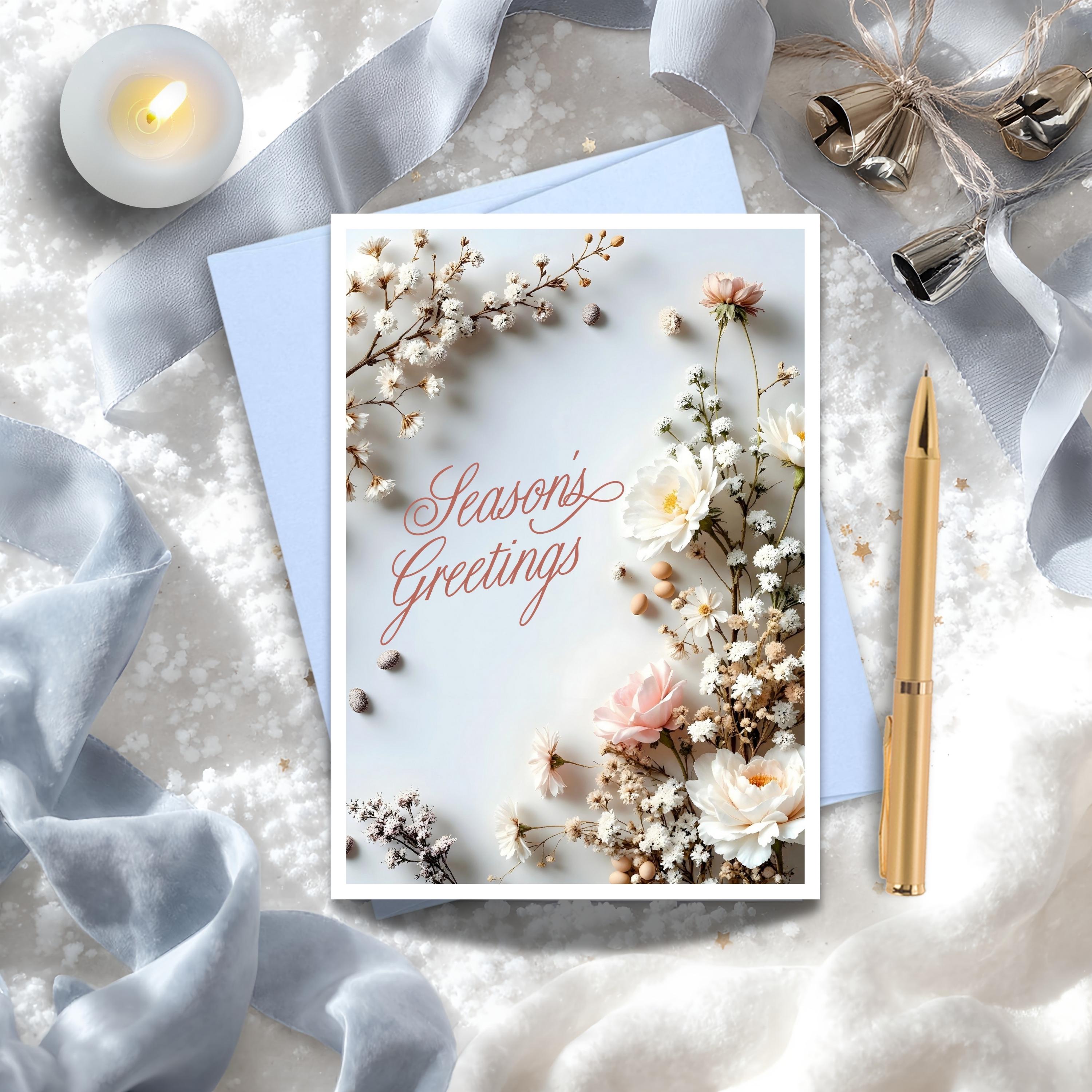 Send a touch of quiet winter beauty with this Season’s Greetings card featuring a delicate arrangement of blush and ivory florals, soft pine sprigs, and warm holiday tones. Perfect for thoughtful gifting, boutique displays, or sending a simple note of cheer during the holiday season.