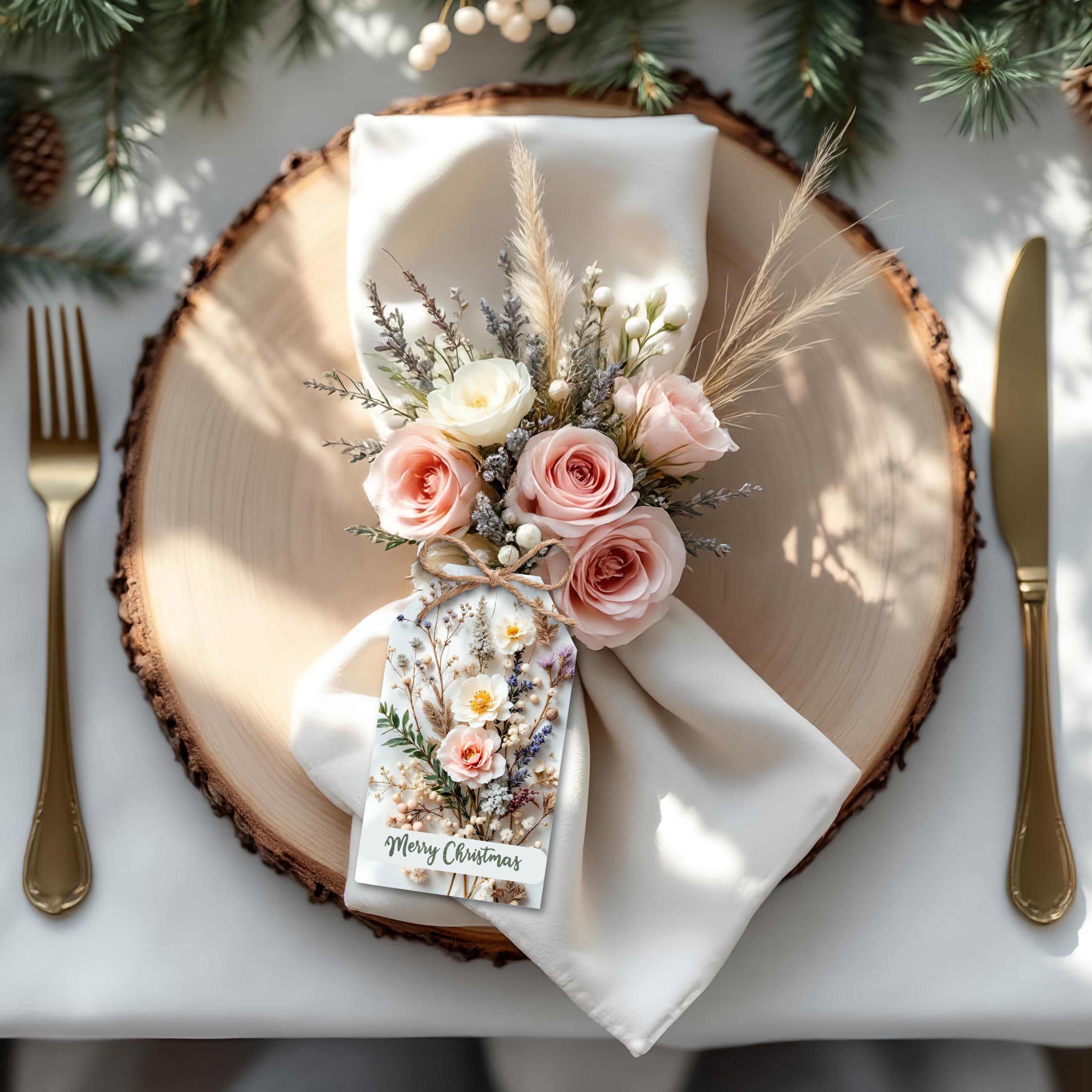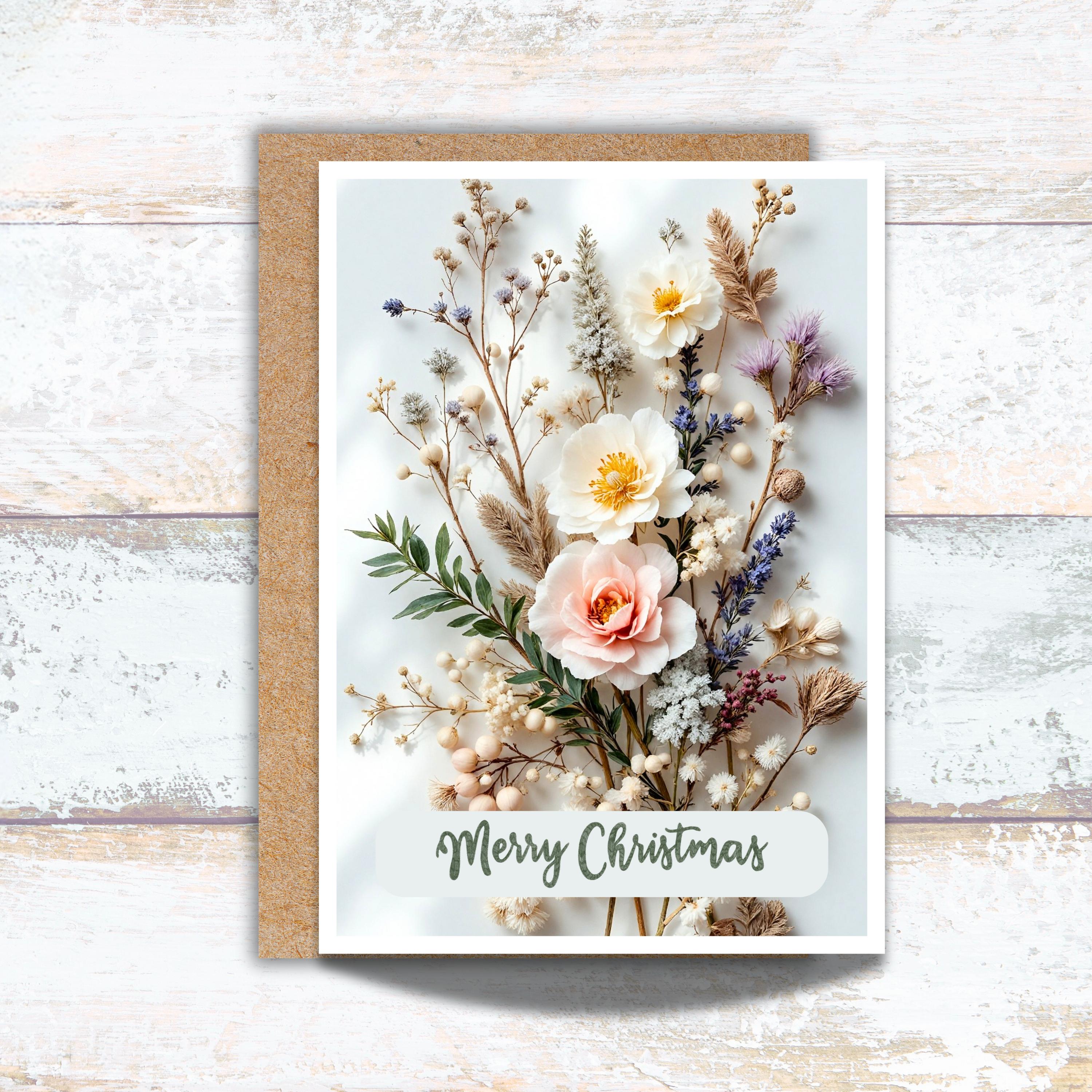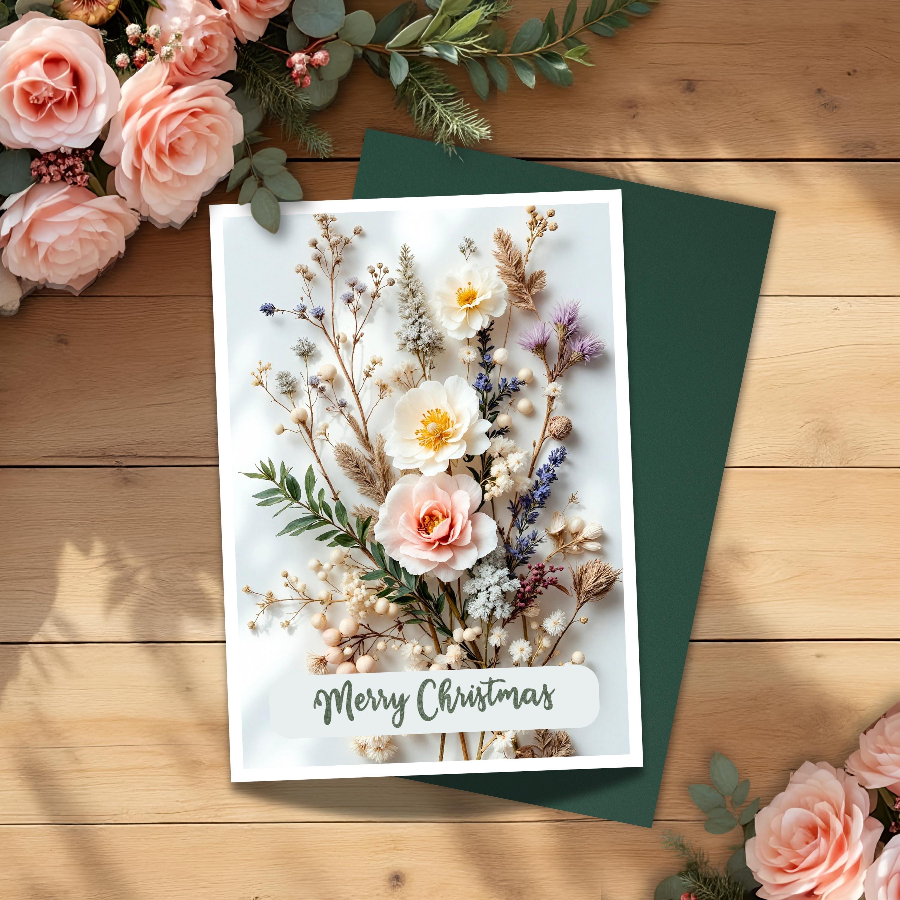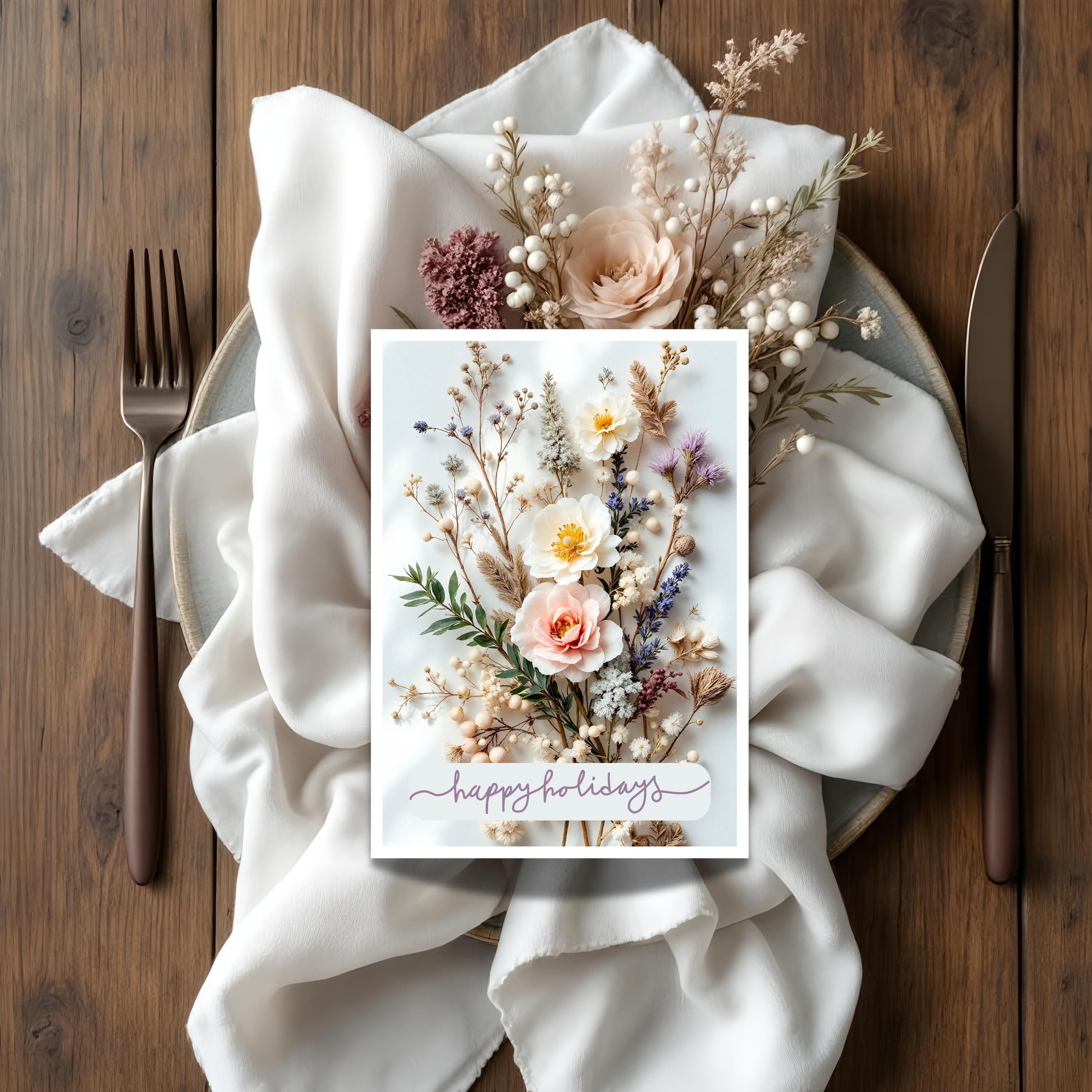 Bring a touch of timeless elegance to the season with this Winter Blush Flowers Greeting Card. Featuring soft ivory, blush, and golden blooms with delicate greenery and berries, this design blends winter serenity with a hint of warmth — ideal for thoughtful notes or seasonal gifting.