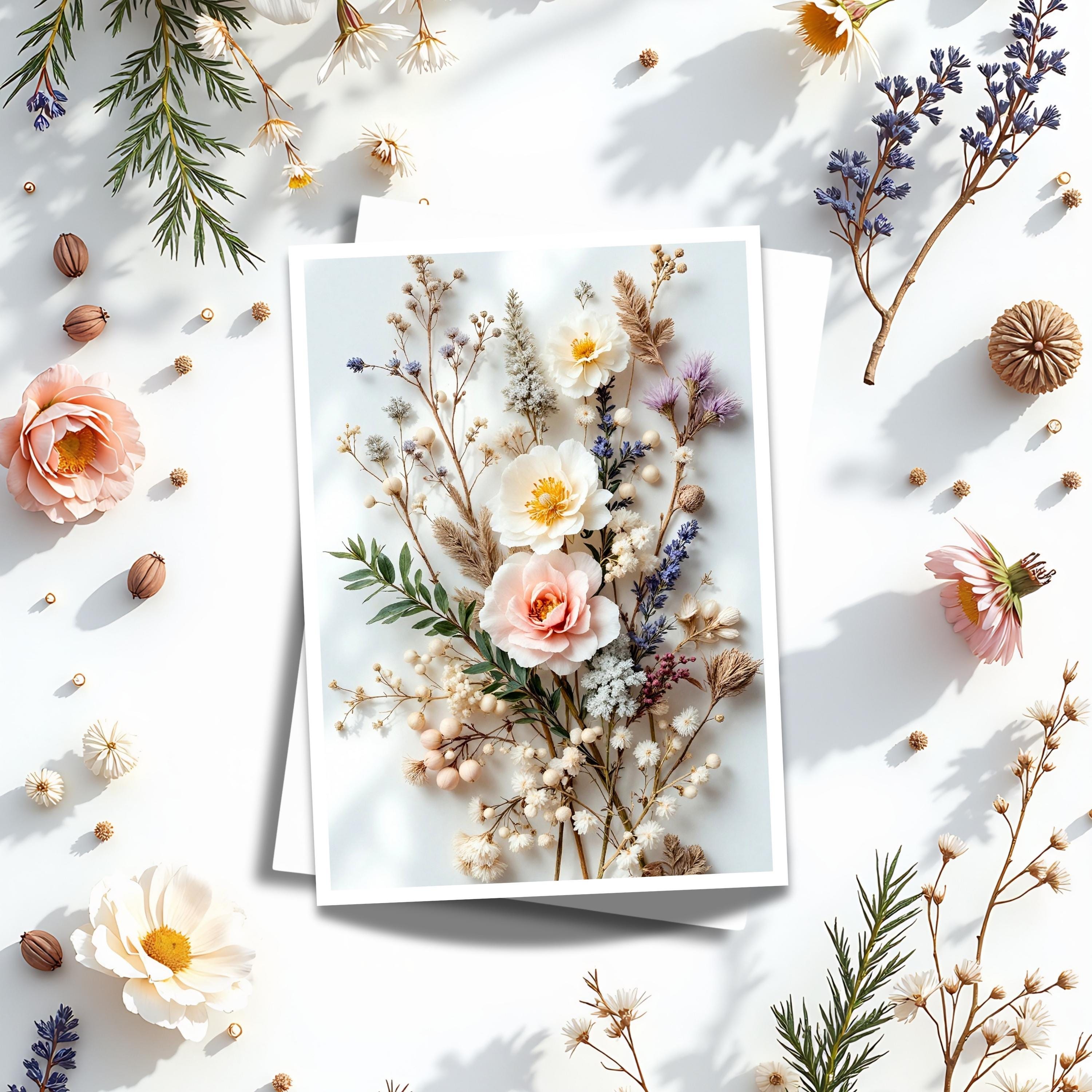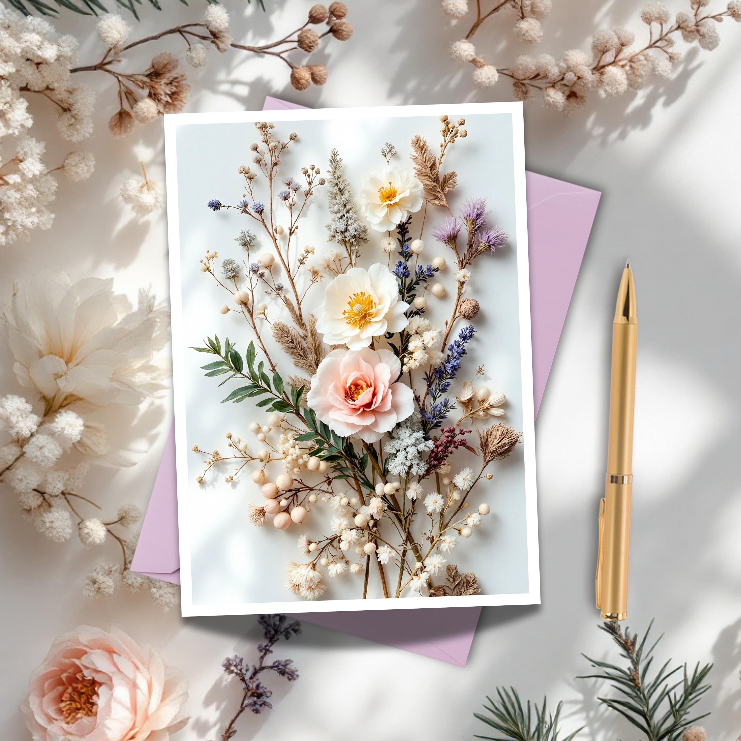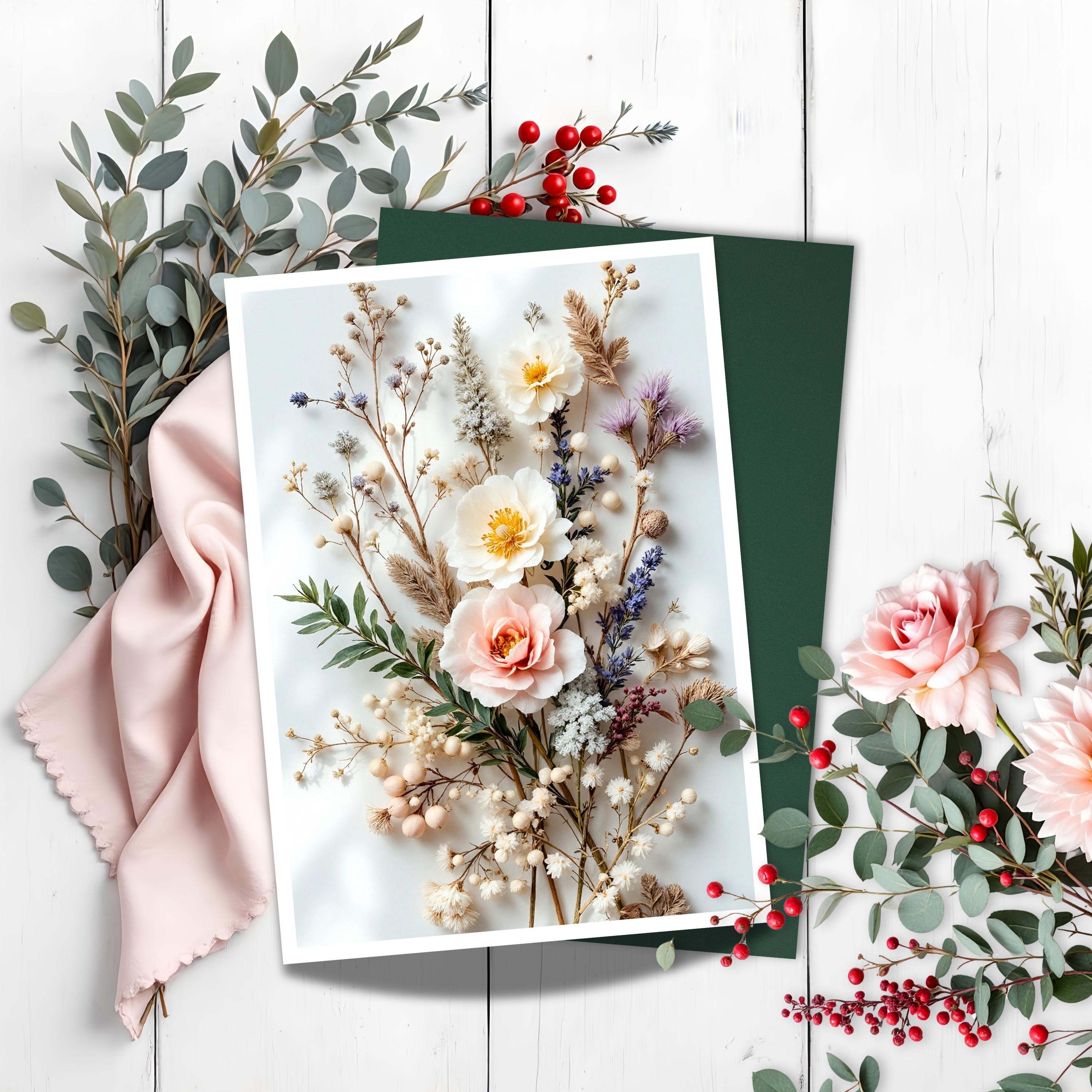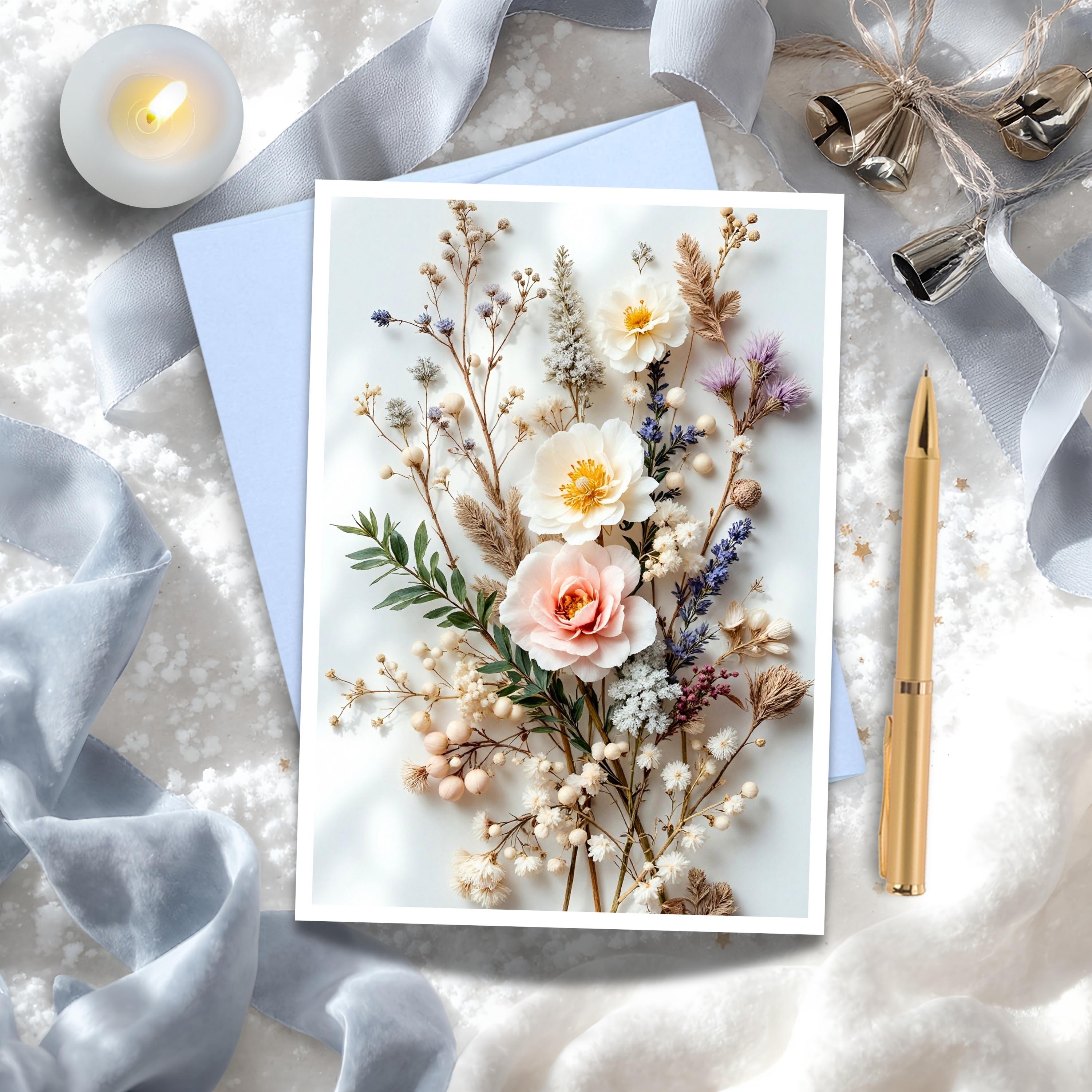 Bring a touch of timeless elegance to the season with this Winter Blush Flowers Greeting Card. Featuring soft ivory, blush, and golden blooms with delicate greenery and berries, this design blends winter serenity with a hint of warmth — ideal for thoughtful notes or seasonal gifting.