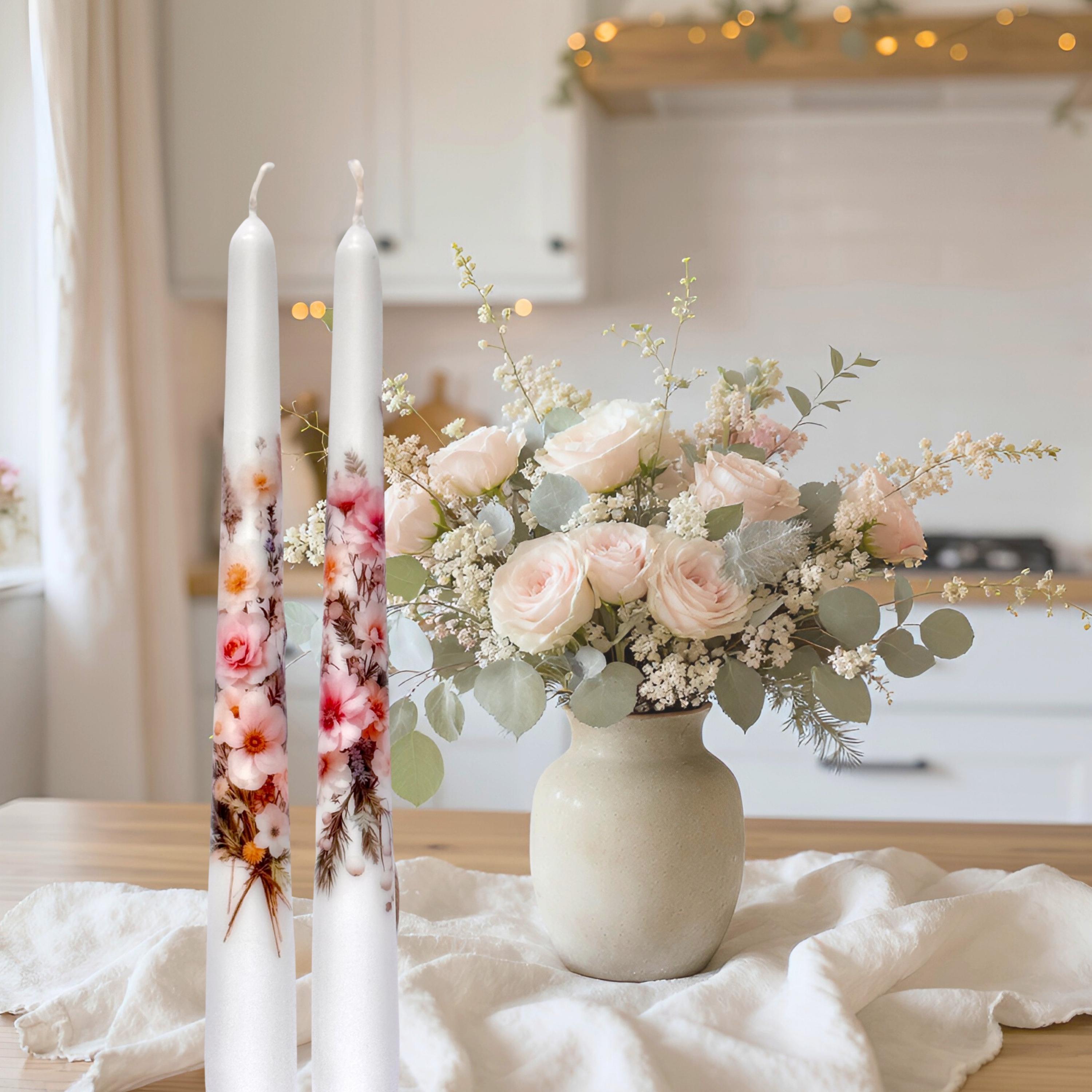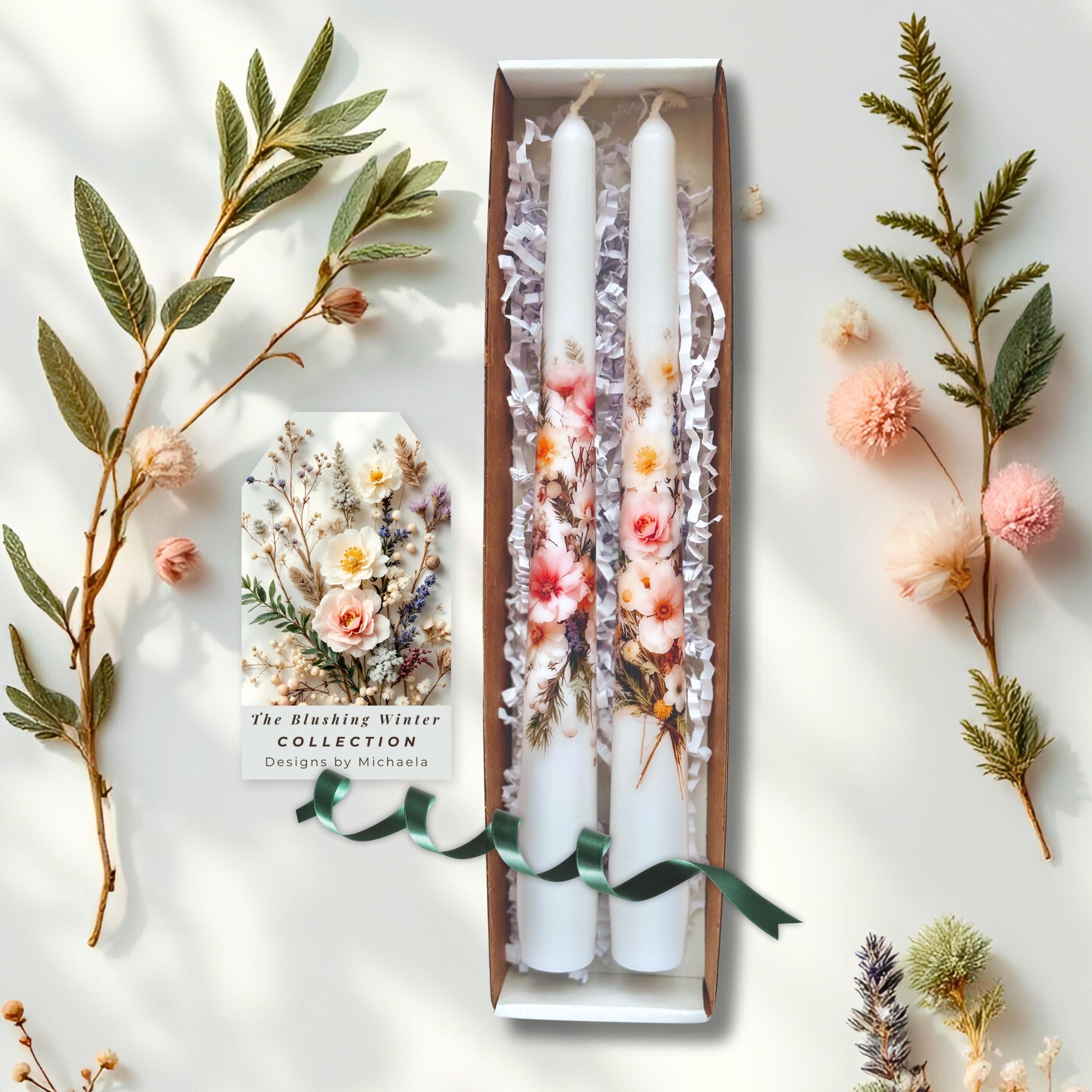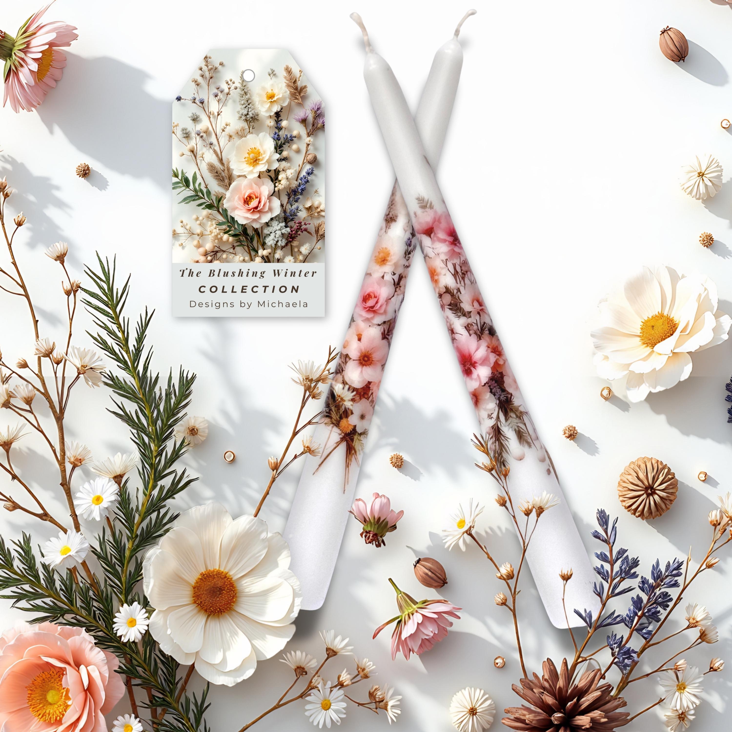 Bring the quiet beauty of winter indoors with this elegant set of floral taper candles from The Blushing Winter Collection by Designs by Michaela. Each unscented candle features soft blush, ivory, and golden winter botanicals — delicately arranged against creamy white wax for a timeless, romantic glow.