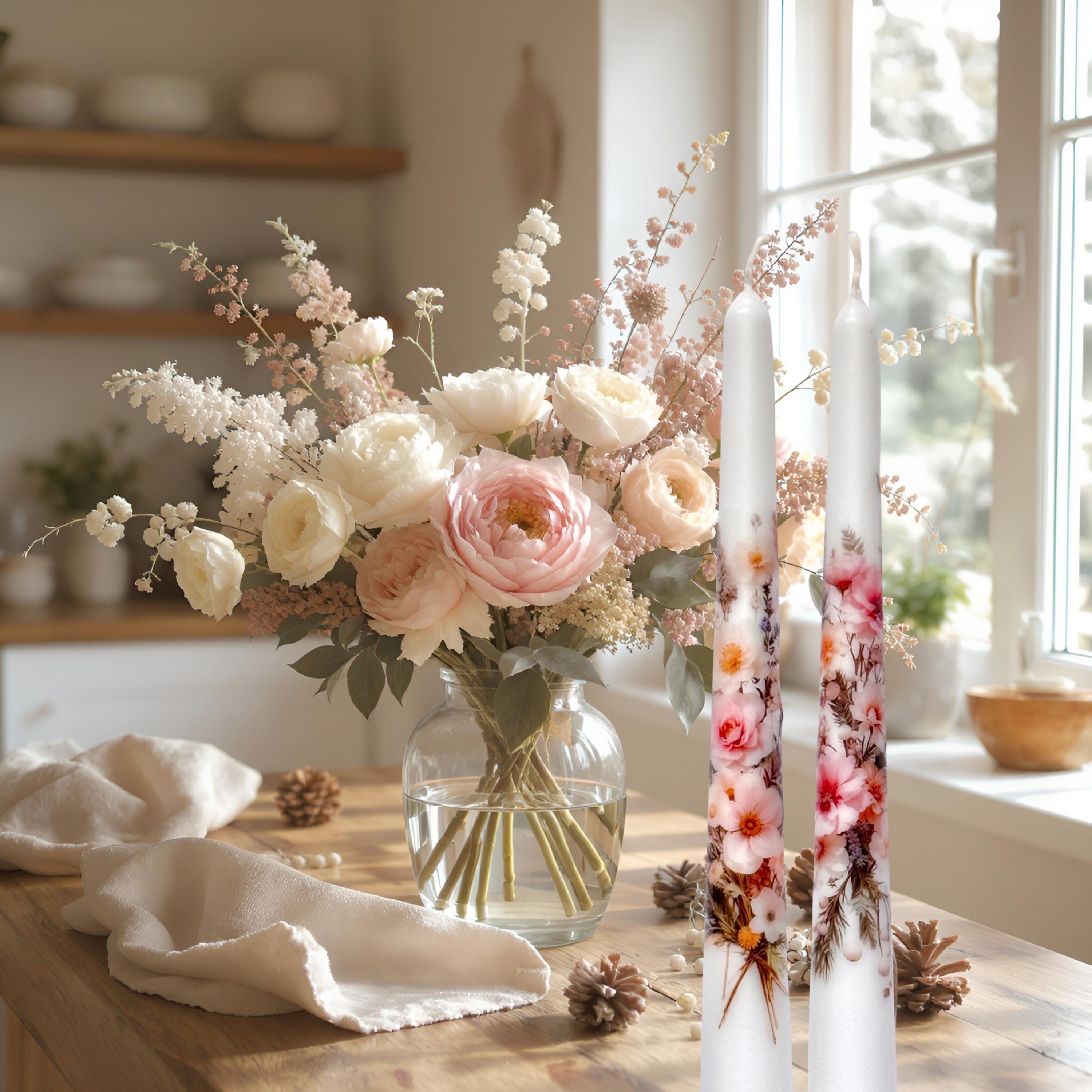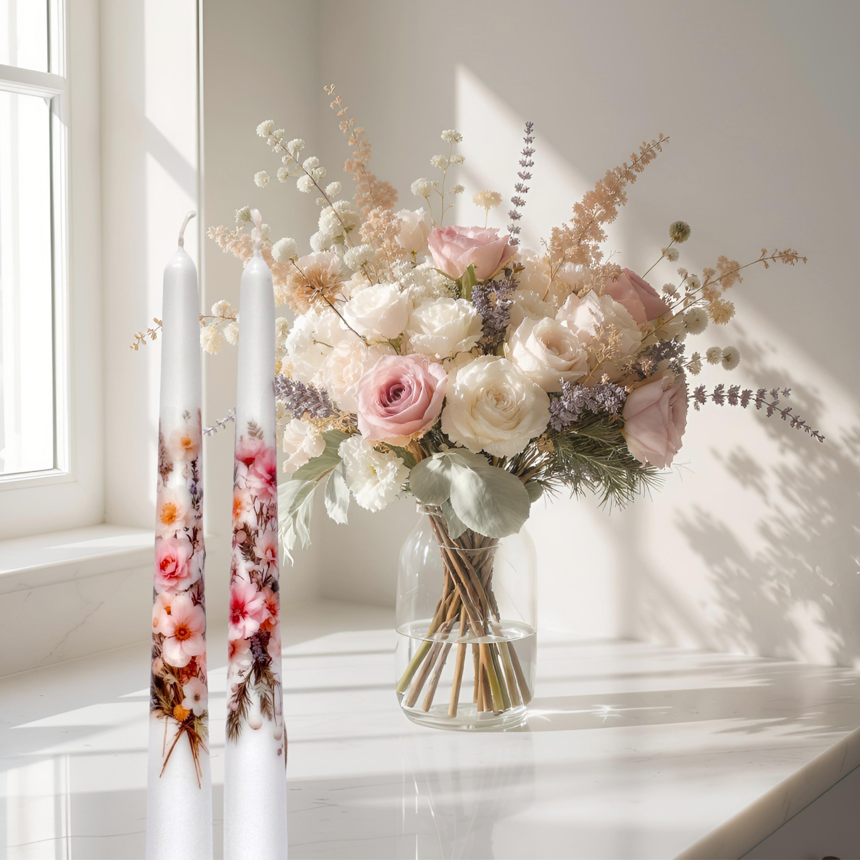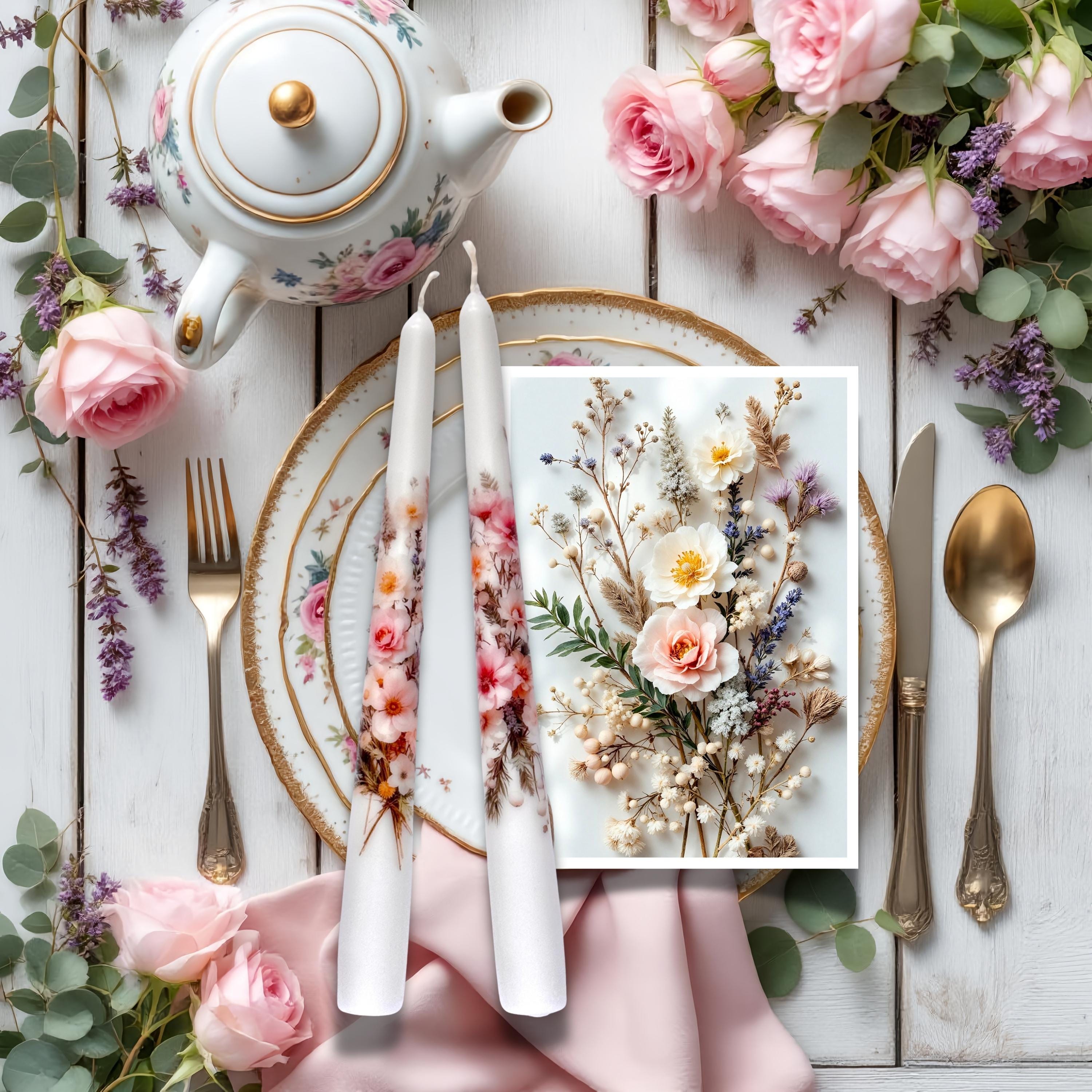 Bring the quiet beauty of winter indoors with this elegant set of floral taper candles from The Blushing Winter Collection by Designs by Michaela. Each unscented candle features soft blush, ivory, and golden winter botanicals — delicately arranged against creamy white wax for a timeless, romantic glow.