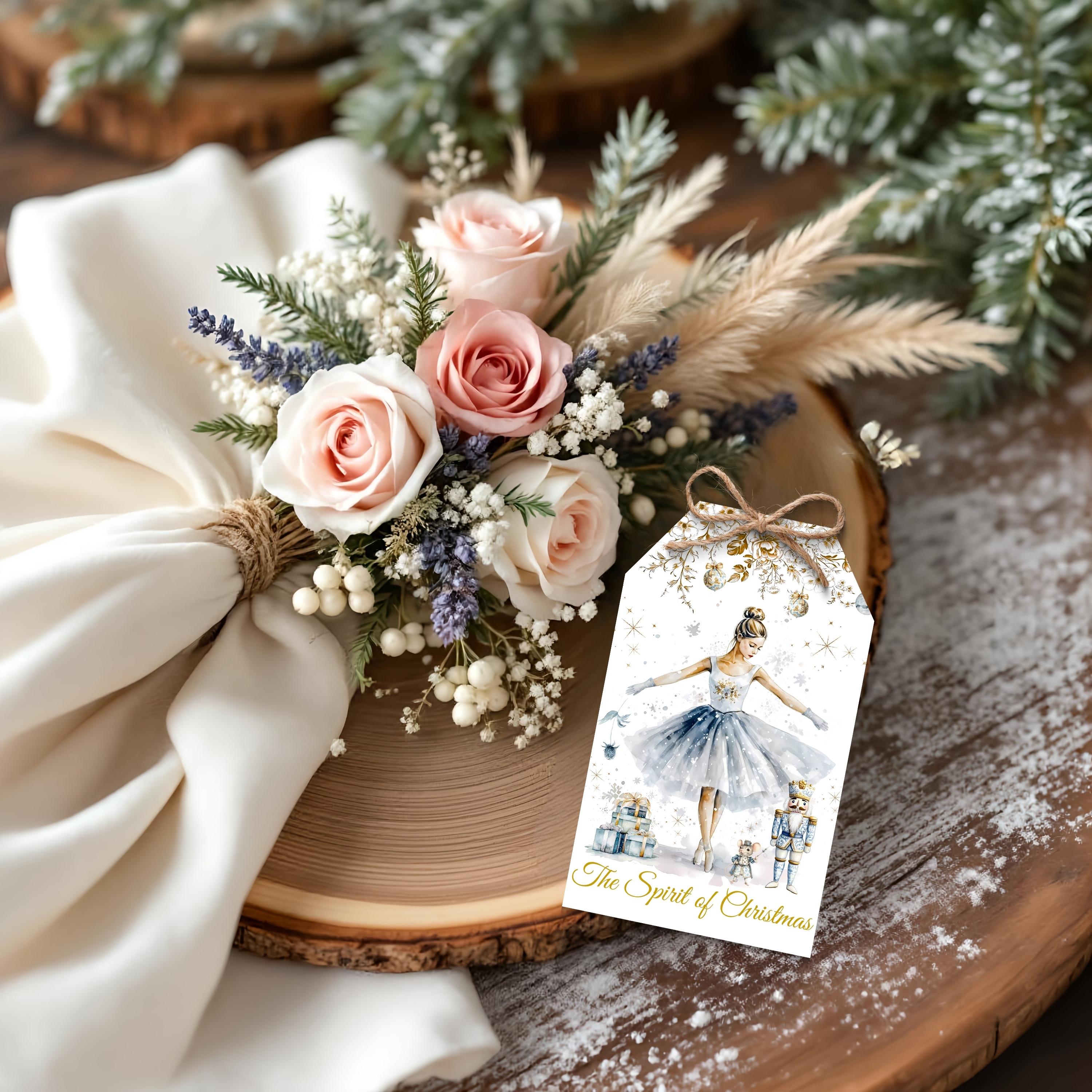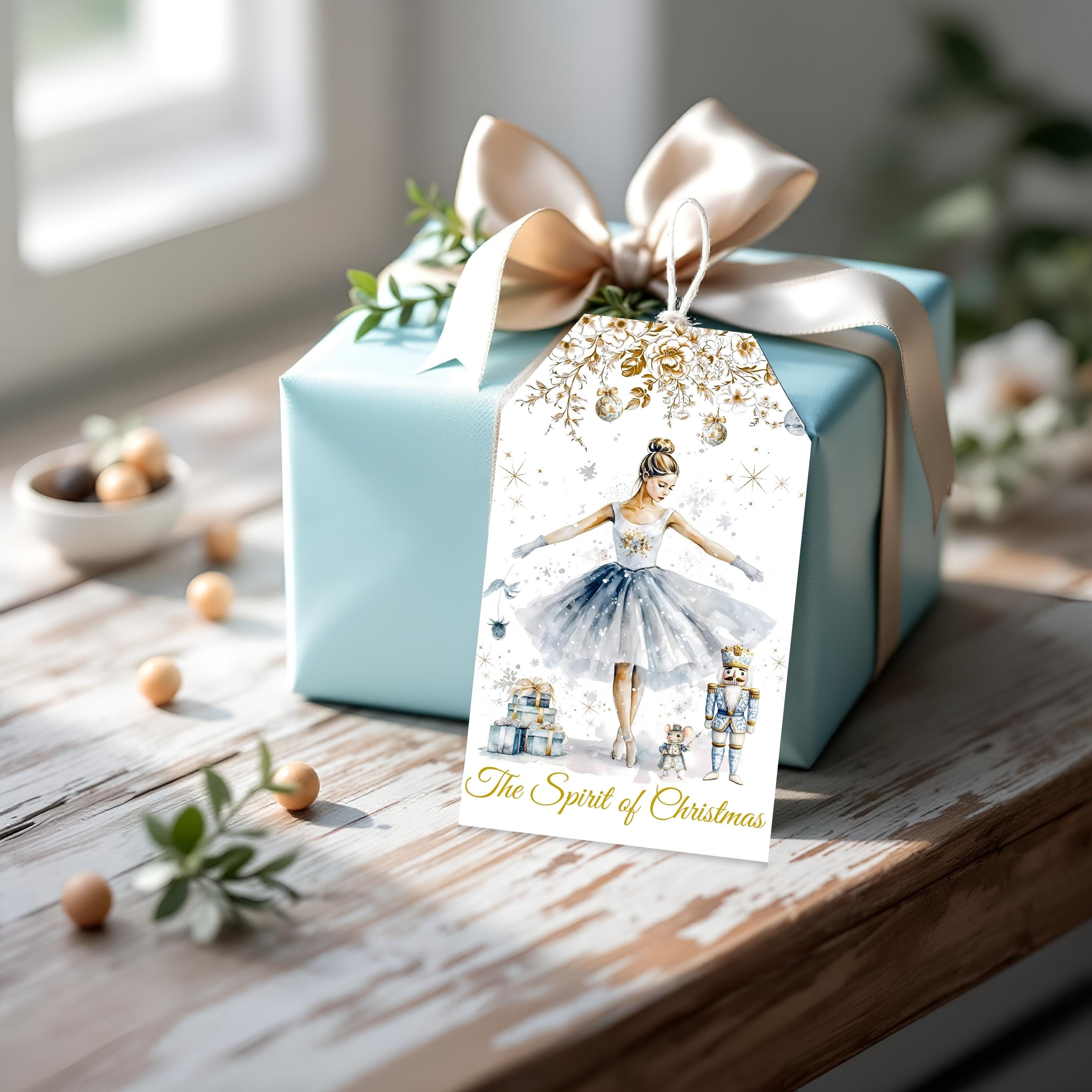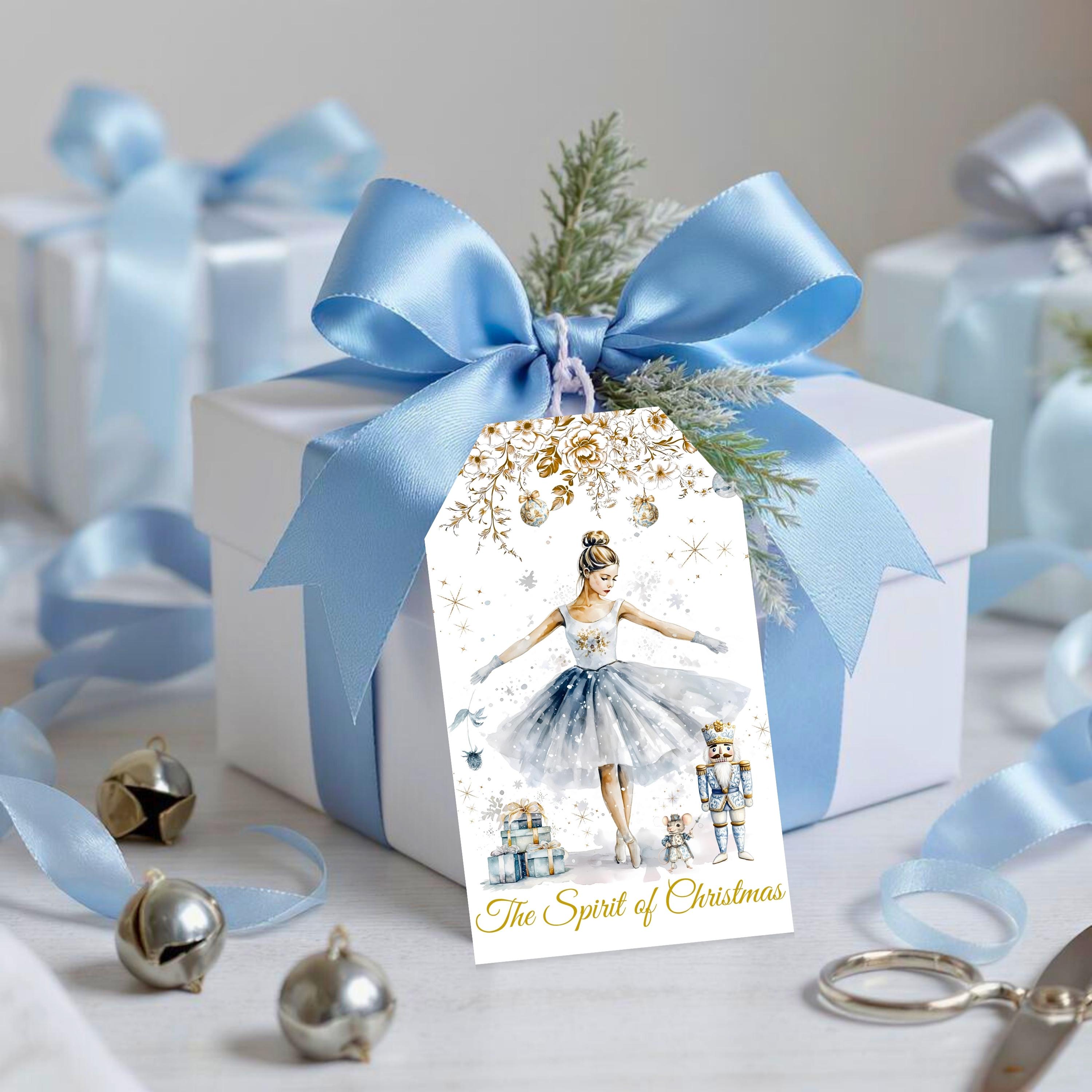 Celebrate the magic of the season with our elegant Ballerina Christmas Gift Tags, inspired by the timeless Nutcracker story. Each tag features a graceful watercolor ballerina surrounded by festive gold florals, soft blue accents, and enchanting holiday details — a perfect finishing touch for your beautifully wrapped gifts.