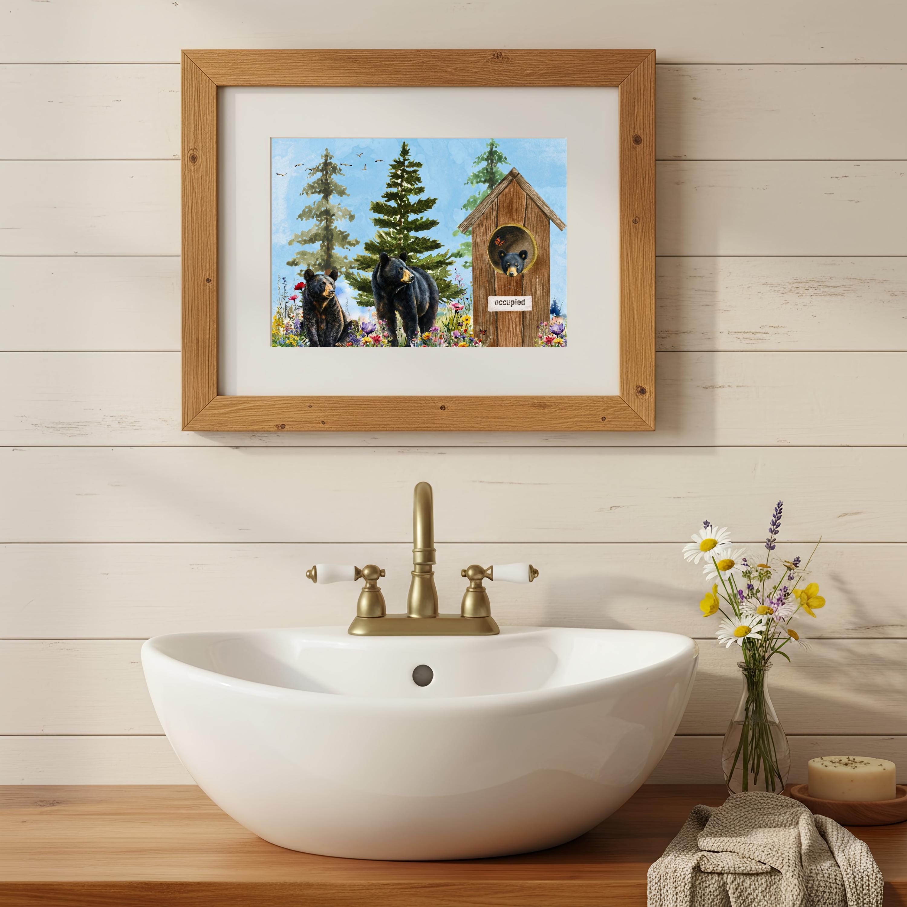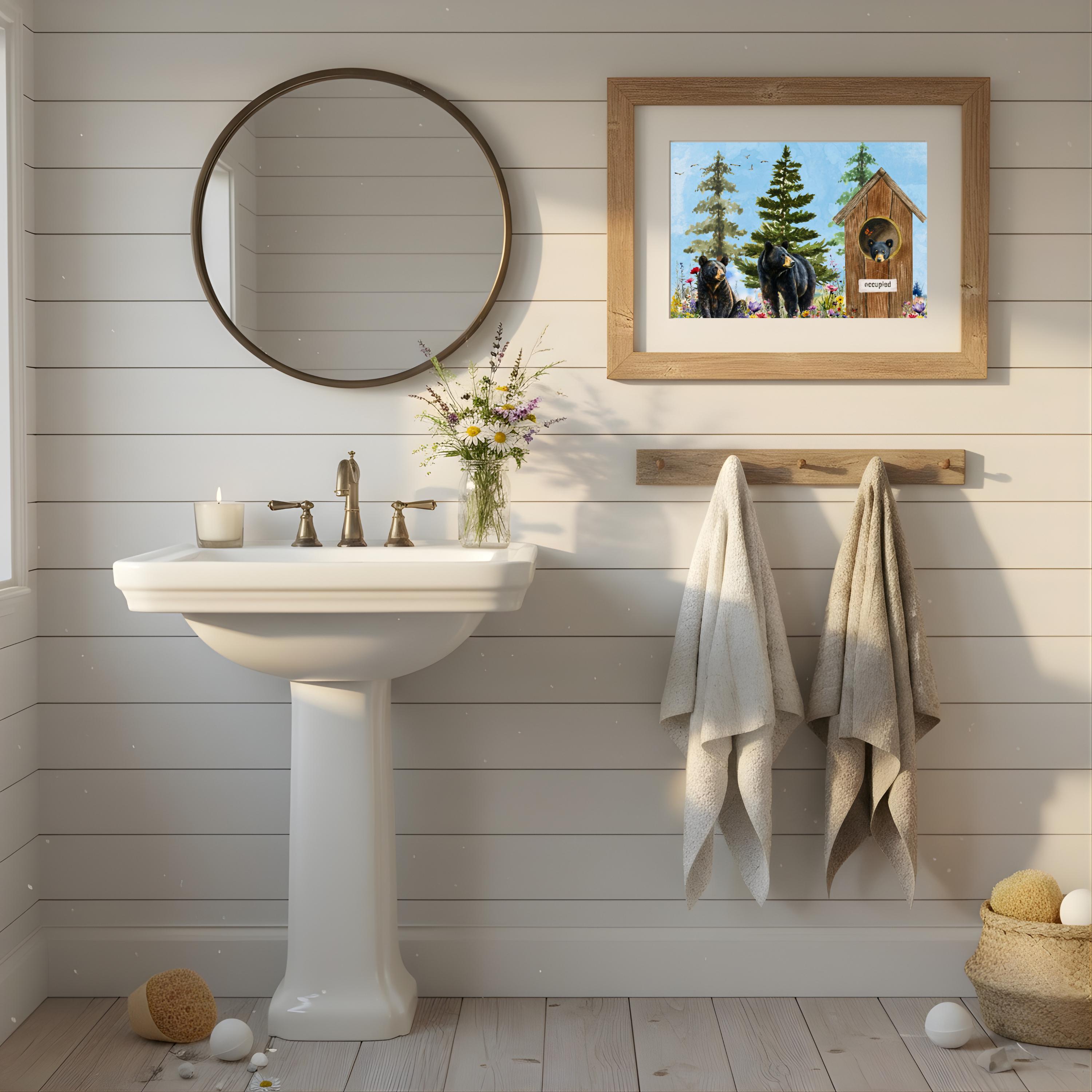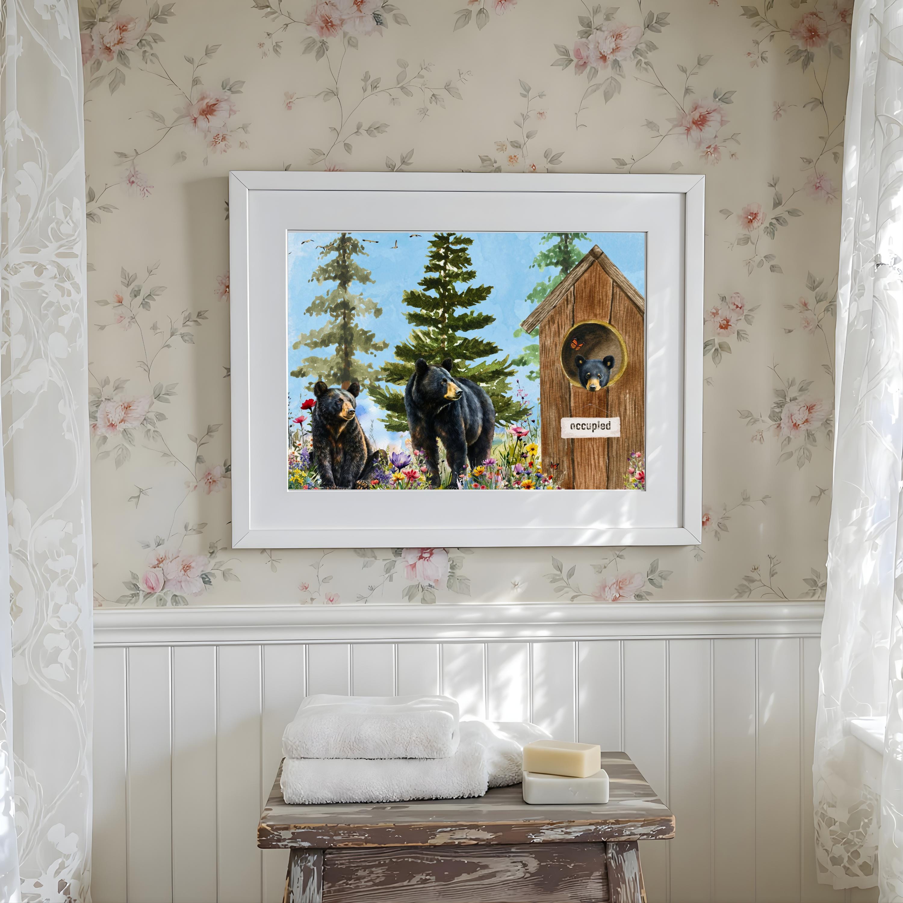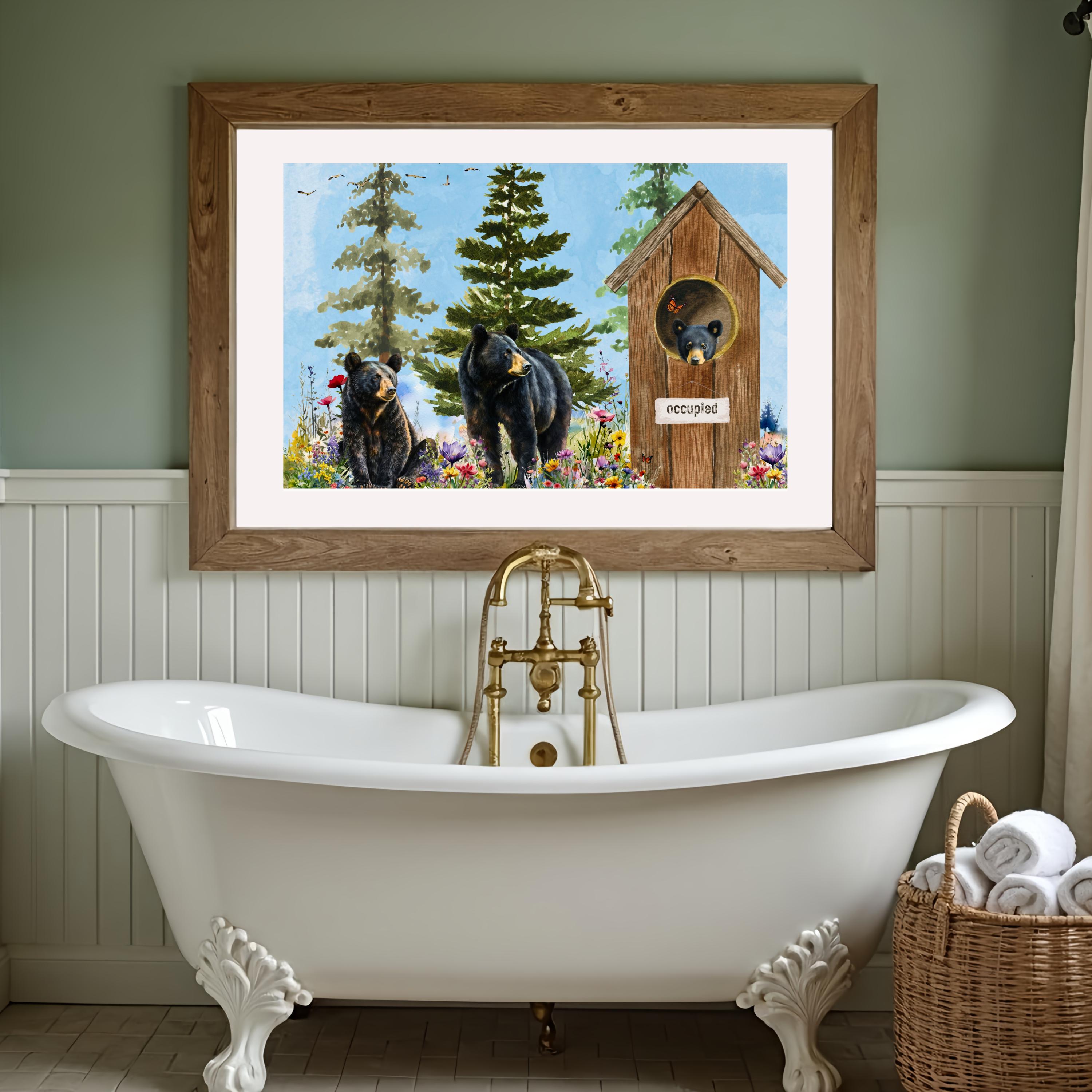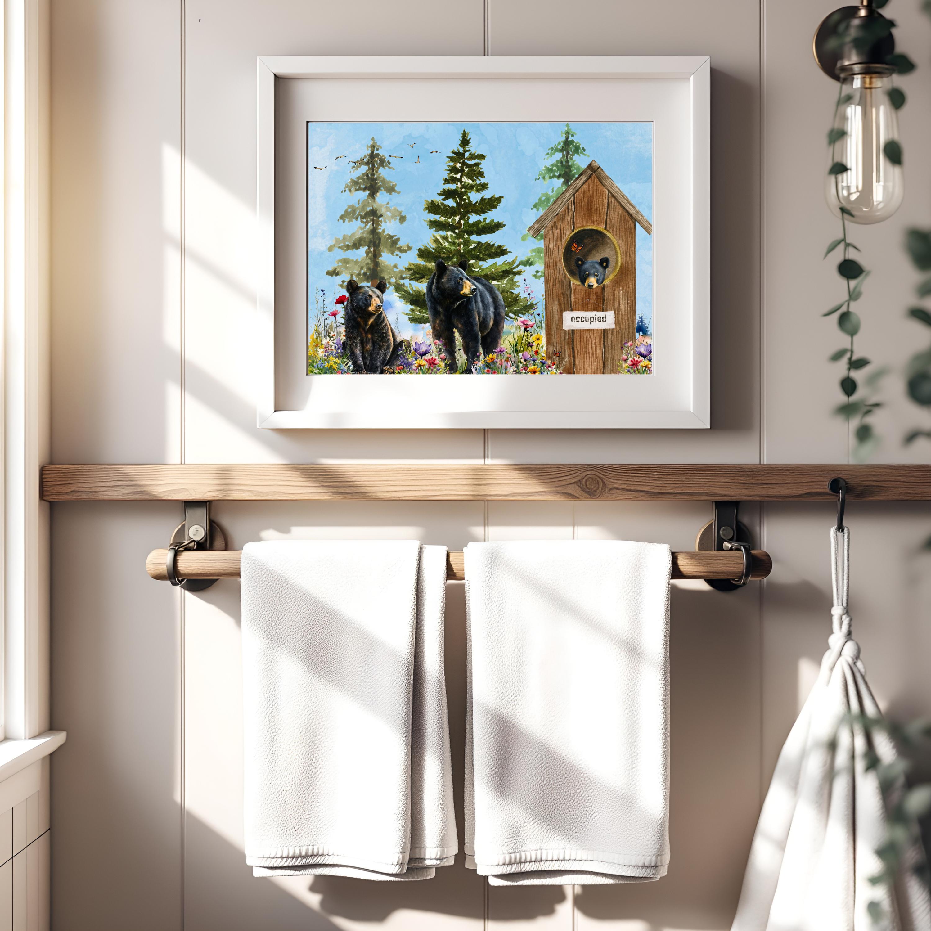 Whether you hang it above a clawfoot tub, vanity, or towel rack, this print adds warmth, character, and a smile to your home. Ideal for bathrooms, powder rooms, or as a unique gift for cabin lovers and bear enthusiasts.