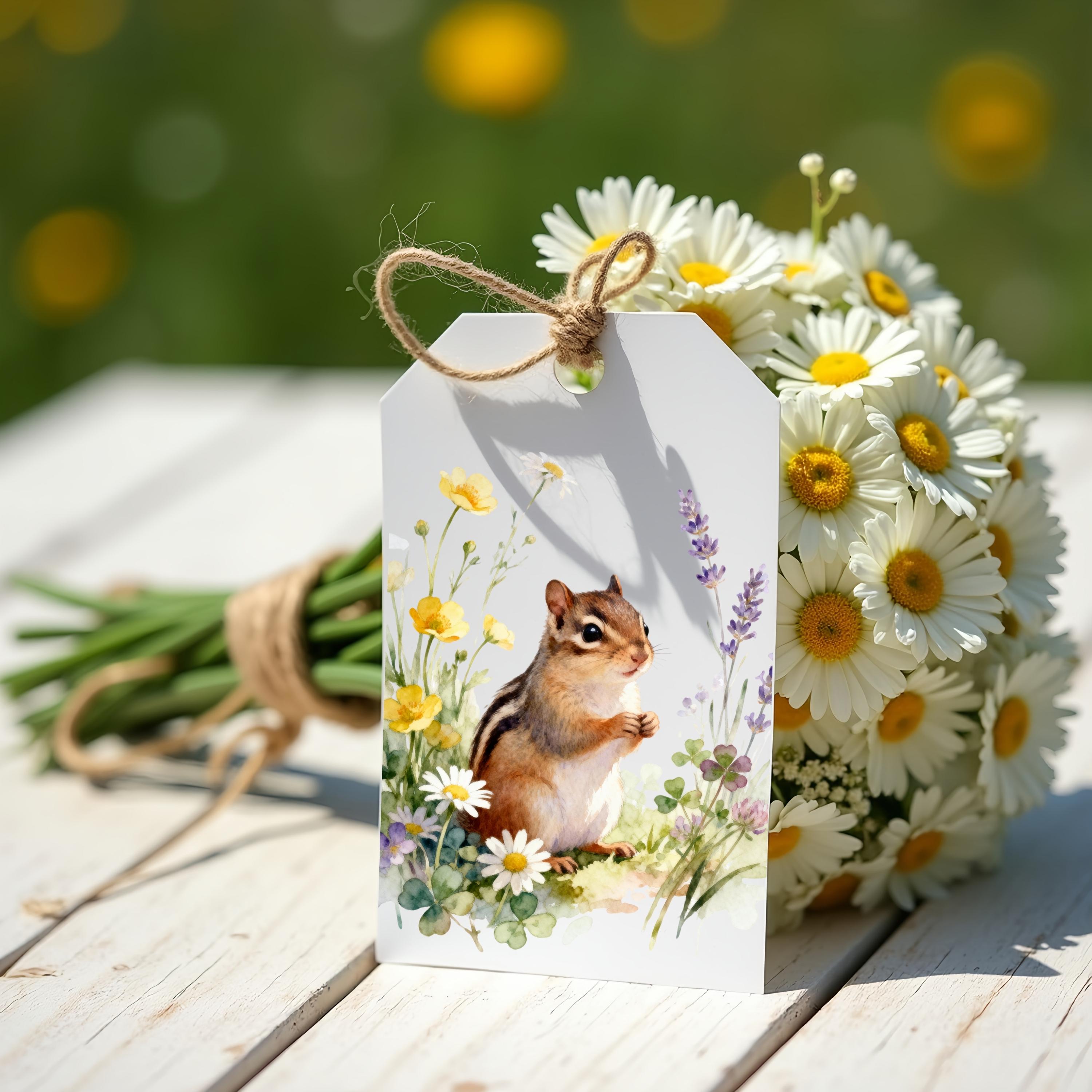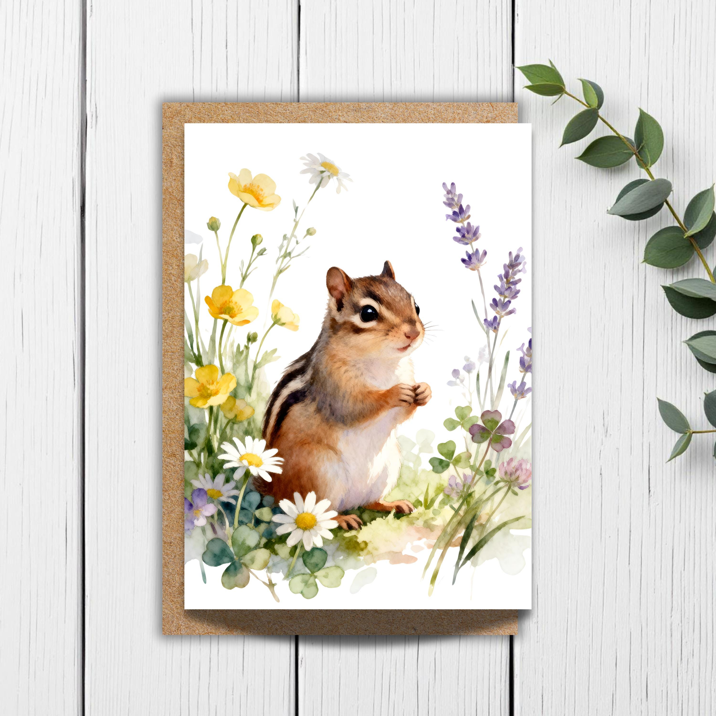 Bring the charm of the forest to your stationery collection with this watercolor-style chipmunk card, featuring a sweet woodland friend nestled among daisies, lavender, clover, and soft yellow wildflowers. The centered, airy cottagecore design creates a gentle, nature-inspired card perfect for birthdays, thank-you notes, and heartfelt everyday messages.