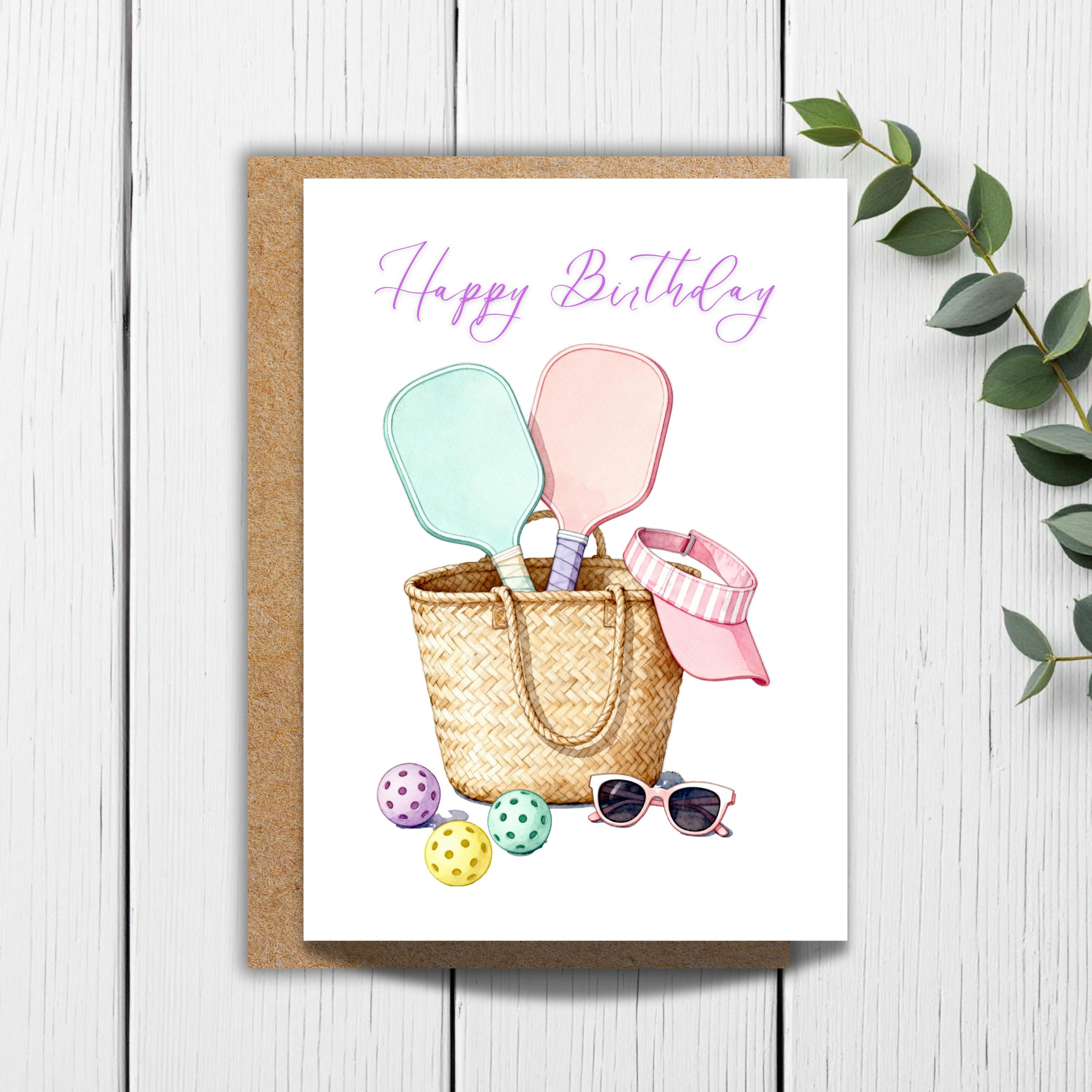 Celebrate the pickleball lover in your life with this charming birthday card featuring pastel paddles, a woven tote, visor, sunglasses, and colorful pickleballs. Designed with a light, feminine aesthetic, this card is perfect for pickleball besties, teammates, club friends, or anyone who spends their days on the court.
