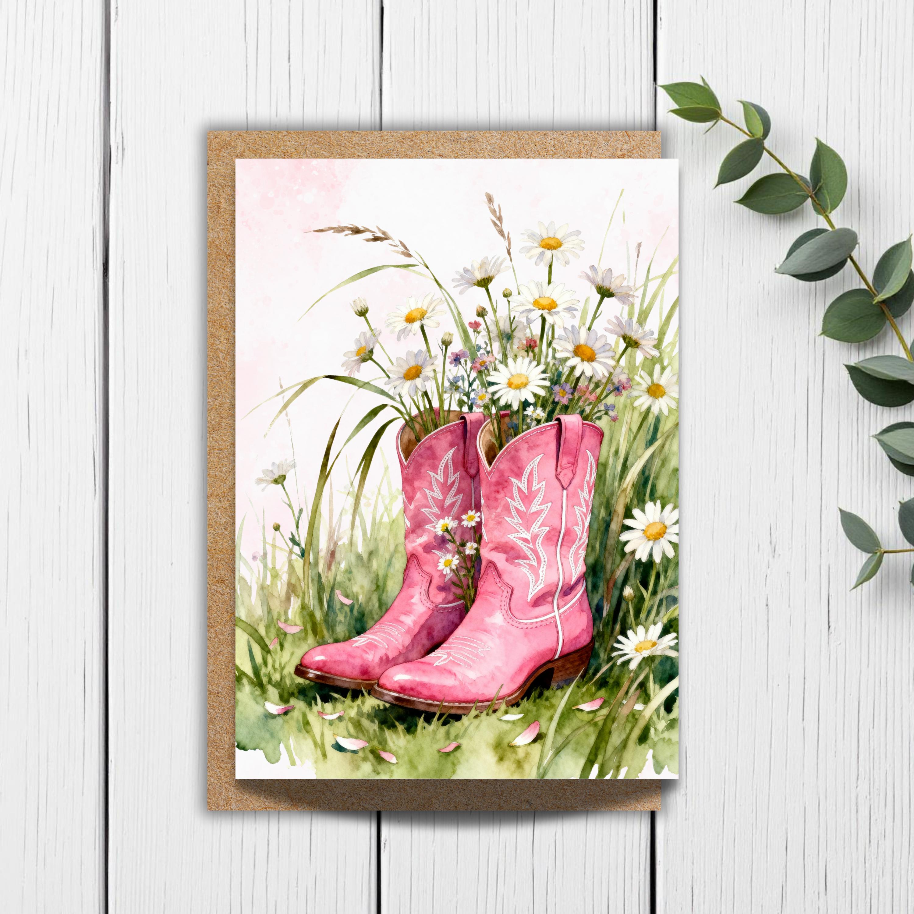 Celebrate her love of country charm with this soft watercolor greeting card featuring pink cowgirl boots nestled in an overgrown meadow of daisies. The warm, rustic style makes it perfect for birthdays, thank-you notes, Mother’s Day, or everyday messages with a touch of Western romance.