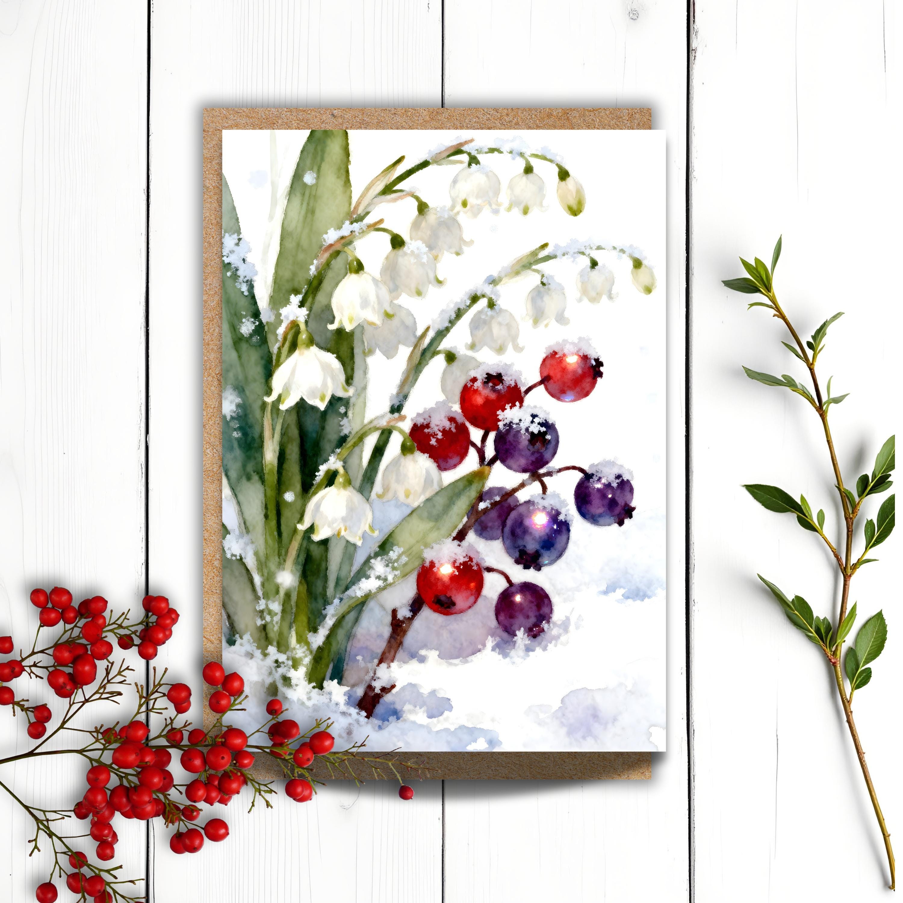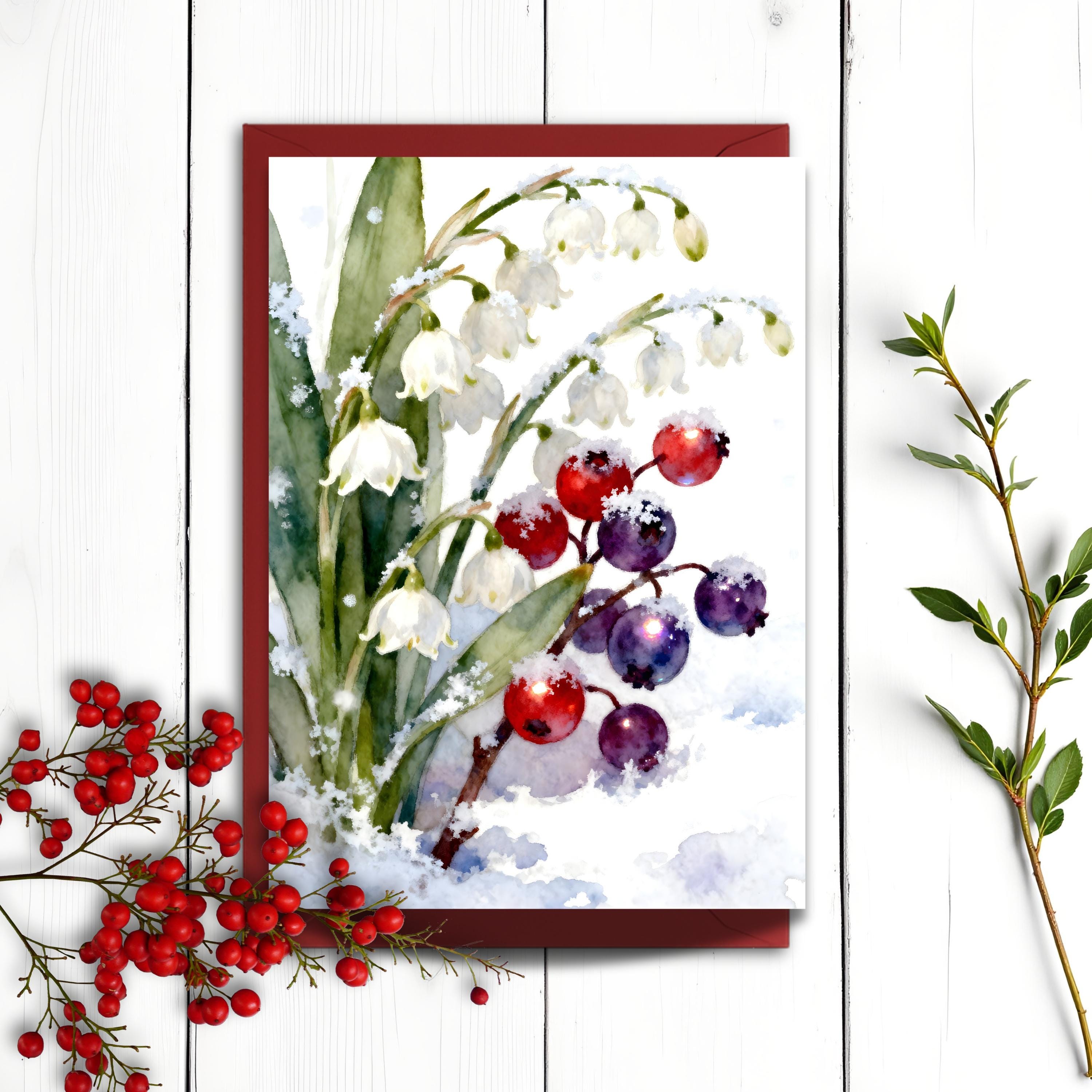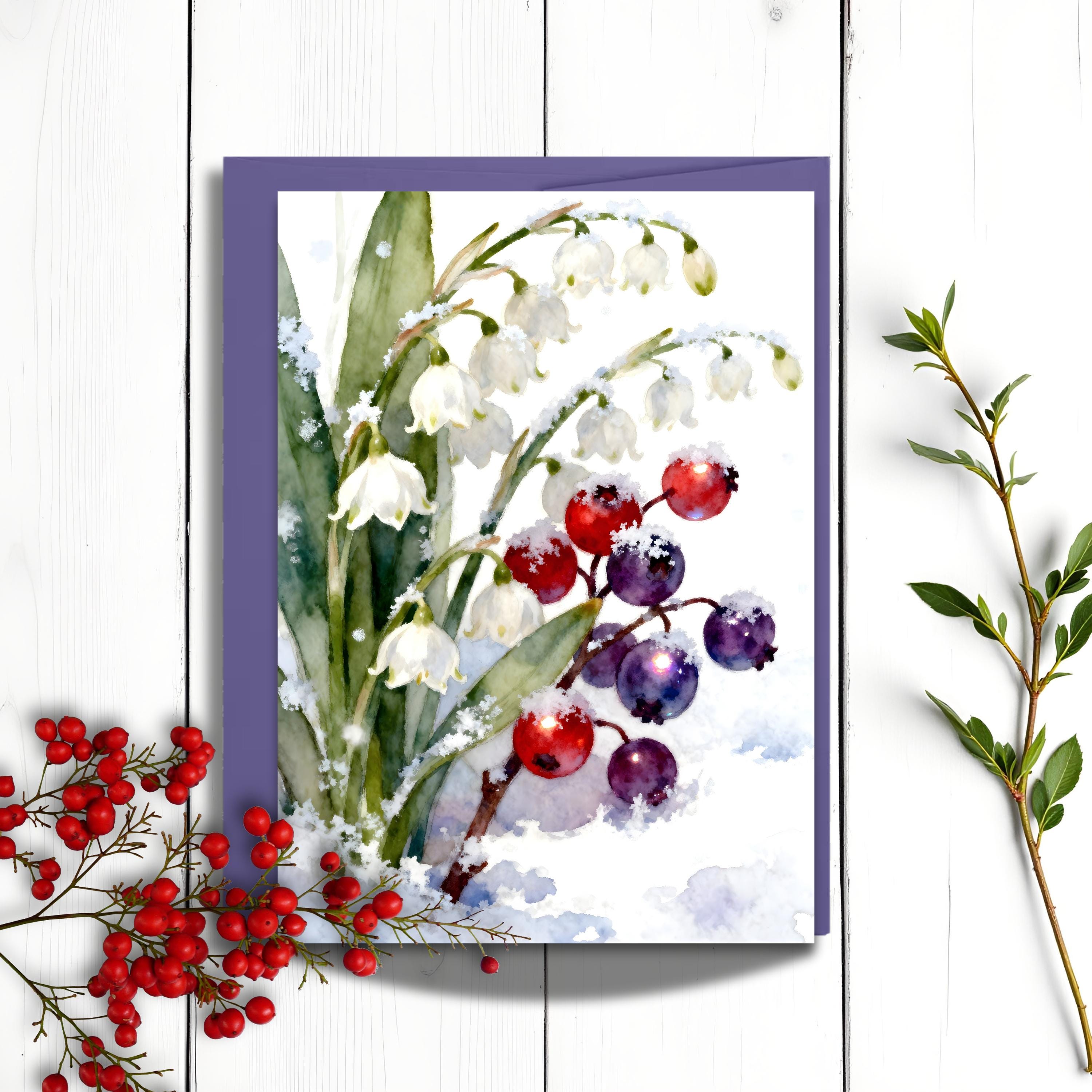 Bring the quiet beauty of winter to your correspondence with this softly painted holiday card featuring snow-dusted lily-of-the-valley and frosty winter berries. The delicate watercolor style and cool seasonal palette create a serene, elegant design perfect for Christmas, winter birthdays, thank-you notes, or seasonal greetings.