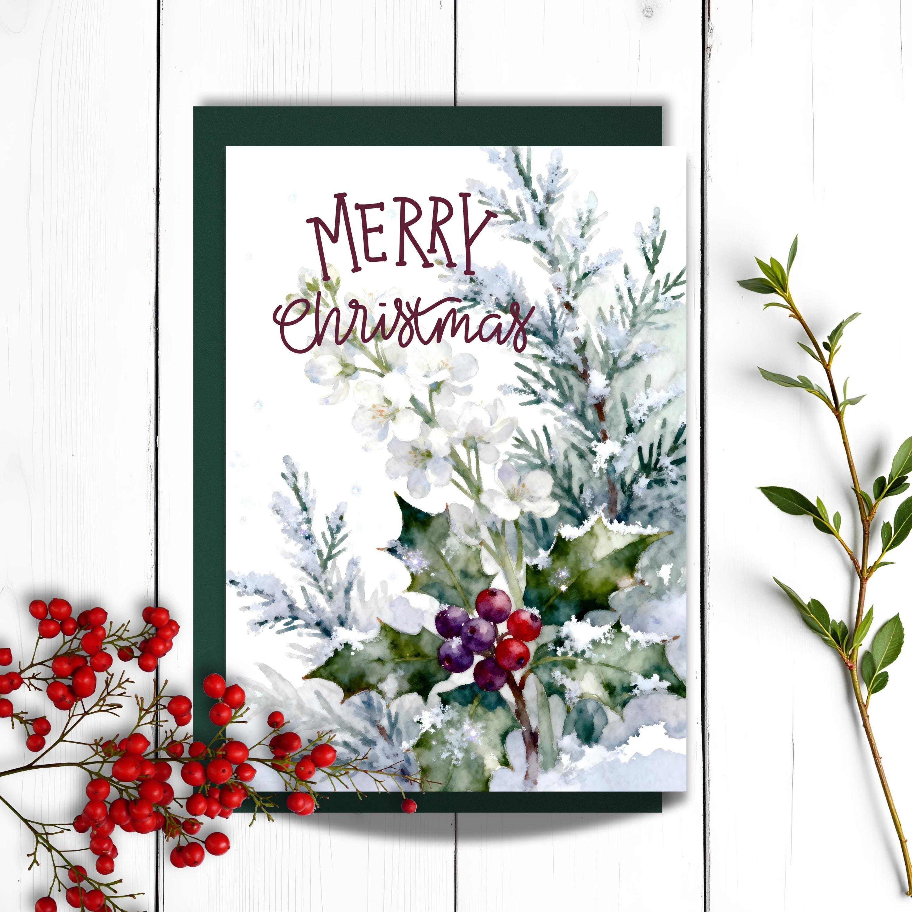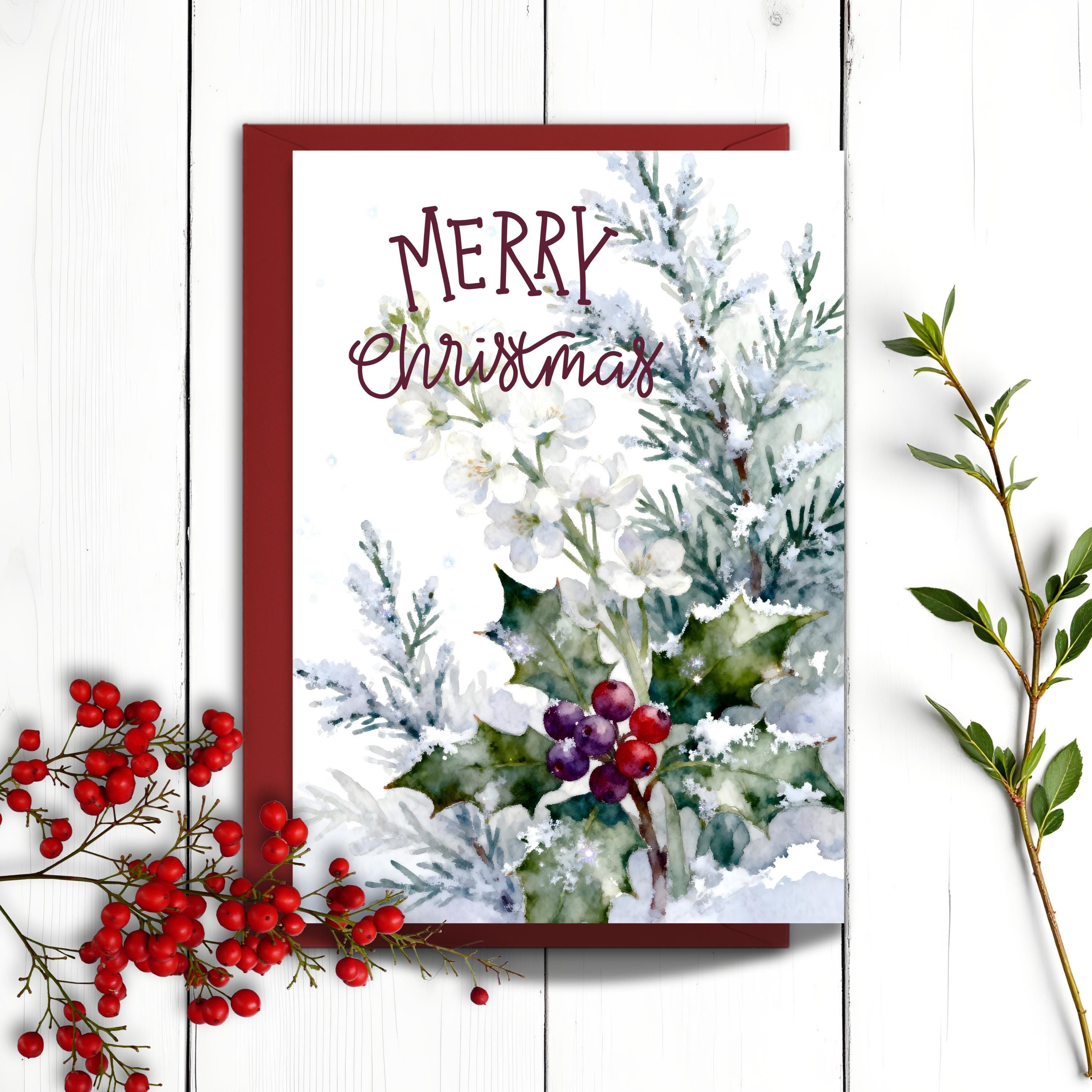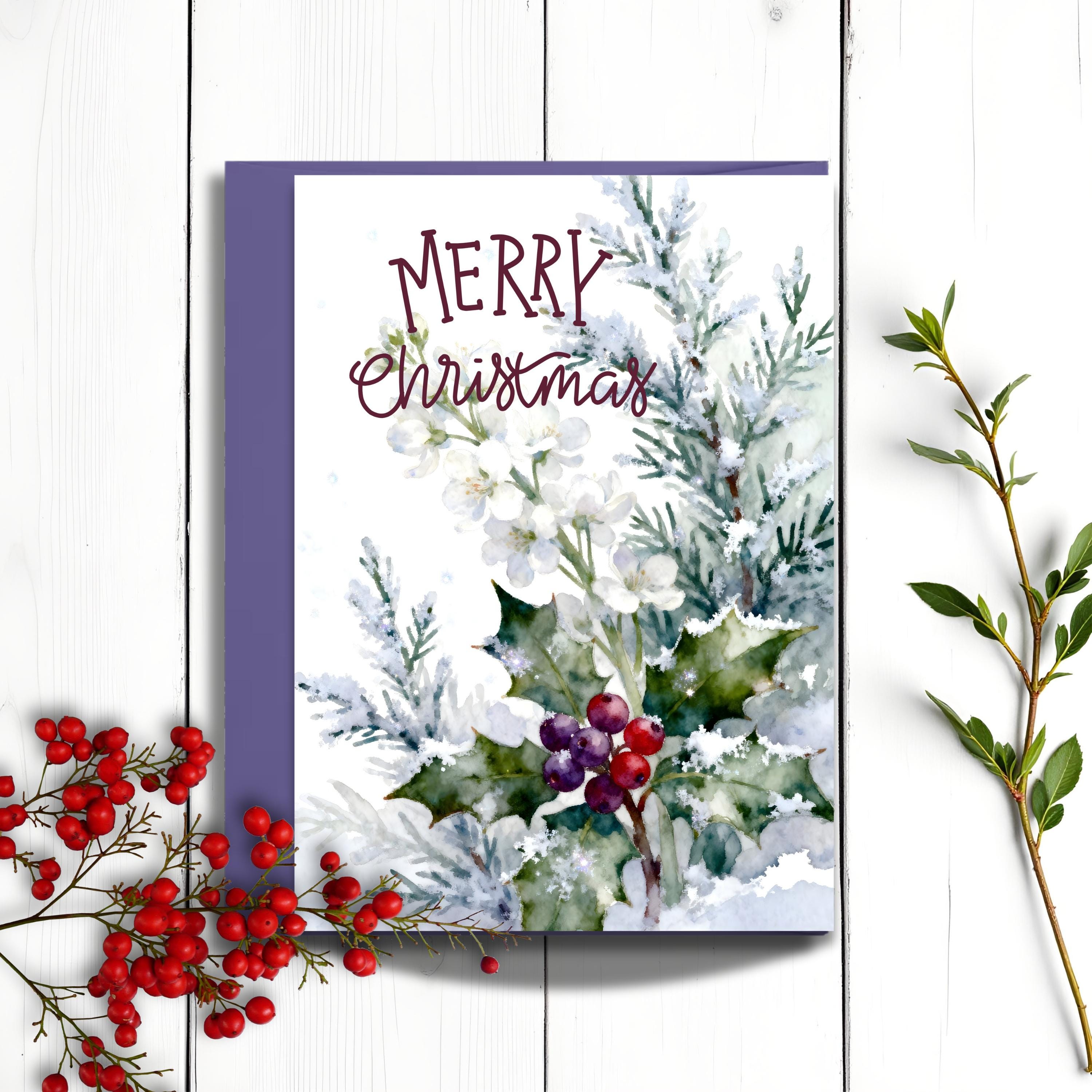 Bring the quiet beauty of winter to your correspondence with this softly painted holiday card featuring snow-dusted lily-of-the-valley and frosty winter berries. The delicate watercolor style and cool seasonal palette create a serene, elegant design perfect for Christmas, winter birthdays, thank-you notes, or seasonal greetings.