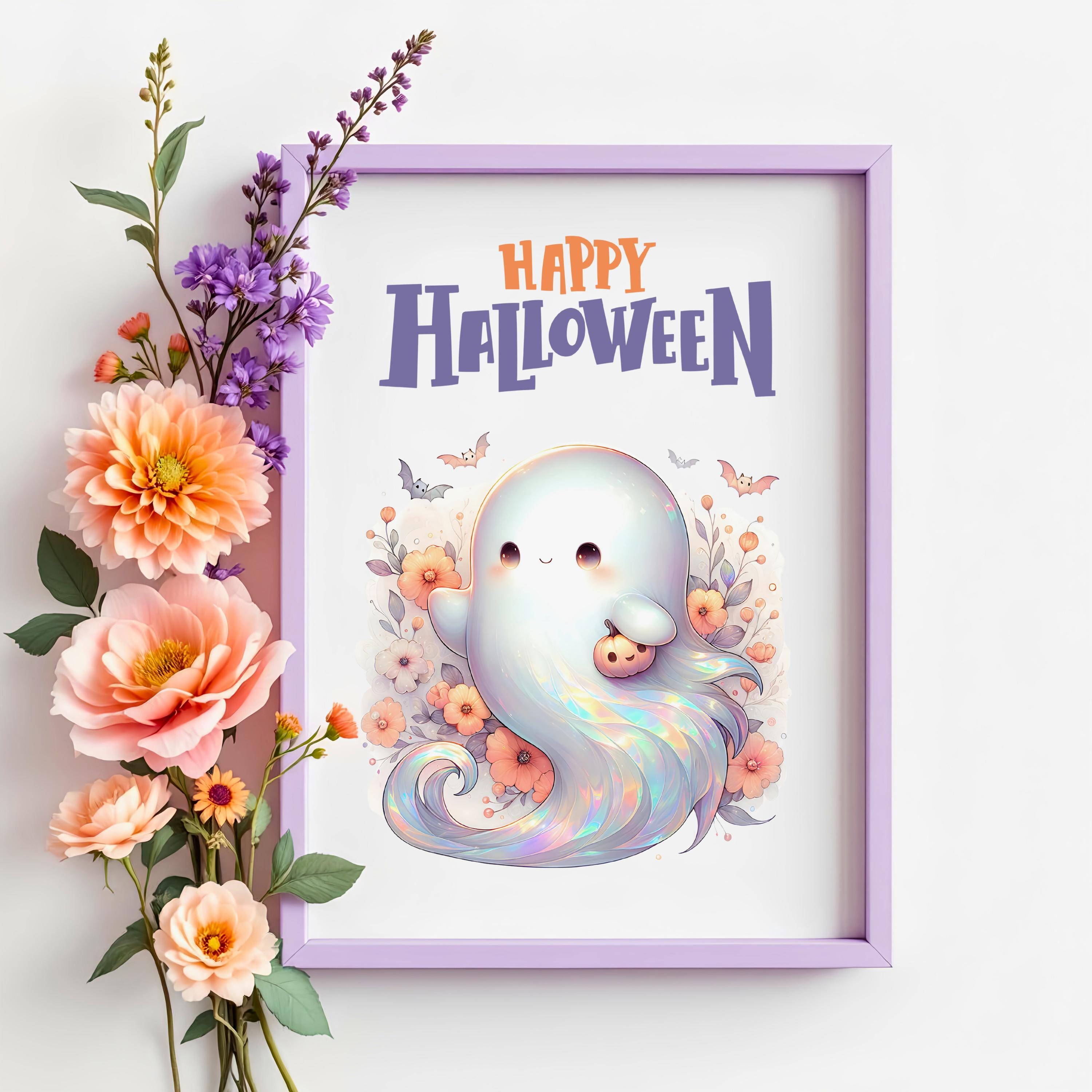 The iridescent trend is everywhere right now, bringing a soft shimmer and magical light-play to everything from fashion to home décor. Its pearlescent finish shifts color in different lighting, adding dimension without overwhelming a space, and works beautifully across styles — from modern to whimsical. In seasonal décor, iridescence transforms traditional themes into something dreamy and fresh, pairing especially well with pastels and soft neutrals. My Happy Halloween Iridescent Ghost Art Print captures this look perfectly, blending the playful spirit of Halloween with delicate florals and a luminous, color-shifting finish that feels both enchanting and unique.